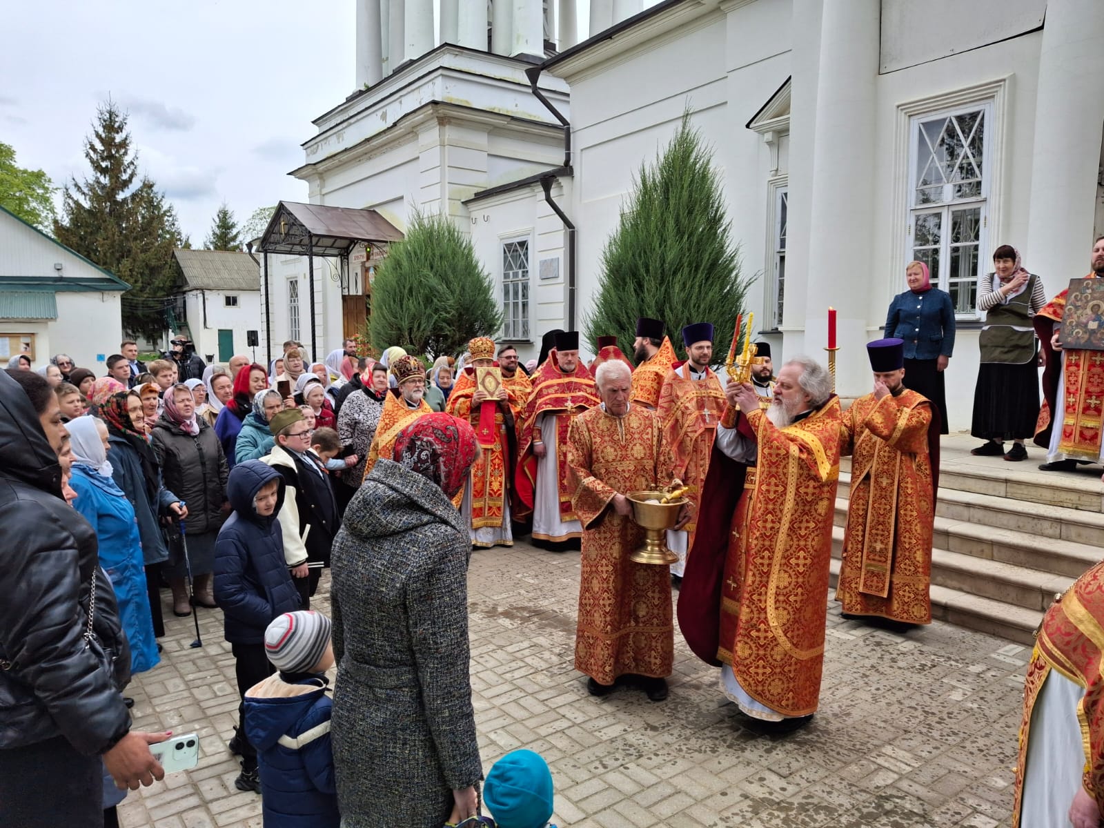 По окончании Литургии состоялся крестный ход, после чего отец Сергий обратился к собравшимся: «Мы даже не можем представить себе, как радовались богородчане 80 лет назад: праздник Пасхи, окончание войны, и открытие храма. Сугубая триединая радость обуревала тогда сердца верующих. И вот сегодня я вспоминаю тех прекрасных людей, что когда-то здесь жили: монахиню Клавдию, Некрасову Нину Михайловну, певчую, а потом регента правого клироса, монахиню Ефросинию. Они рассказывали о том, что, как только люди почувствовали потепление государства к Церкви, они сразу приняли решение идти в Тулу и просить разрешение на открытие храма. И случилось чудо – приход открыли. Люди приносили иконы, стали собираться певчие. И мы еще застали, когда они, будучи уже совершенно пожилыми людьми, пели на клиросе, имели свой репертуар, свои напевы, но самое главное – они горели любовью к Богу, любовью к храму. И вот сегодня, вспоминая это событие, мы молитвенно вспоминаем и всех тех людей, которые тогда участвовали в деле открытия храма».