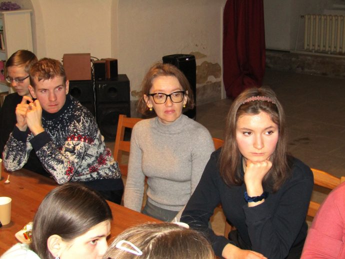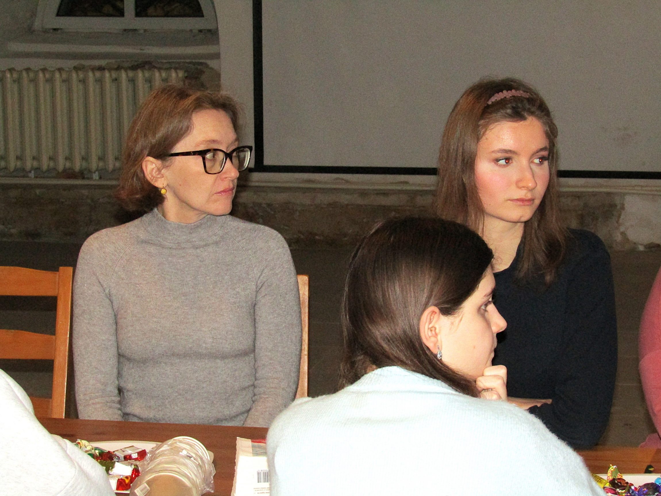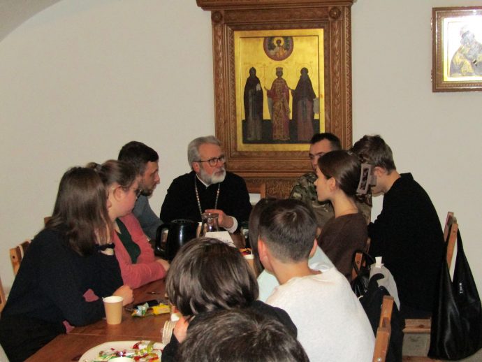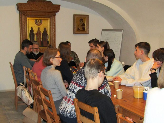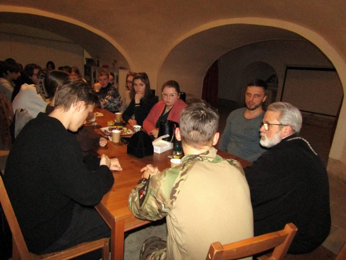 По традиции встреча началась с общей молитвы, после которой духовник православной молодежи отец Сергий представил гостя: «Дмитрия и его семью мы знаем очень давно, они люди верующие – всегда ходили в наш храм. Когда наступал праздник Успения Пресвятой Богородицы, эта семья приходила и убирала плащаницу – такой был дар этого семейства нашему храму, сначала Всехсвятскому, потом уже Успенскому. Поэтому и Диму мы знаем очень хорошо. Дмитрий – патриот, который защищает сейчас наше Отечество и сегодня он нам расскажет о своем пути, думаю, всем нам будет очень интересно с ним пообщаться».