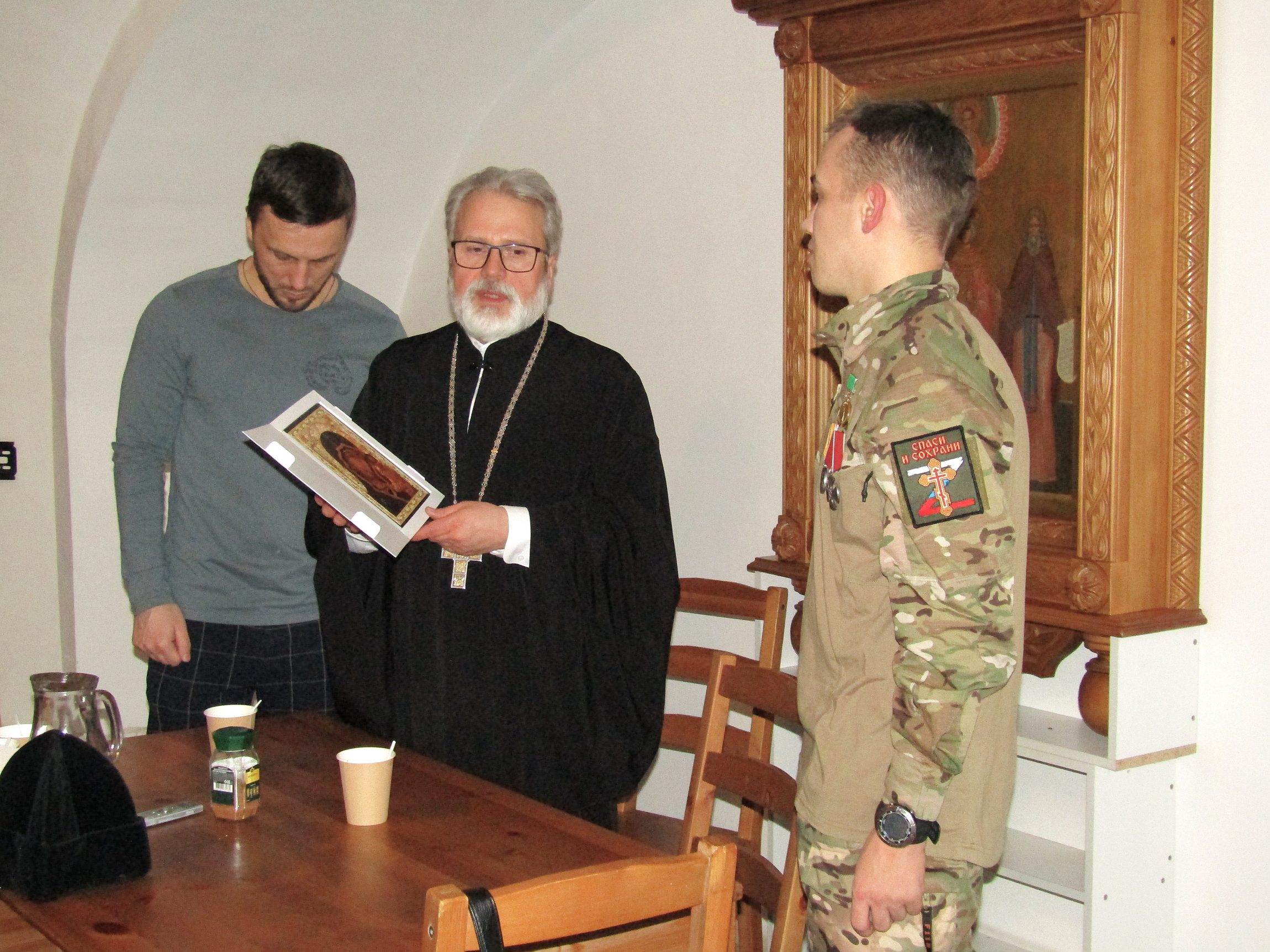 Вместе с добровольцами воина Дмитрия встречали духовник Молодежного добровольческого центра протоиерей Сергий Резухин и руководитель Центра диакон Владимир Мартынов.
