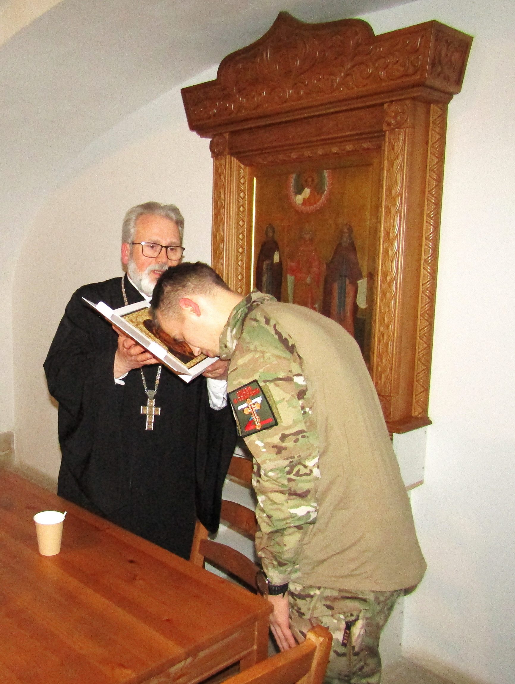 В завершение встречи духовник Молодежного добровольческого центра протоиерей Сергий Резухин преподнес в дар гостю Казанскую икону Божией Матери и, благословляя героя на дальнейшее воинское служение, пожелал ему помощи Пресвятой Богородицы: «Почему вручаем Казанскую икону? Она одна из самых почитаемых на Руси. Ты с детства молился этому образу Богородицы во Всехсвятском соборе. С ним связано многое в нашем Отечестве. Мы просим тебя принять этот образ. Пусть Пресвятая Богородица хранит тебя».