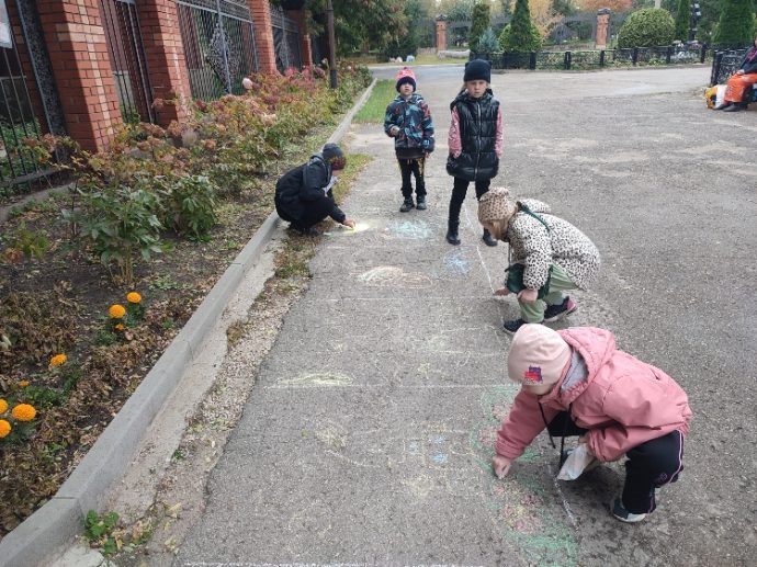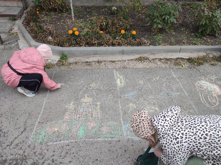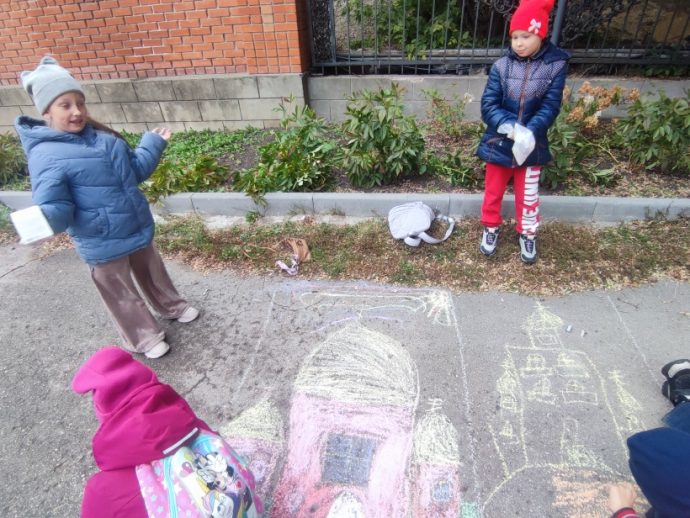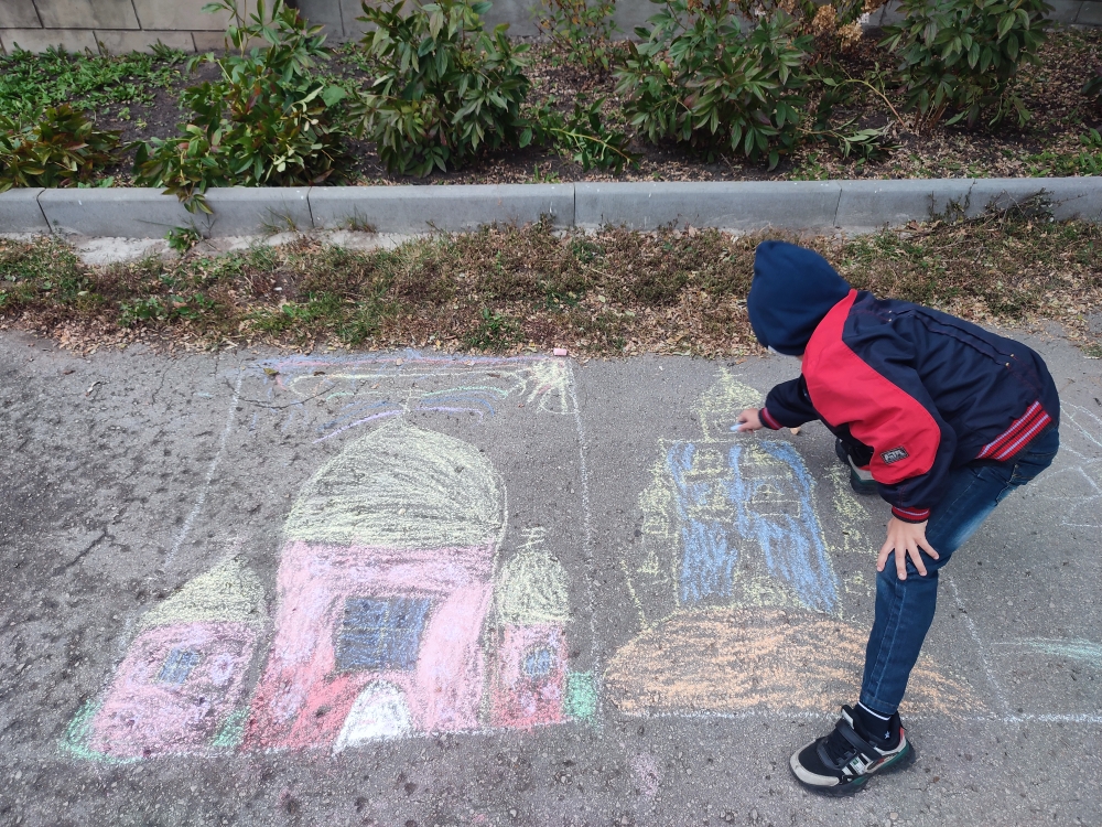 Воспитанник воскресной школы Вячеслав рассказал: «Я рисовал наш Сергиевский храм, раскрасил его оранжевым мелком, под цвет кирпичей. Кресты и купола нарисовал золотыми. Мне понравилось, я выбрал такое место, из которого хорошо видно храм и можно его легко повторить».