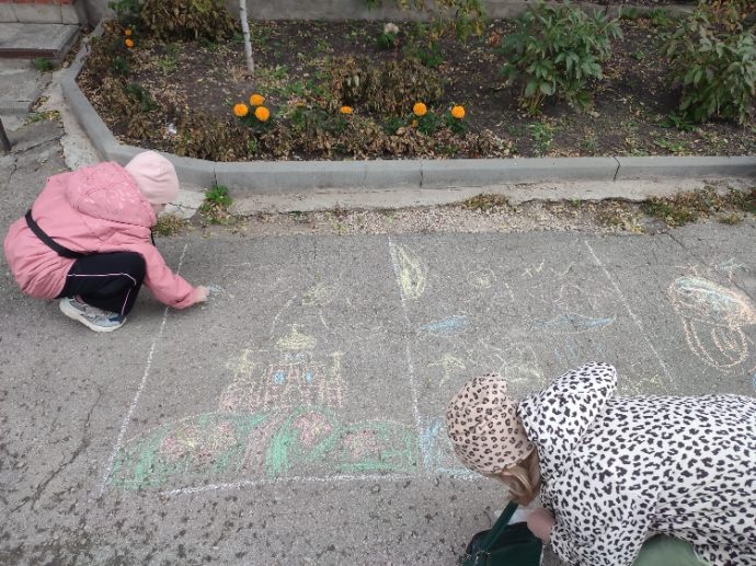 Подруги Анастасия, Алиса и Елизавета рассказали, что соединили в едином рисунке идеи всех троих: «Одна из нас хотела рисовать небо и ангела, другая — радугу и солнце, я хотела храм. Мы не стали разлучаться и рисовать в разных квадратах, а соединили все идеи в один рисунок».