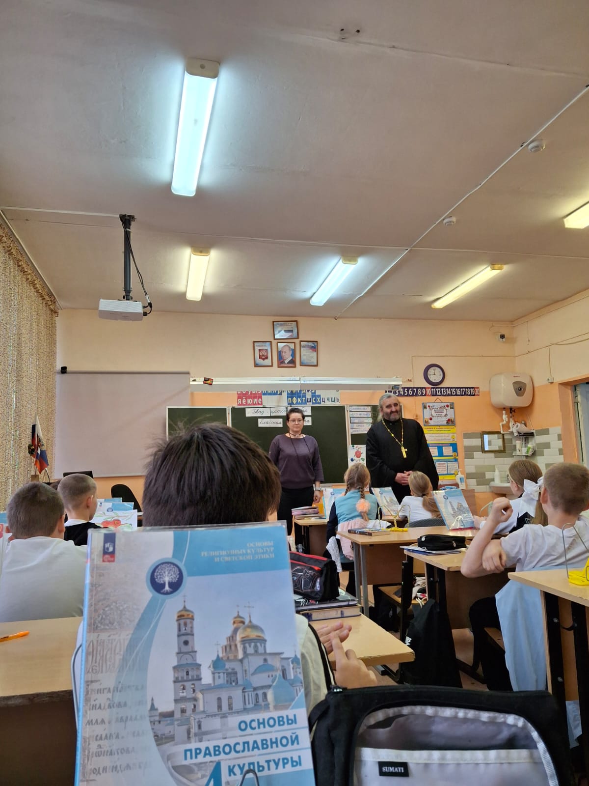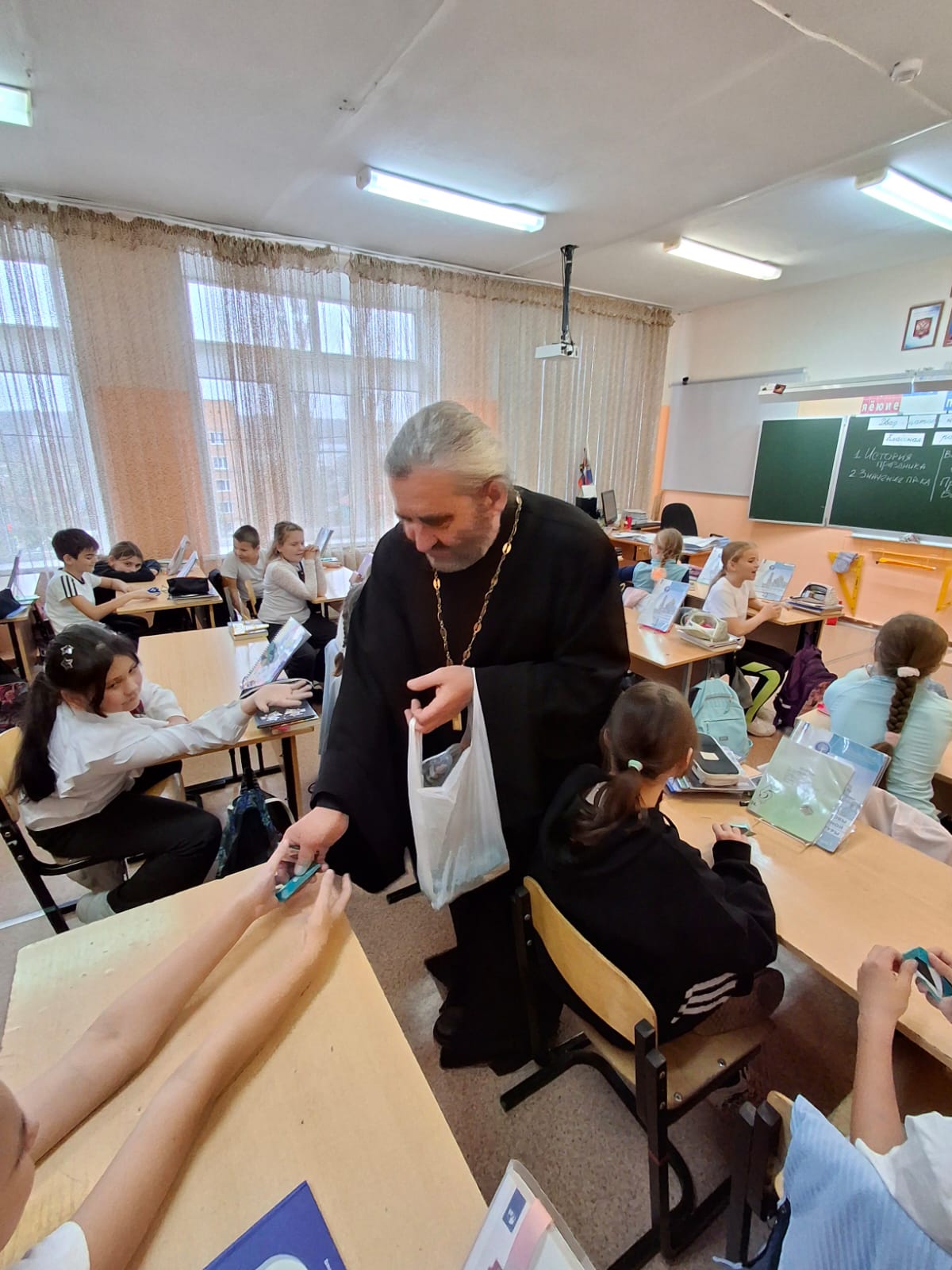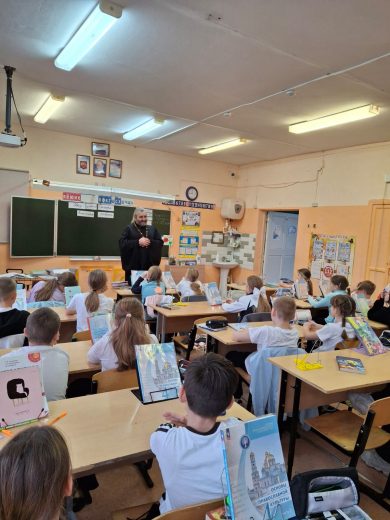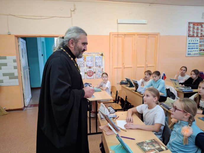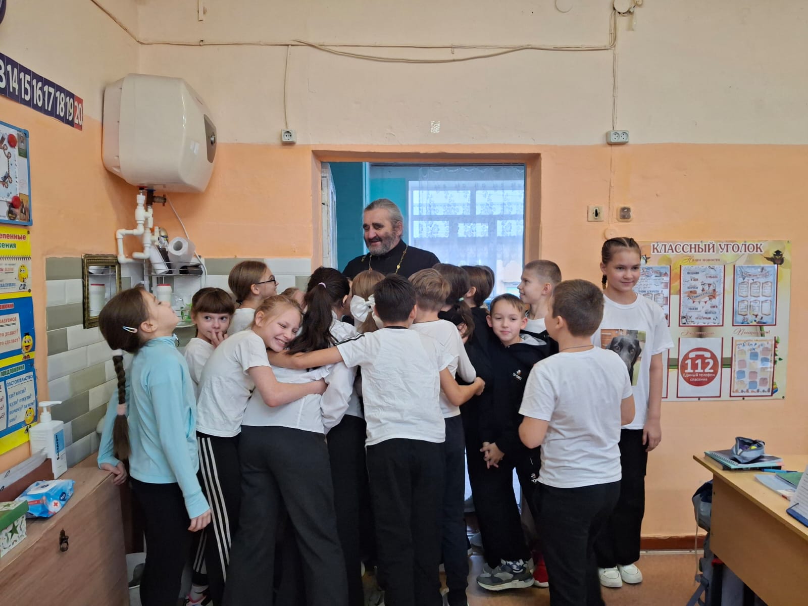 В преддверии праздника Собора Архистратига Михаила настоятель храма святителя Луки Крымского поселка Восточный иерей Виталий Хлустиков провёл беседу с учащимися 4б класса МКОУ «Средняя школа №9» города Ефремова о церковных праздниках и их значении.
