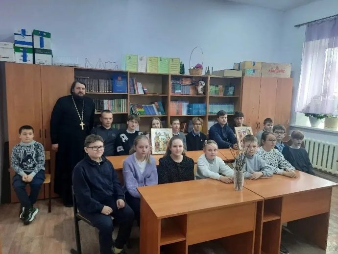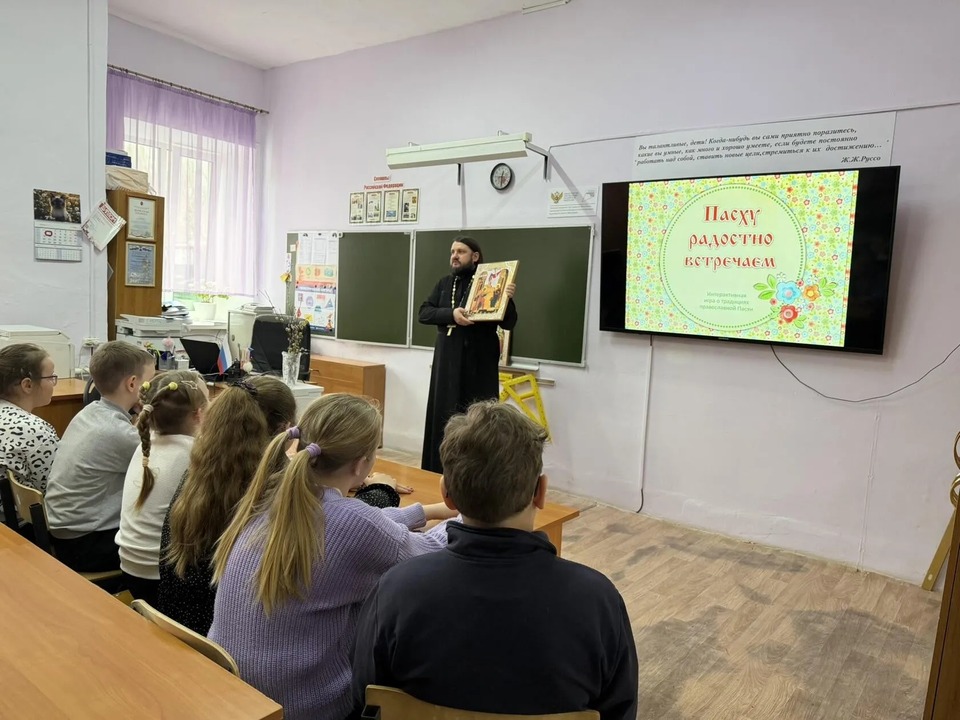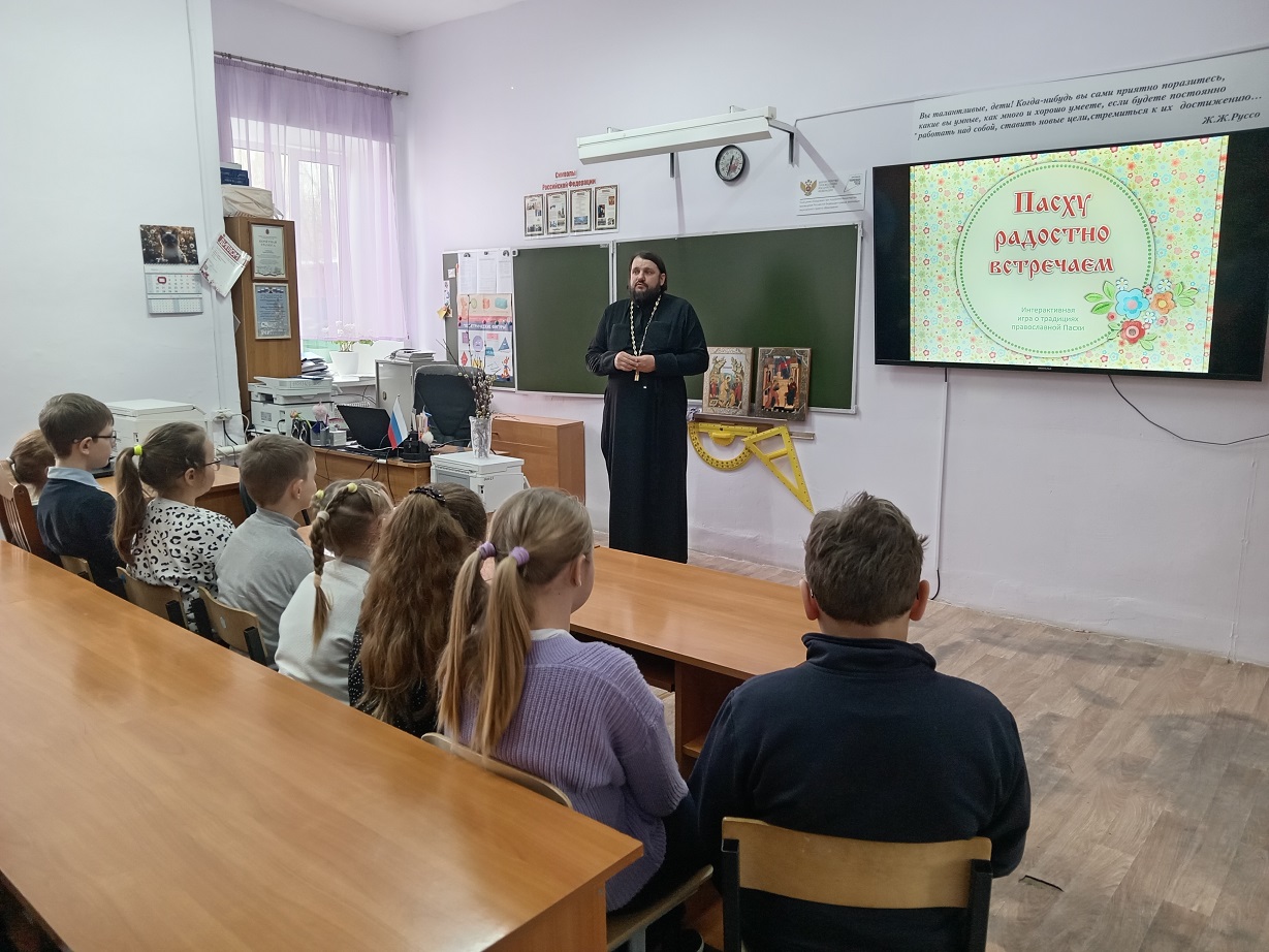 Иерей Георгий Протопопов рассказал учащимся о каждом дне Страстной седмицы, о празднике Благовещения Пресвятой Богородицы и Пасхе.