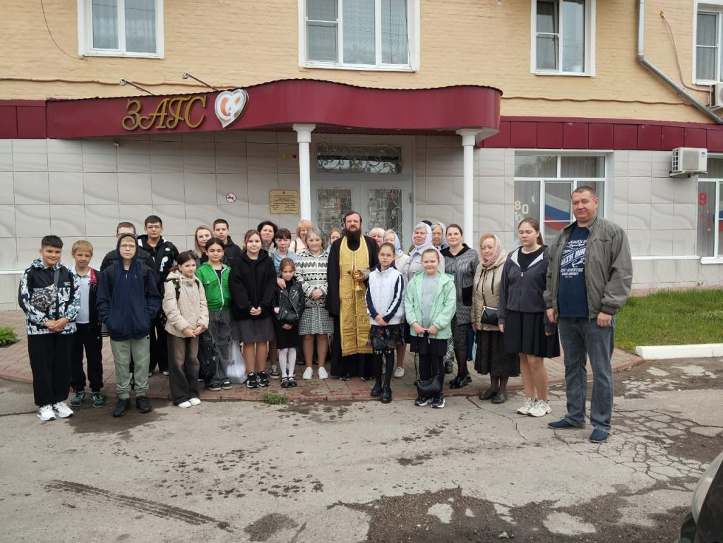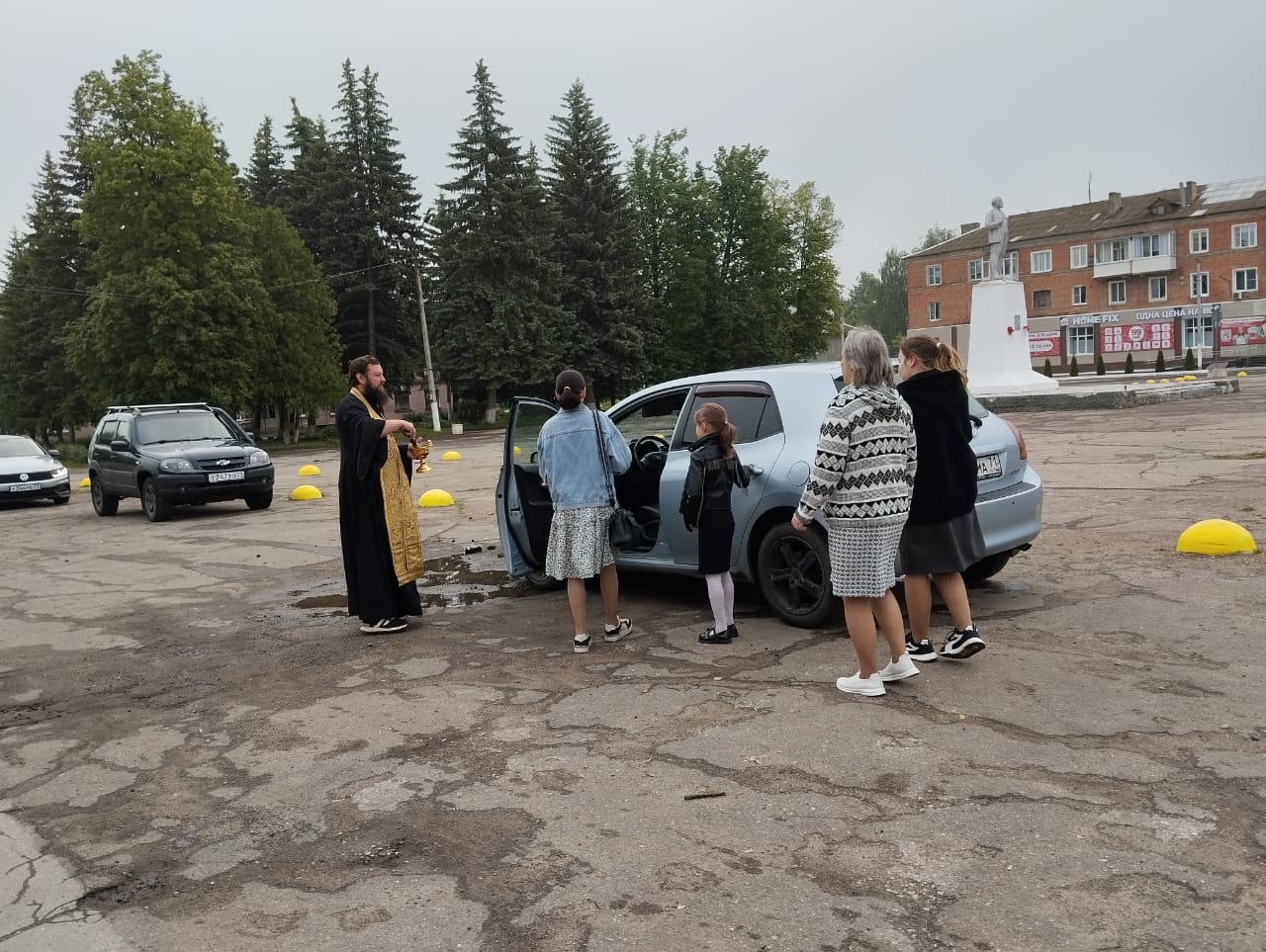 Перед отправлением из Кимовска благословить ребят и их родителей на добрую дорогу приехал клирик храма в честь иконы Божией Матери «Утоли моя печали», преподаватель и духовник приходской школы иерей Алексий Зенин. К сожалению, священник, занятый церковными послушаниями, не смог сопровождать паломников, но совершил краткий молебен о путешествующих и окропил путников святой водой.
