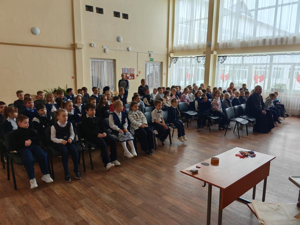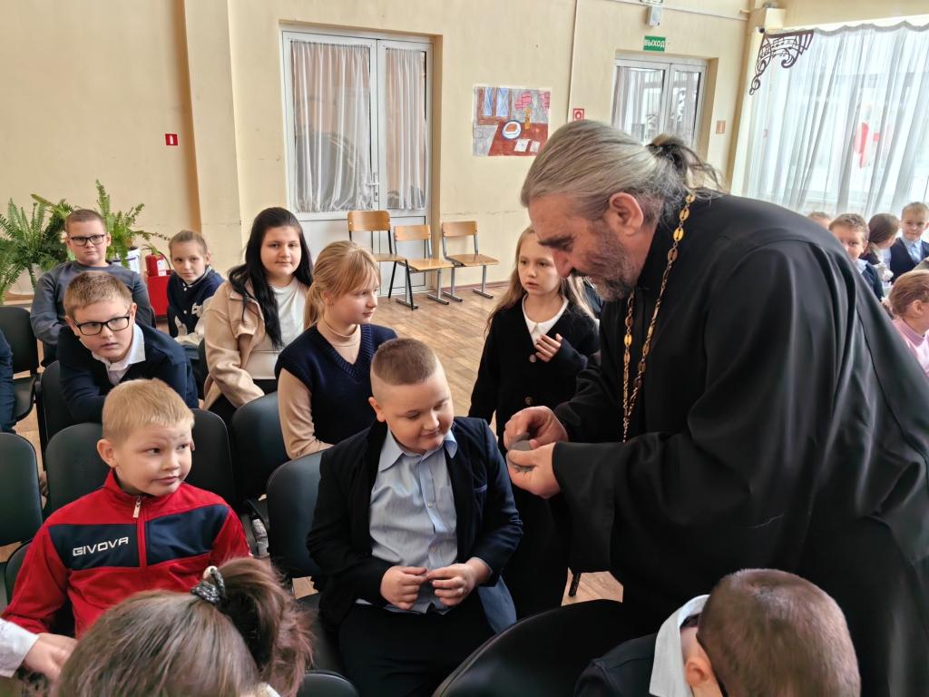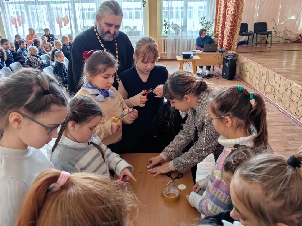 На мероприятии собрались ученики начальных классов вместе с их классными руководителями. В качестве гостя был приглашен настоятель храма святителя Луки Крымского поселка Восточный иерей Виталий Хлустиков.