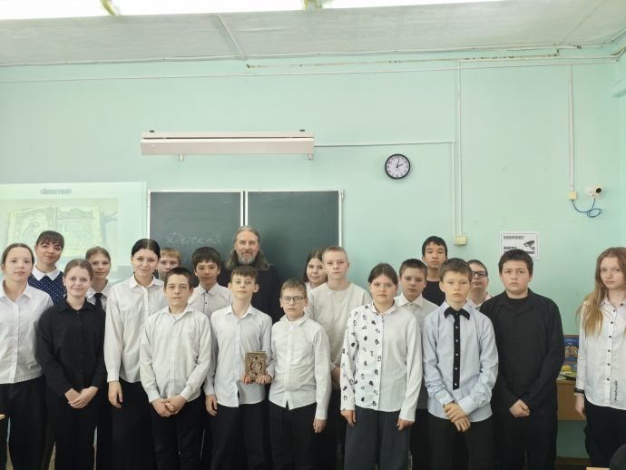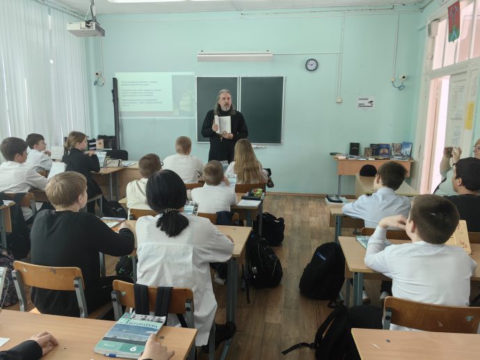 В 6 классе средней общеобразовательной школы №19 города Новомосковска прошёл необычный урок: парты на время превратились в читальный зал, место у доски – книжную выставку, а вместо учительского голоса прозвучало слово священника. Тема встречи «Буква добра» оказалась ключом к разговору о самом главном: что делает книгу не просто источником информации, а настоящим учителем жизни.