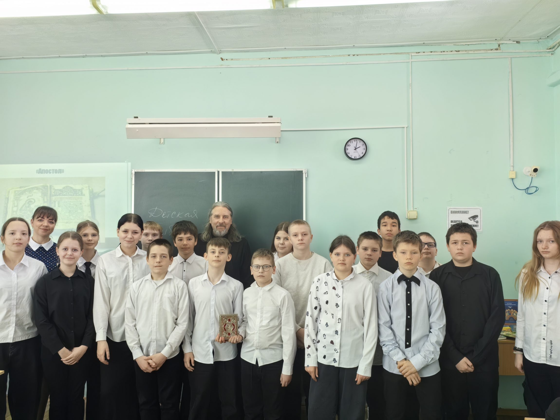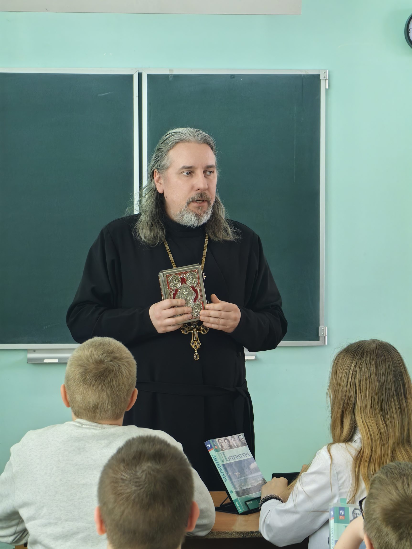 На урок был приглашён настоятель Спасского храма села Спасское протоиерей Николай Пицин. Для многих ребят это была первая встреча со священником. Отец Николай пришёл с Евангелием в металлическом переплёте.