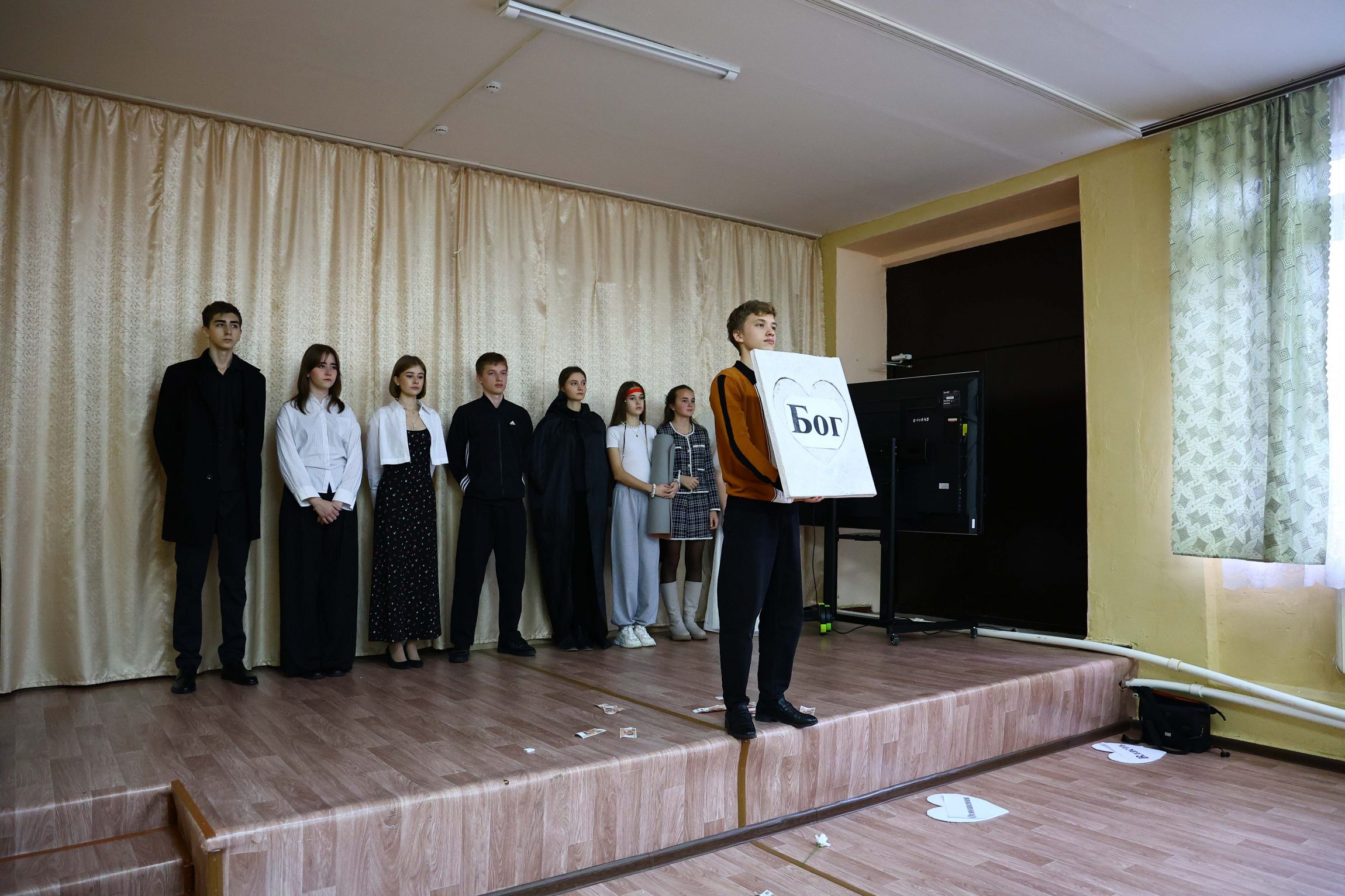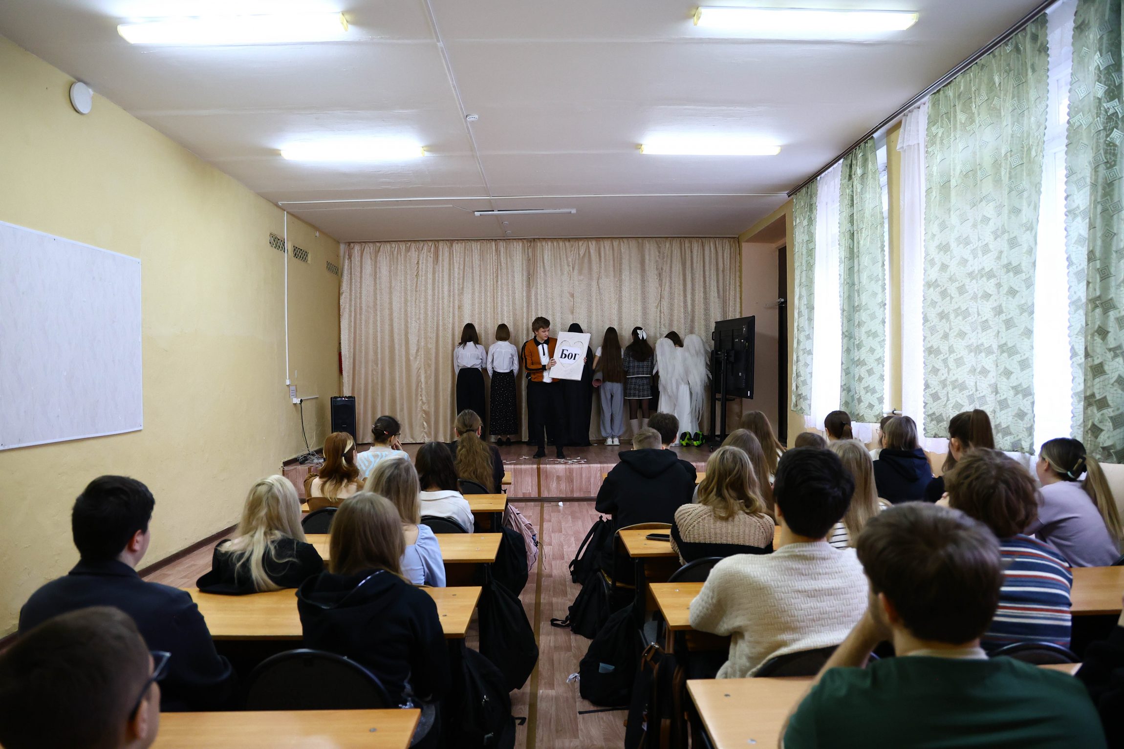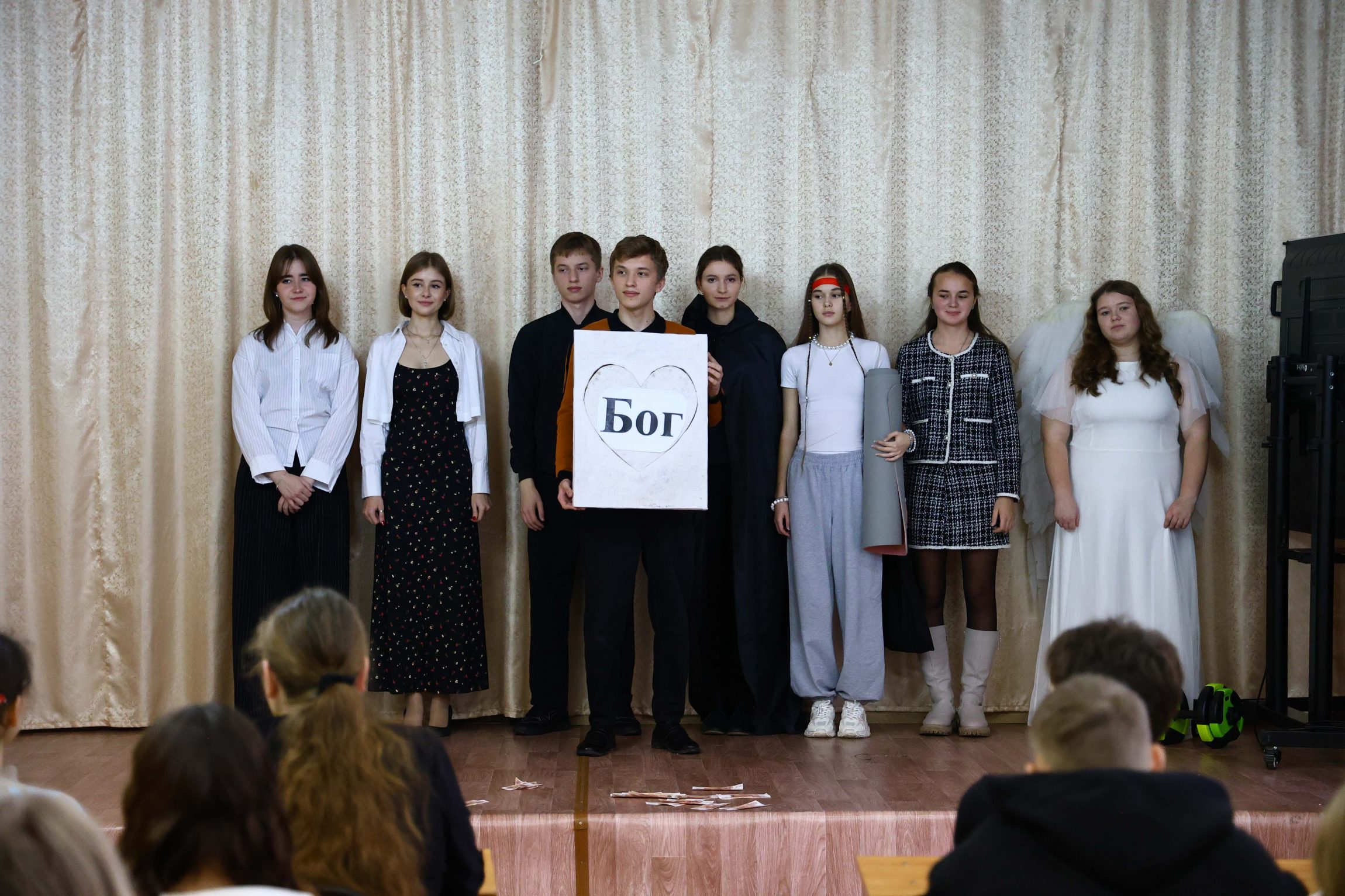 Зрителями стали учащиеся 10-11 классов гимназии: они внимательно и серьезно восприняли спектакль добровольцев. Постановка, посвященная нравственным законам жизни и поиску ее смысла, вызвала живой отклик в сердцах юных зрителей, заставив их задуматься над вечным вопросом: «Что в сердце твоем, человек?».
