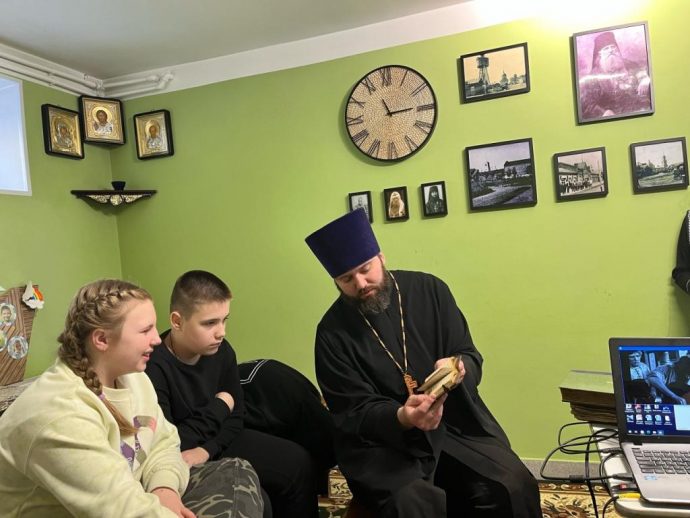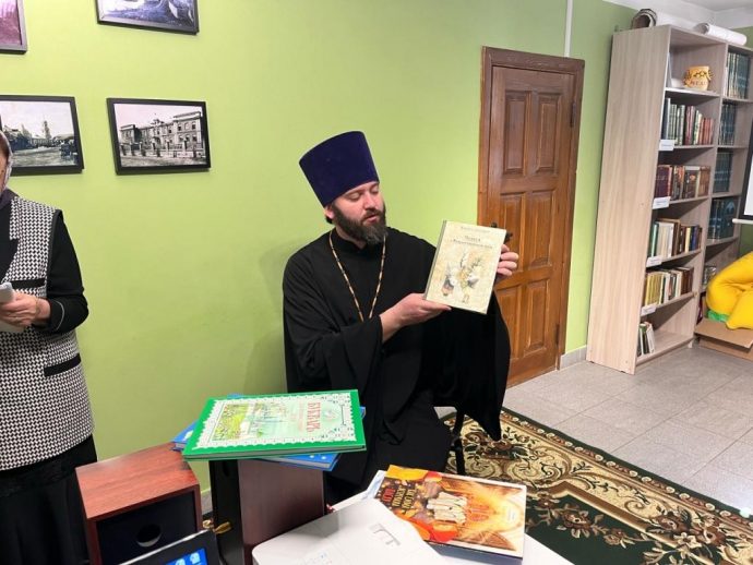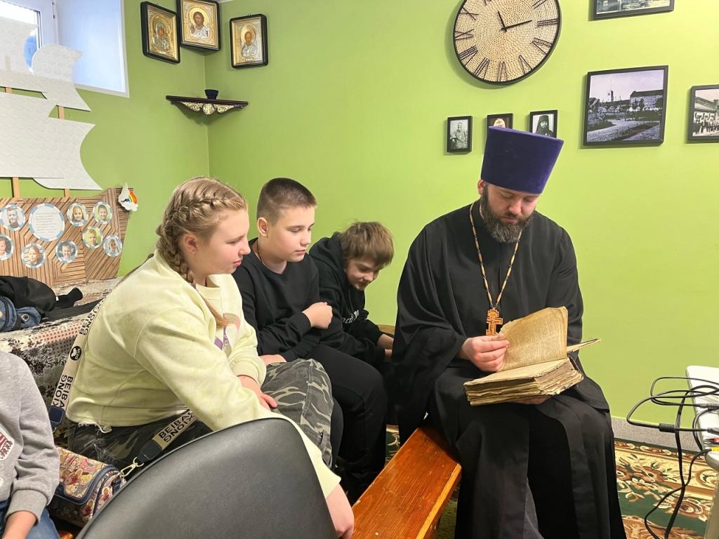 Настоятель Никольского храма иерей Иоанн Колонтаев показал ребятам старинные книги, хранящиеся в приходской библиотеке: Библию, Новый Завет, написанную от руки Псалтирь. Ребята рассматривали страницы древних изданий, изучали особенности церковнославянского шрифта и пытались читать на нем.