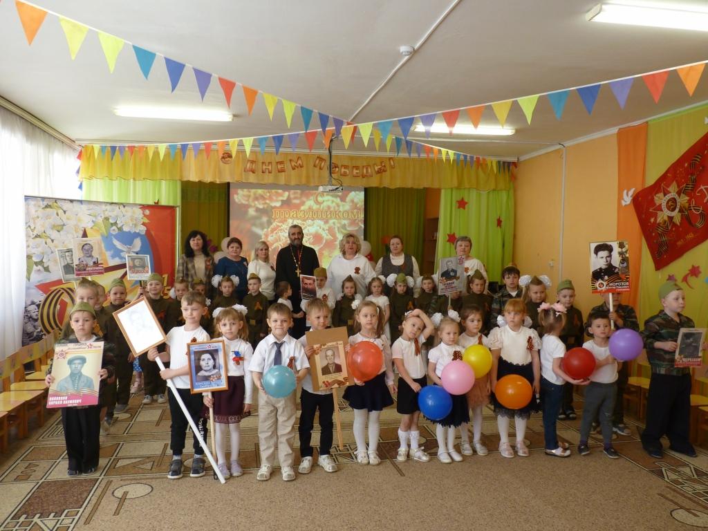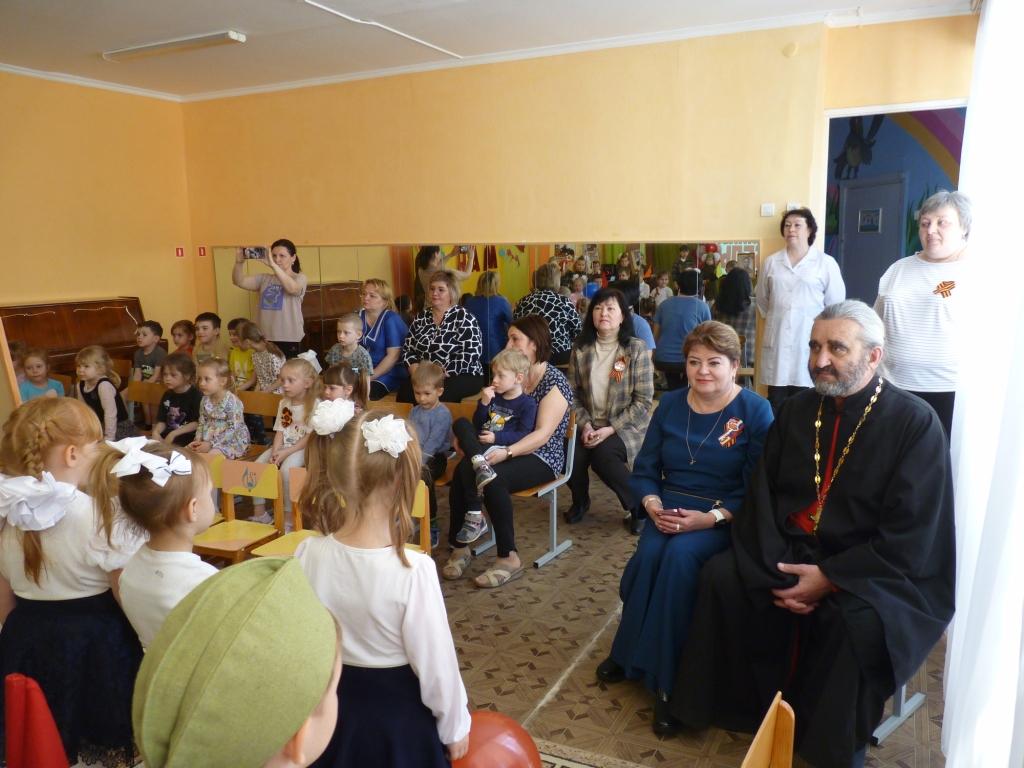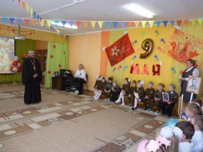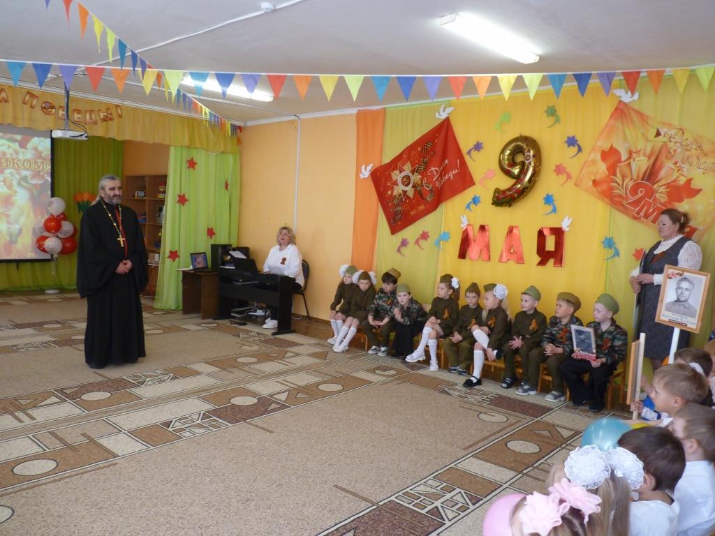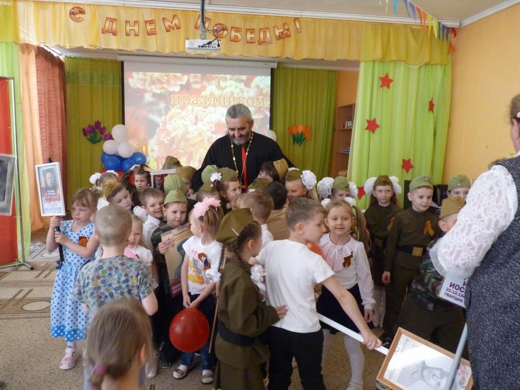 В преддверии празднования 80–й годовщины со Дня Победы в дошкольном подразделении МКОУ «СШ №10» города Ефремова прошел праздничный утренник, посвящённый этой памятной дате, на который был приглашен настоятель храма святителя Луки Крымского поселка Восточный иерей Виталий Хлустиков.