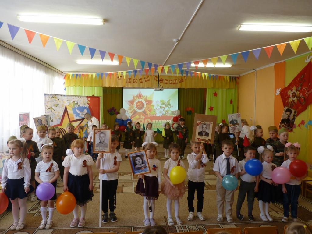 Празднование началось с торжественного шествия под звуки патриотической музыки воспитанников детсада, которые маршировали с портретами своих прадедов, прабабушек, создав особую атмосферу памяти и уважения Бессмертному полку. Программа мероприятия была очень насыщенной и разнообразной. В утреннике приняли участие дошкольники средней, старшей и подготовительной групп.