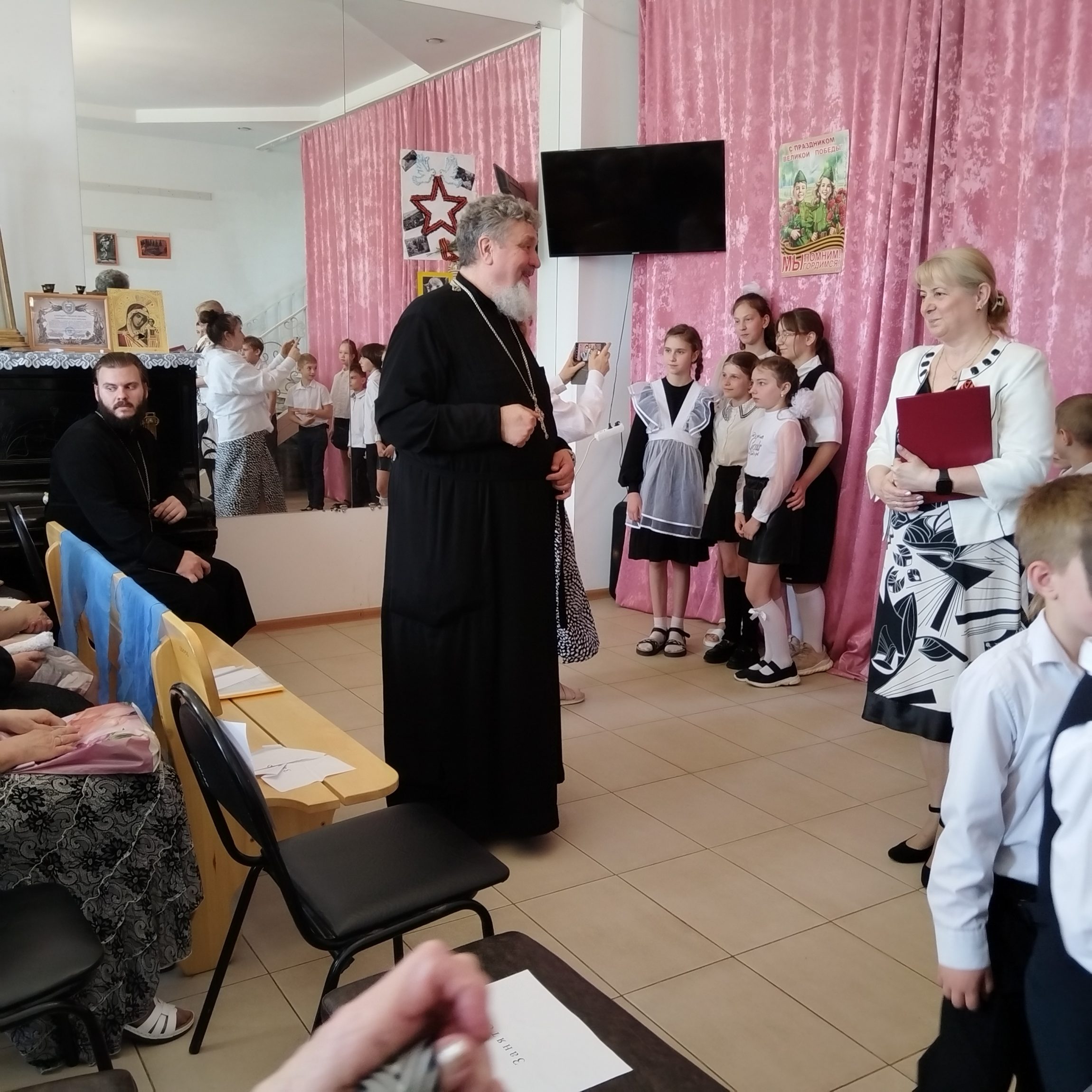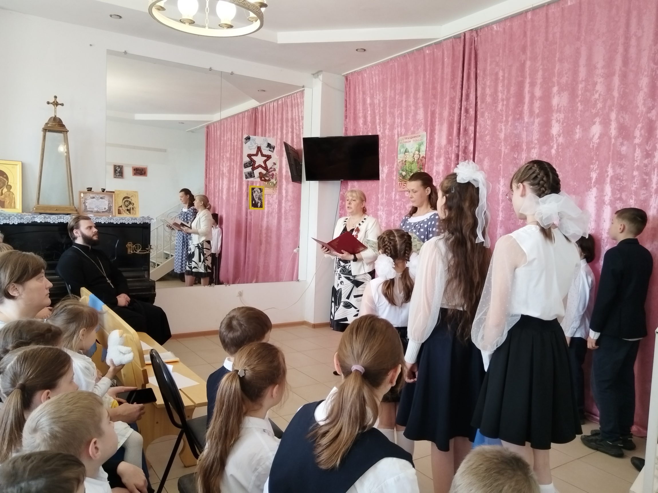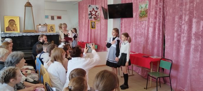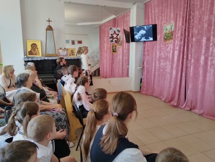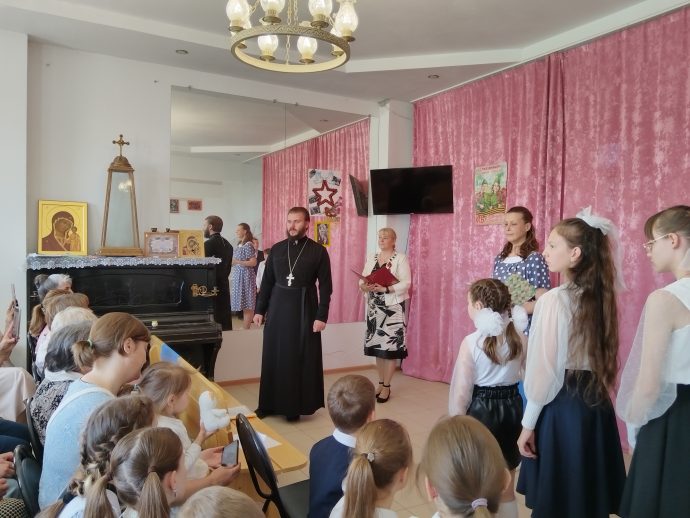 Духовник воскресной школы иерей Евгений Широков поздравил всех собравшихся с праздником: «Дорогие гости, спасибо, что пришли на концерт, посвящённый 80-й годовщине Победы в Великой Отечественной войне, который подготовили для вас наши преподаватели и ваши дети. Поздравляю вас с днём Великой Победы, днём гражданской Пасхи для нашего русского народа: днём победы жизни над смертью. Давайте все вместе почтим память воинов, положивших жизни на алтарь Великой Победы».