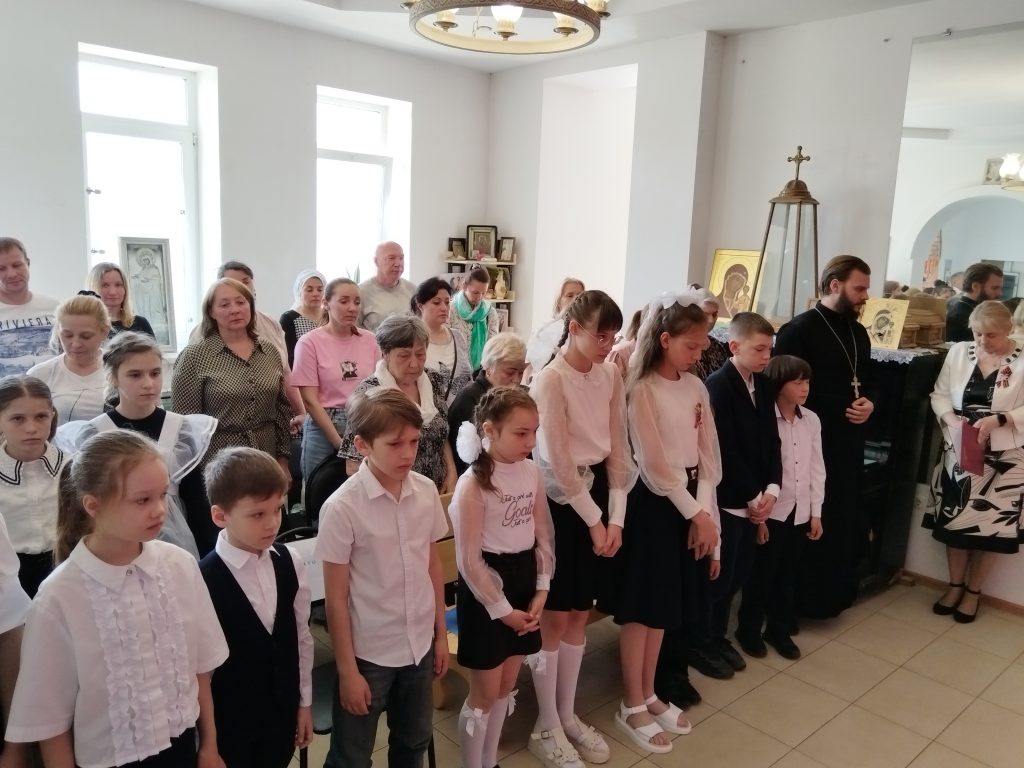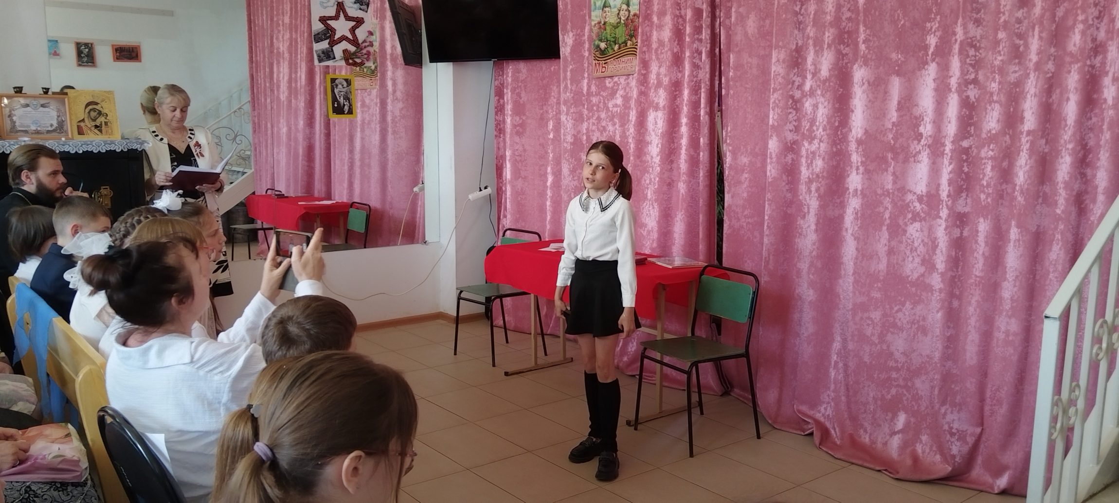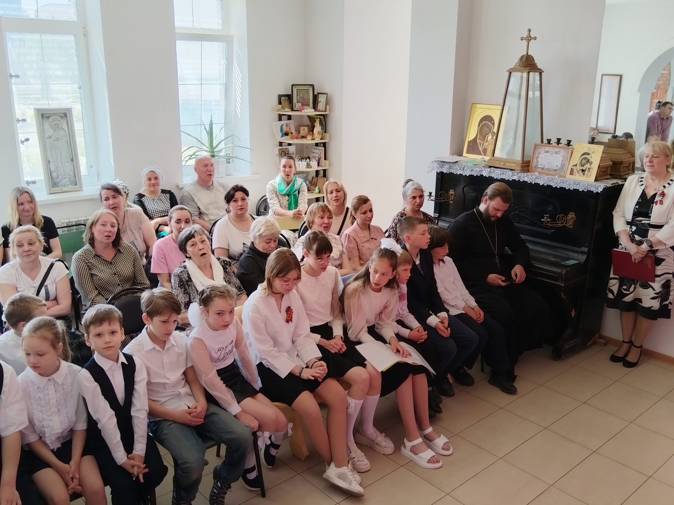 Духовник воскресной школы иерей Евгений Широков поздравил всех собравшихся с праздником: «Дорогие гости, спасибо, что пришли на концерт, посвящённый 80-й годовщине Победы в Великой Отечественной войне, который подготовили для вас наши преподаватели и ваши дети. Поздравляю вас с днём Великой Победы, днём гражданской Пасхи для нашего русского народа: днём победы жизни над смертью. Давайте все вместе почтим память воинов, положивших жизни на алтарь Великой Победы».