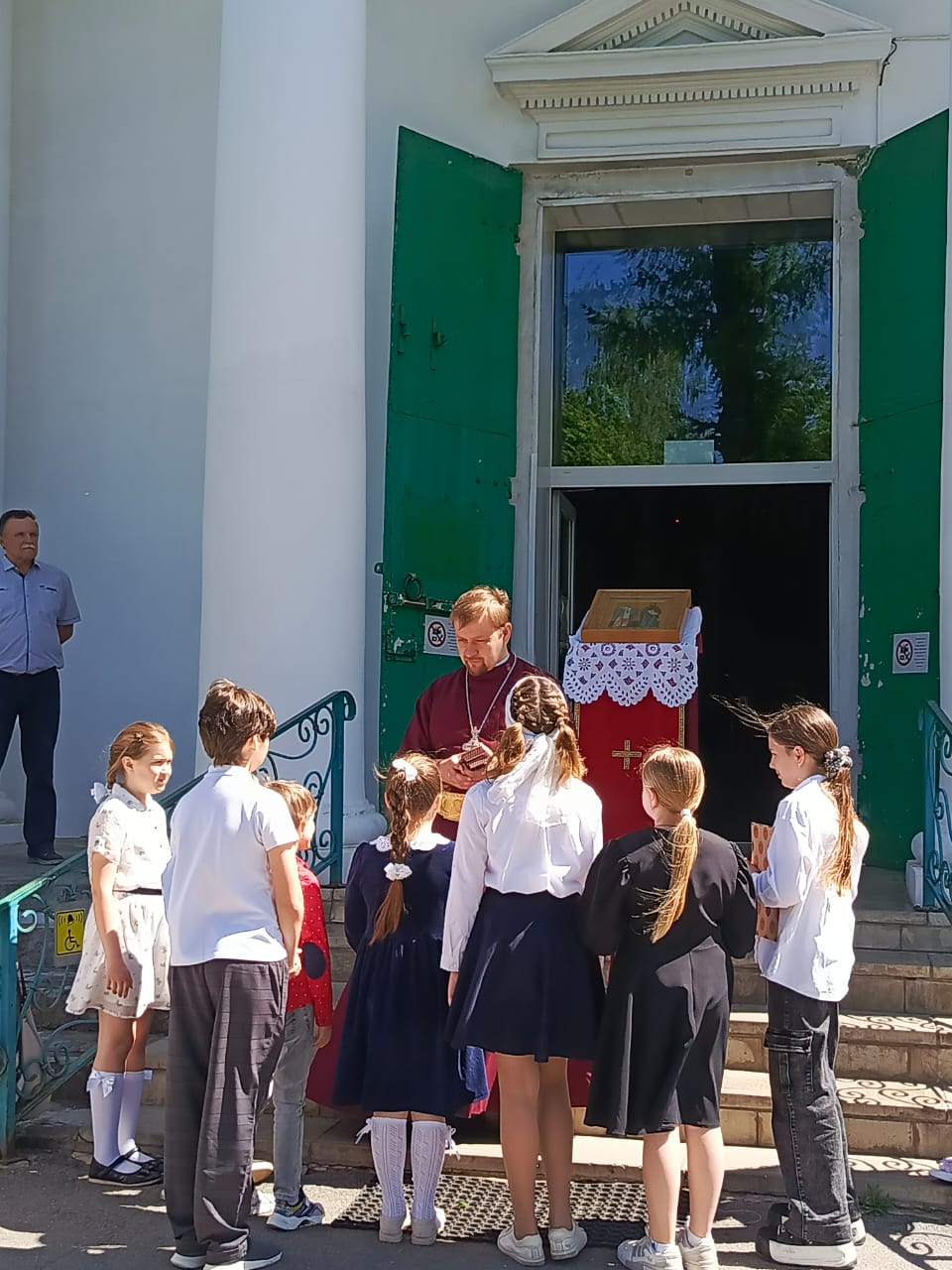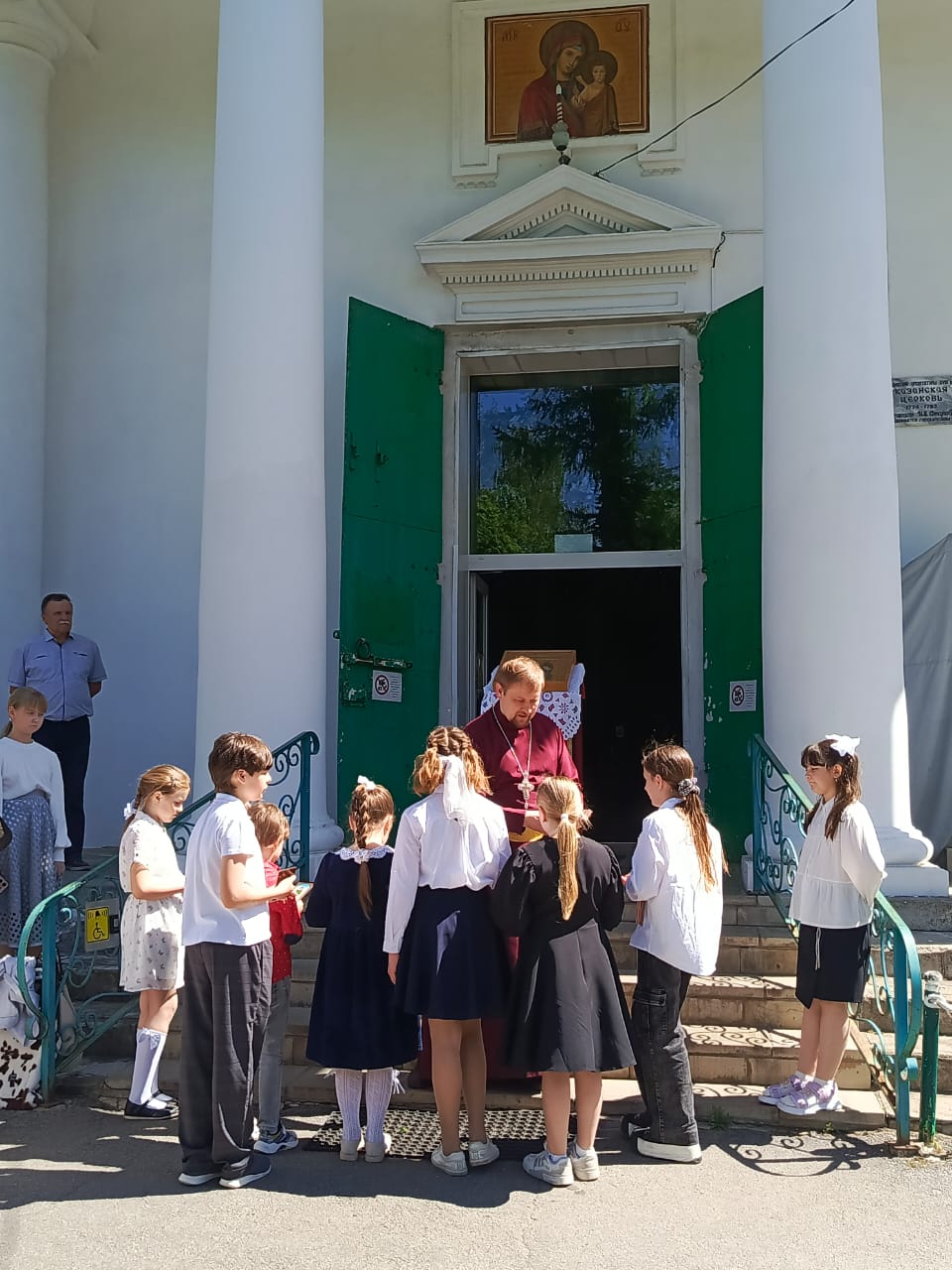 В заключение торжественного события протоиерей Сергий Гривас, преподаватель воскресной школы, благословил воспитанников приложиться к иконе святых Мефодия и Кирилла, подарил каждому икону Ангела Хранителя и напутствовал словами: «Дорогие дети и родители, сегодня, в день памяти святых, наш долг прославить их и с благодарностью сказать: «Слава вам, братья святые, славян просветители». Благодарим всех за участие в празднике.