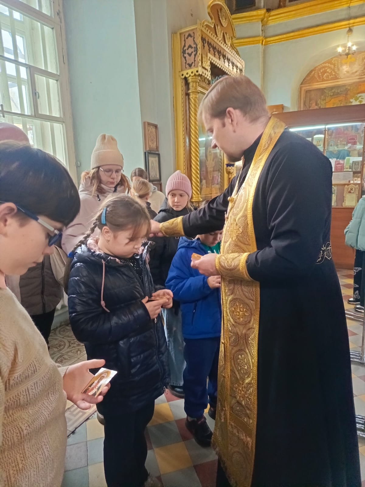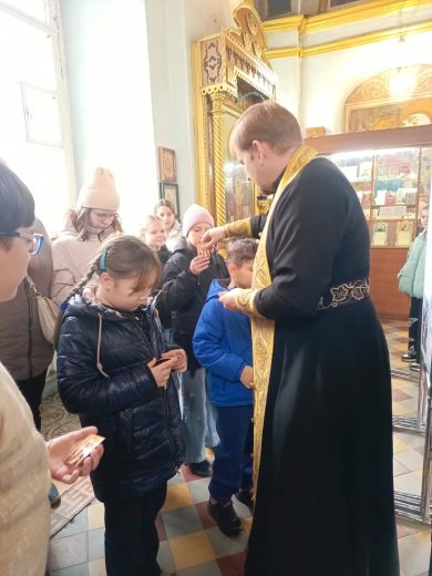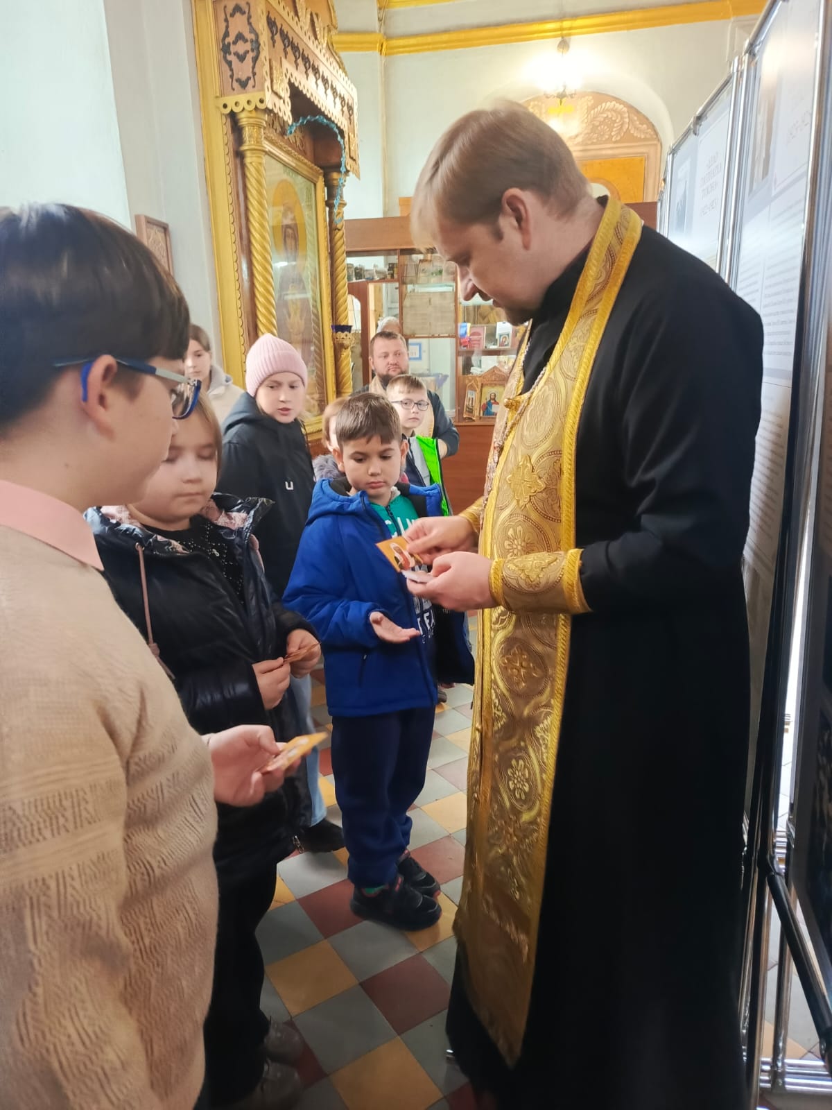 По окончании беседы преподаватель воскресной школы протоиерей Сергий Гривас раздал всем иконы святителя Тихона, Патриарха Московского и всея Руси.