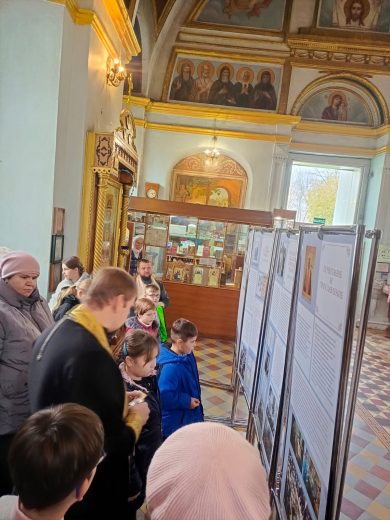 Первыми посетителями выставки, размещенной в стенах храма, стали воспитанники воскресной школы и их родители.