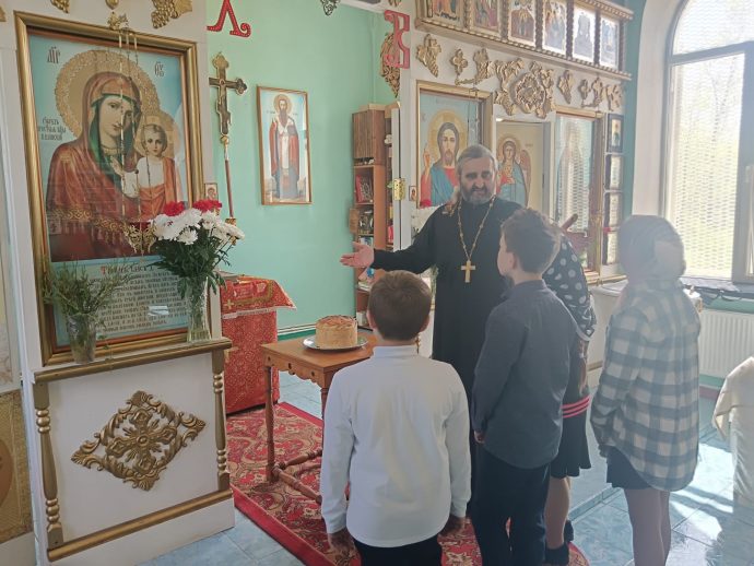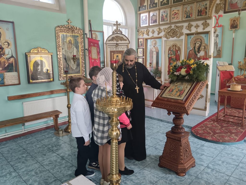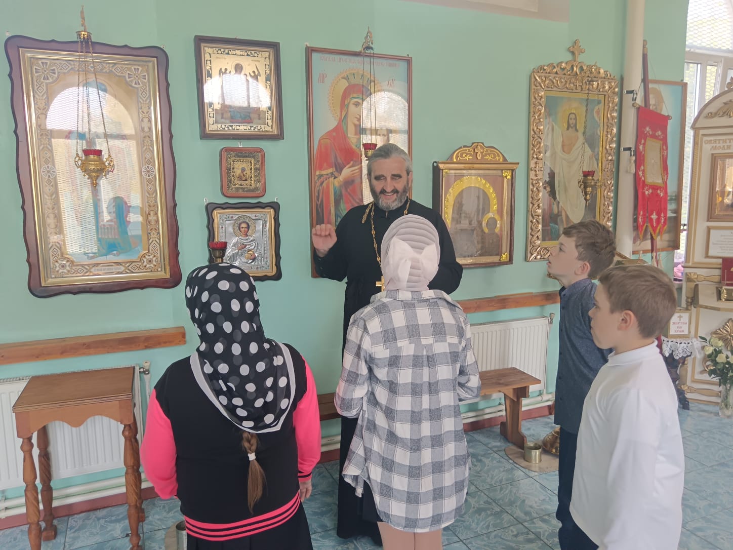 Настоятель храма иерей Виталий Хлустиков встретил и познакомил гостей с внутренним убранством храма, рассказал о празднике Светлого Христова Воскресения, о святынях и иконах. Ребята узнали, как важно приходить на службу в храм. Священник научил детей правильно креститься, ставить свечи.