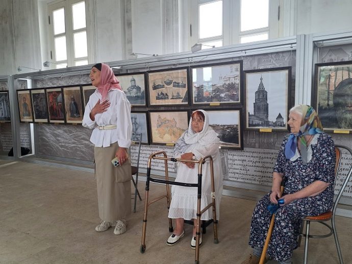 Насельницы Епифанского стационарного отделения для граждан пожилого возраста и инвалидов по типу дом-интернат вместе со специалистом отделения Людмилой Владимировной Яровой исполнили духовные канты «Слава Богу за все!» и «Радуйся, Святая Дева». Зоя Павловна Николаева, еще одна благополучательница дома-интерната, спела русскую народную песню «Как пойду я на быструю речку».