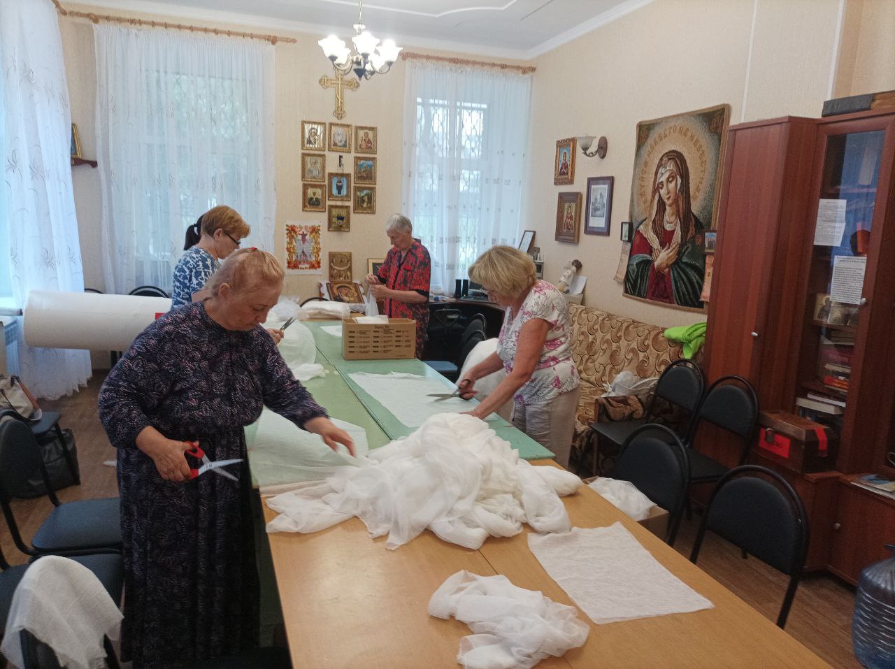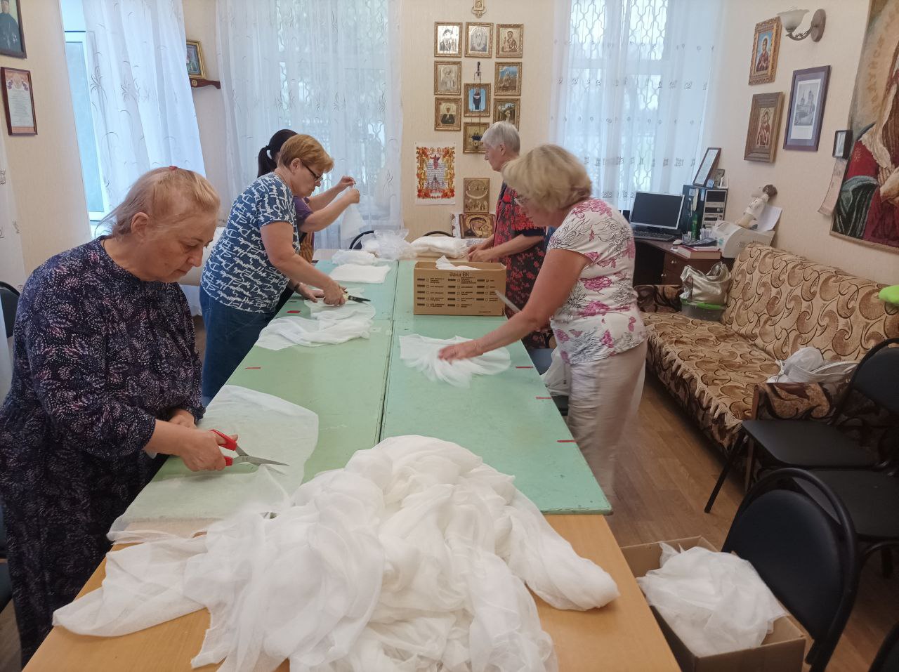 Отправляются из храма на передовую и хирургические салфетки для госпиталей. Их на приходе изготовили уже 55 000 штук и отправили в Курский госпиталь. Работа эта кропотливая, требующая аккуратности, беспрекословной гигиены и времени, но и с ней сестры справляются.