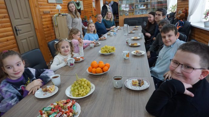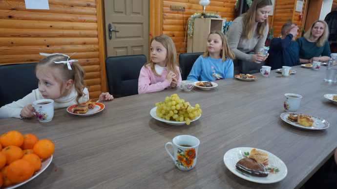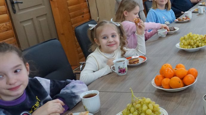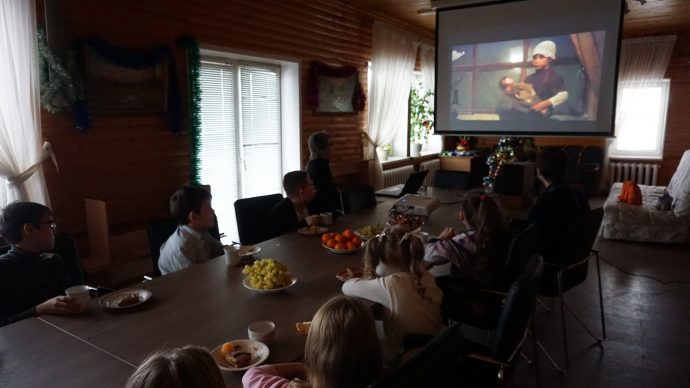Стол для совместного чаепития тоже накрывали все вместе, а потом смотрели детский православный фильм «Рождественская девочка», рассказывающий о любви ребенка к своей маме.