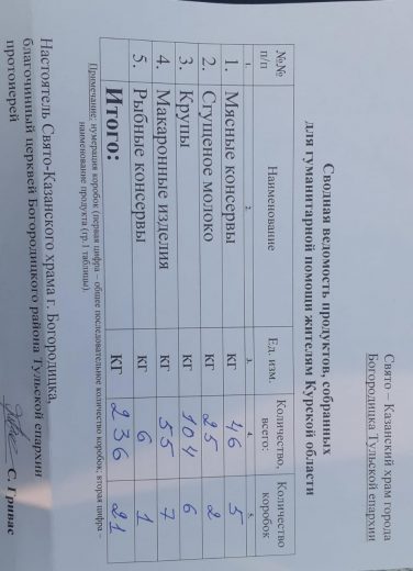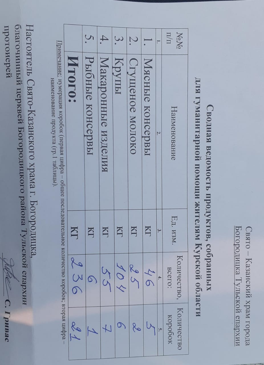Богородчане приняли активное участие в делах милосердия: 236 килограммов продуктов, в составе которых мясные и рыбные консервы, сгущенное молоко, крупы, макаронные изделия, упаковали и отправили в отдел по благотворительности и социальному служению Тульской епархии.