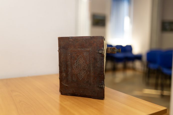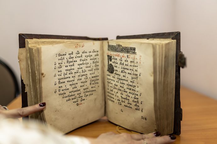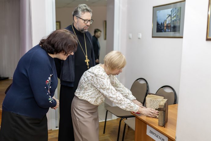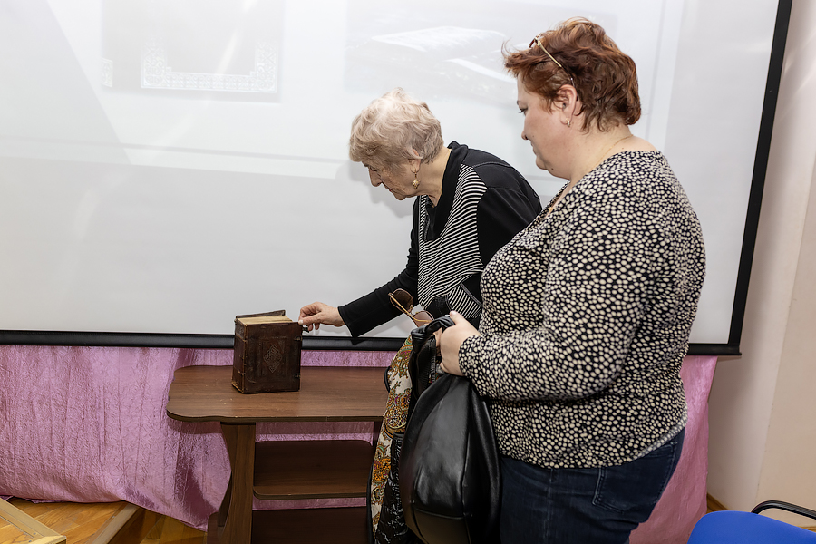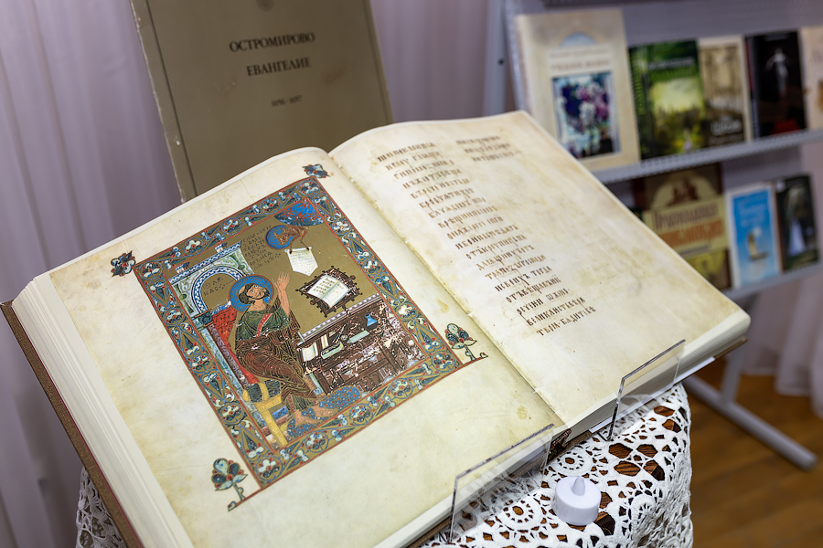 Затем участники встречи вспомнили, что чтение книг возможно благодаря святым братьям Кириллу и Мефодию. Именно из Византии и Болгарии приходили на Русь славянские книги, а первые библиотеки находились в храмах и монастырях. В новомосковской библиотеке хранится точная копия Остромирова Евангелия, написанного диаконом Григорием в 1056-1057 годах. Издание преподнес в дар первый настоятель Свято-Успенского монастыря Новомосковска архимандрит Лавр. Гости встречи получили возможность ближе познакомиться с этой книгой.