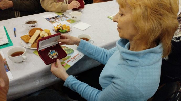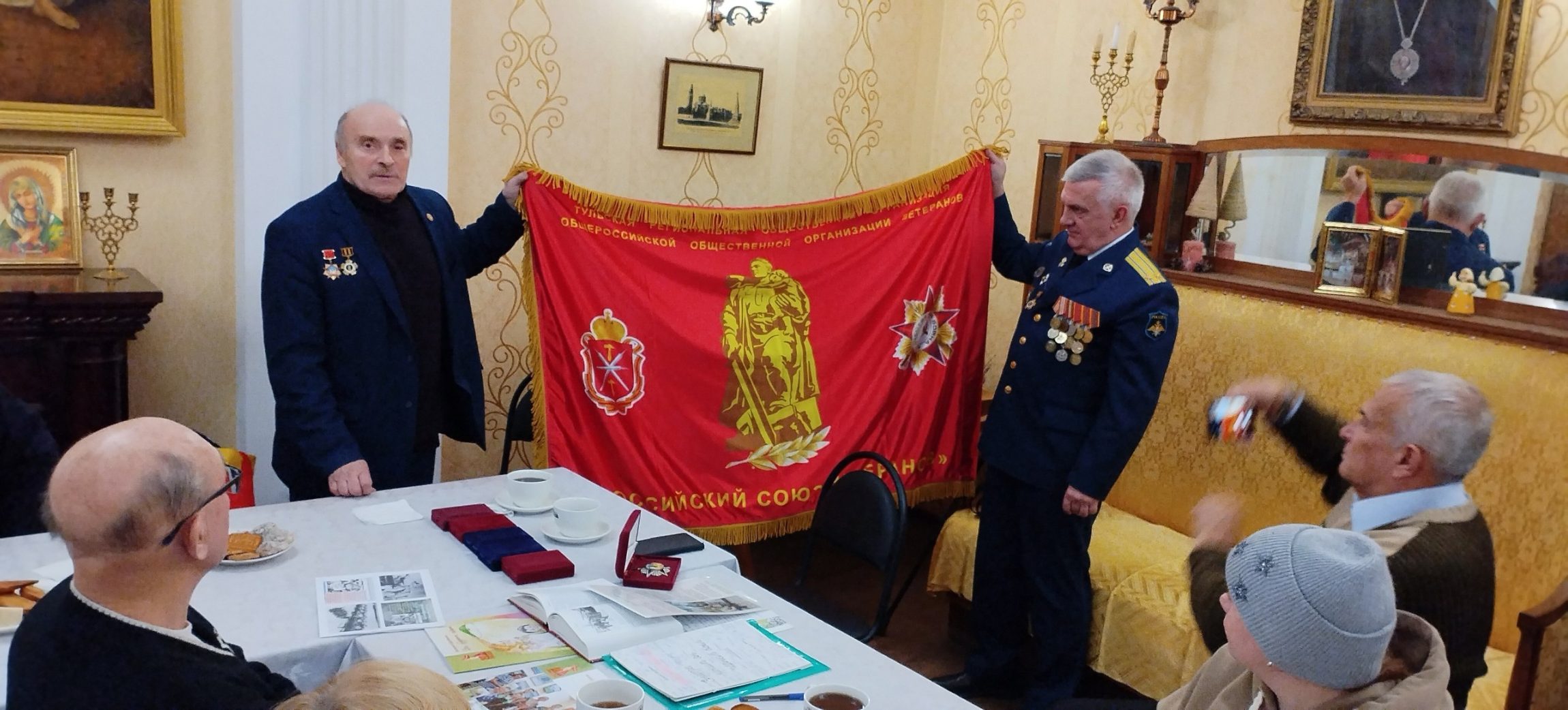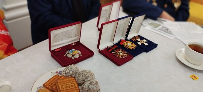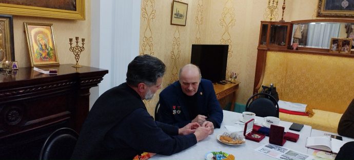 Председатель Тульского областного комитета Российского Союза ветеранов Александр Лобанов провел экскурс в историю наградной системы России, сопроводив рассказ экспонатами персональной коллекции. Александр Павлович наградил протоиерея Вячеслава Ковалевского памятным знаком Российского Союза ветеранов «80 лет Победы».