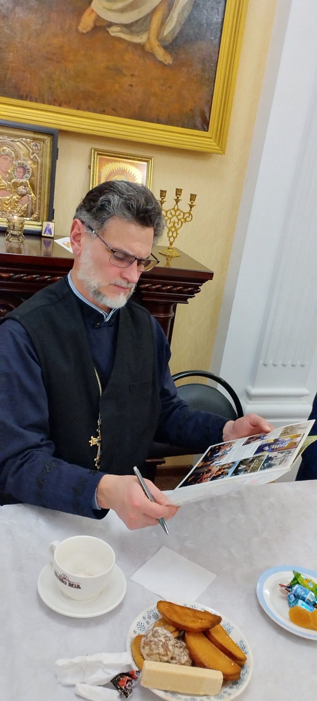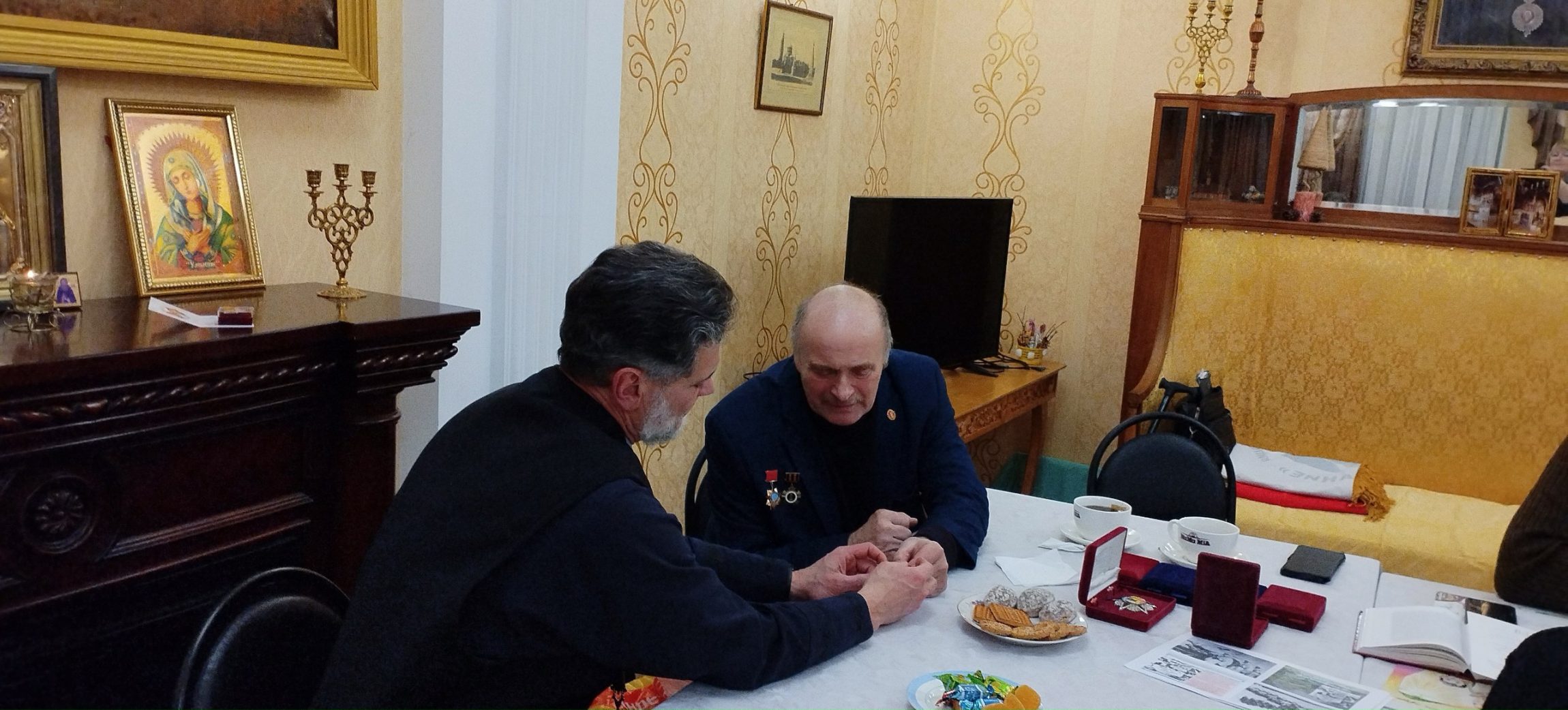 Протоиерей Вячеслав Ковалевский обратился к собравшимся: «От всего сердца благодарю Российский Союз ветеранов за эту добрую награду – памятный знак в честь 80-летия Великой Победы. Для меня это – не личная заслуга, а, в первую очередь, общая благодарность. Она обращена ко всем нашим прихожанам, тем, кто в церковном доме, с молитвой и усердием, день за днем плетёт маскировочные сети. К тем, чьи руки вяжут теплые носки и свитера для наших воинов. К тем, кто жертвует от своего достатка, организует и отправляет на фронт большие грузы гуманитарной помощи.