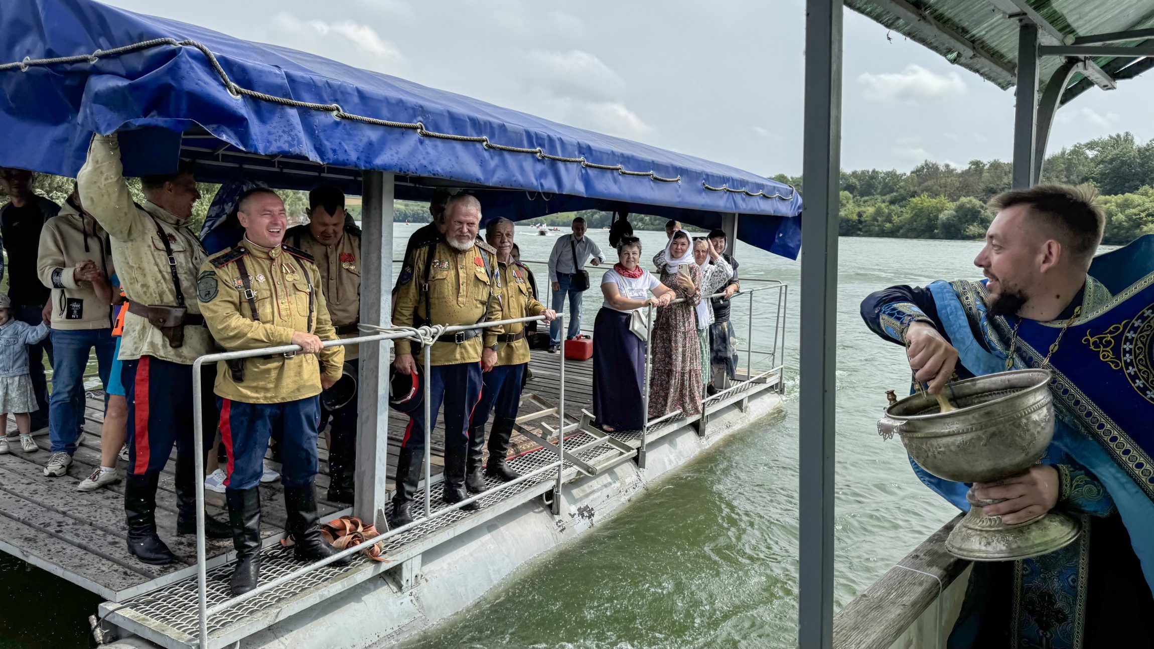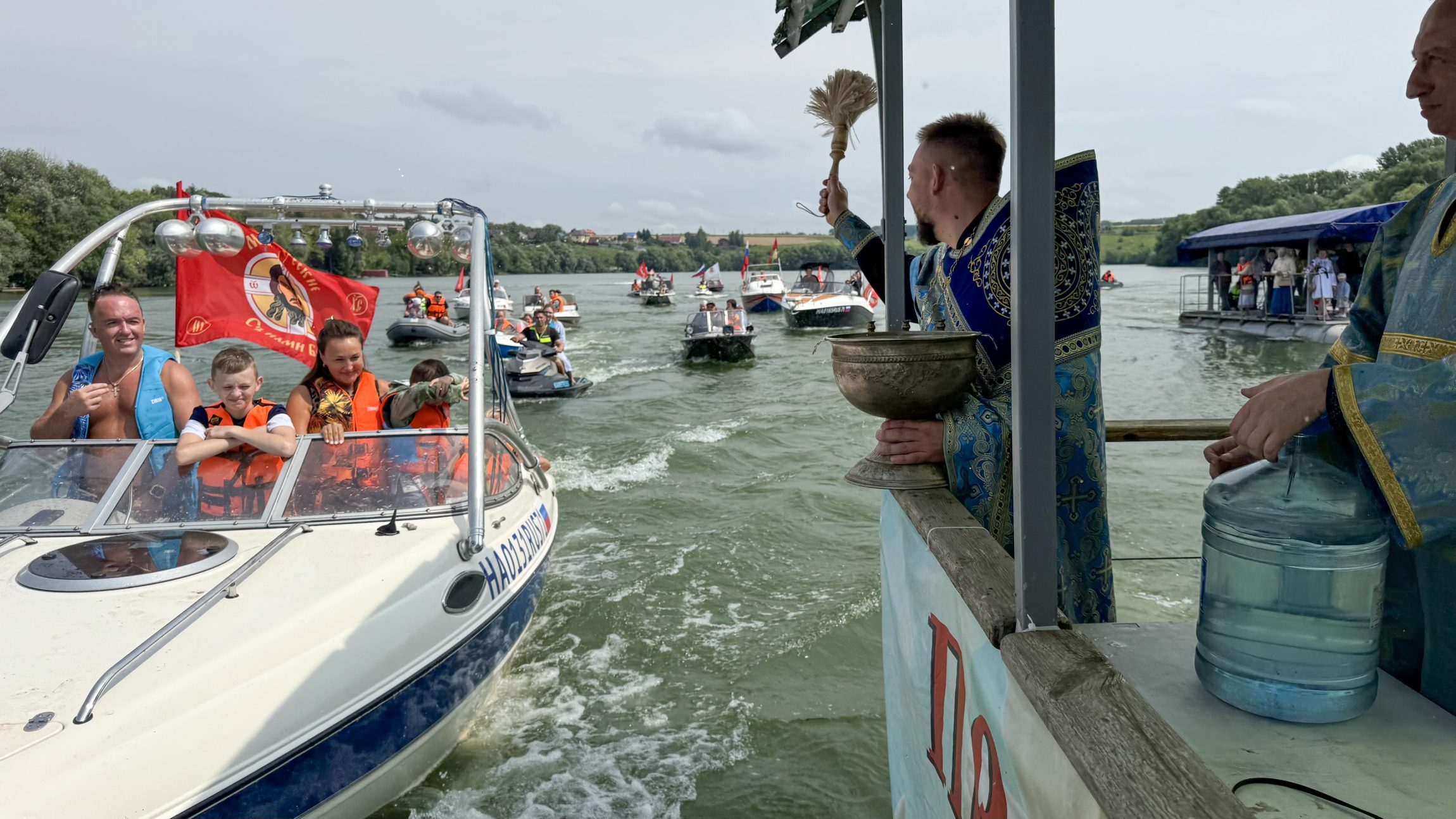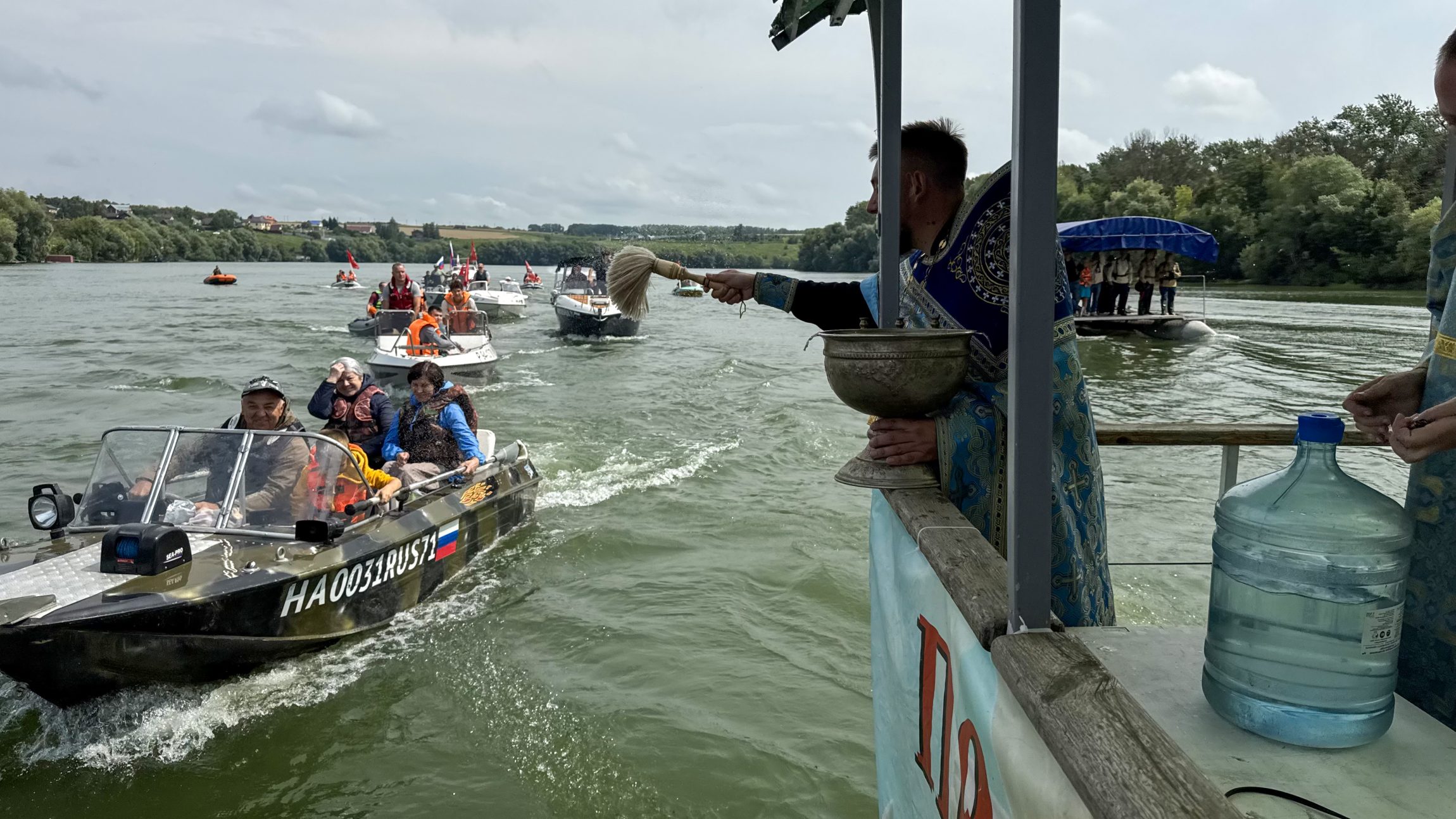 Перед возвращением каждое малое судно подплывало к парому: люди там вставали и священник окроплял их святой водой. В благодарность каждому капитану ещё в прошлом году от Казанского храма был подарен особенный флаг, символизирующий православную веру и нашу победу. Все капитаны стяги сохранили с прошлого раза, а «новичкам» этого года их подарил батюшка.