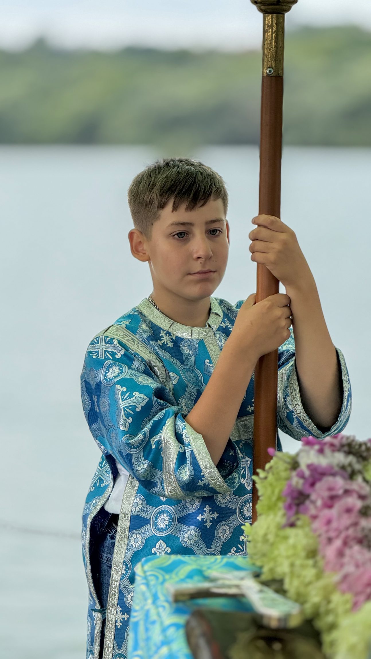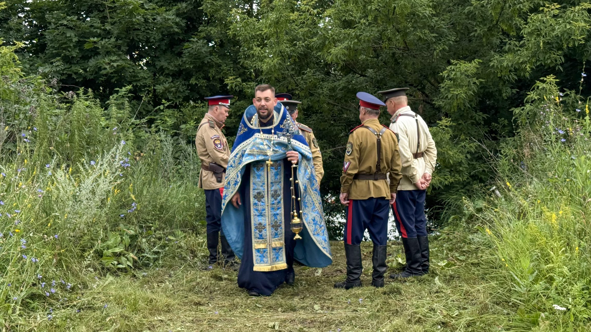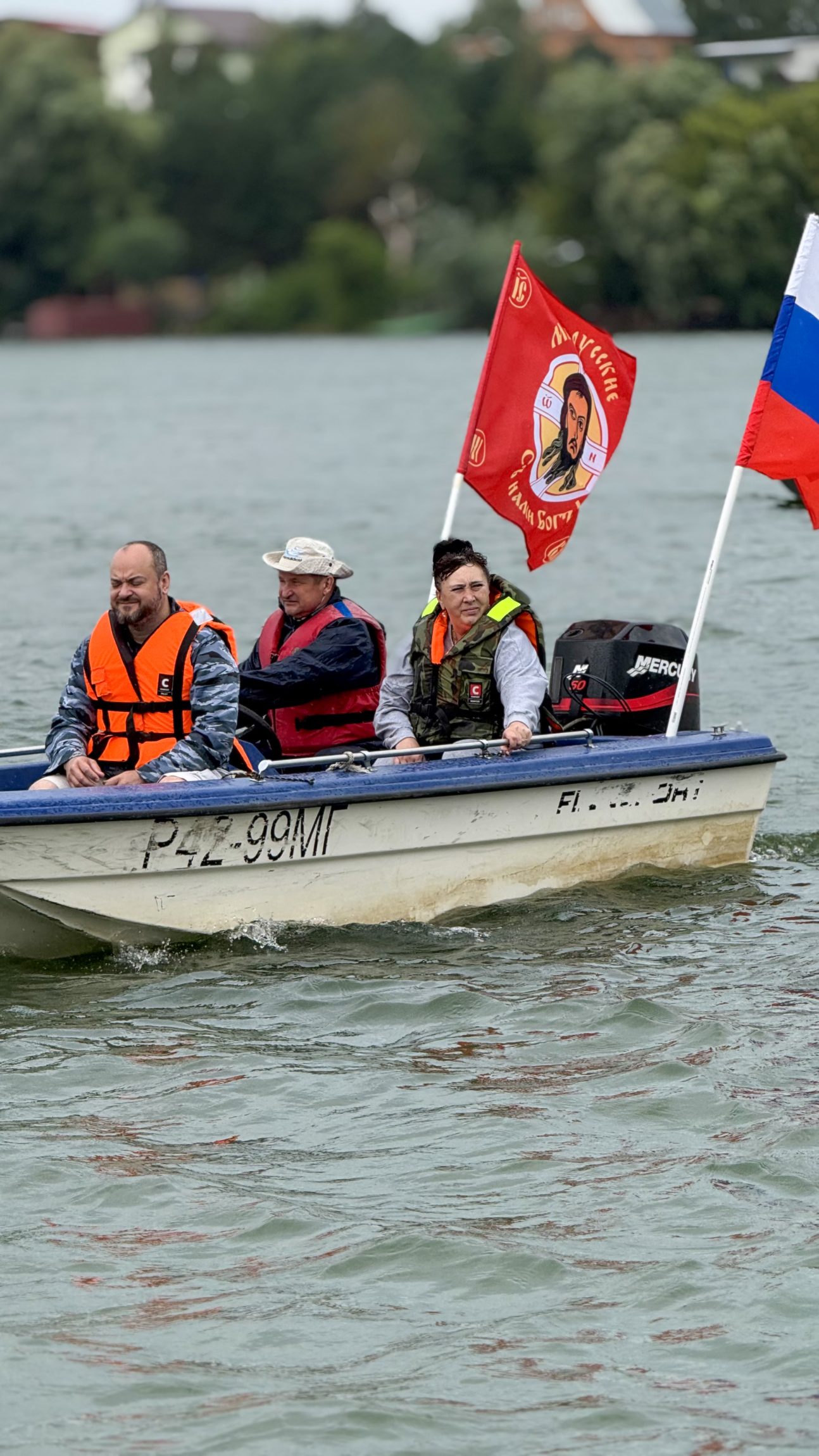 Перед возвращением каждое малое судно подплывало к парому: люди там вставали и священник окроплял их святой водой. В благодарность каждому капитану ещё в прошлом году от Казанского храма был подарен особенный флаг, символизирующий православную веру и нашу победу. Все капитаны стяги сохранили с прошлого раза, а «новичкам» этого года их подарил батюшка.