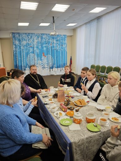 В отделении помощи семье и детям ГУ ТО «Социально-реабилитационный центр для несовершеннолетних № 5» города Ефремова прошёл круглый стол на тему: «Поговорим о семье и семейных ценностях». В мероприятии приняли участие настоятель храма святого великомученика Димитрия Солунского села Пожилино иерей Николай Авдуловский, старший инспектор отдела ЗАГС Ольга Кондрахина, родители и ребята отделения помощи семье и детям.