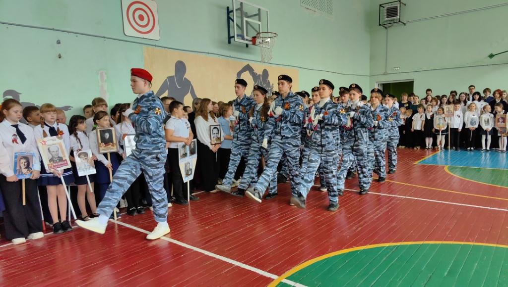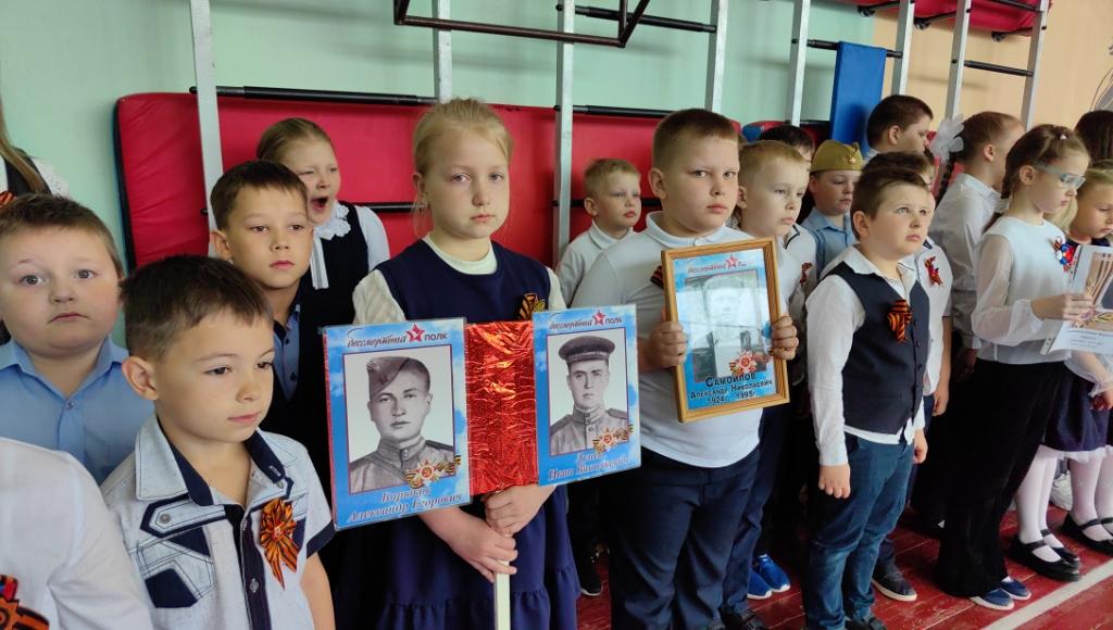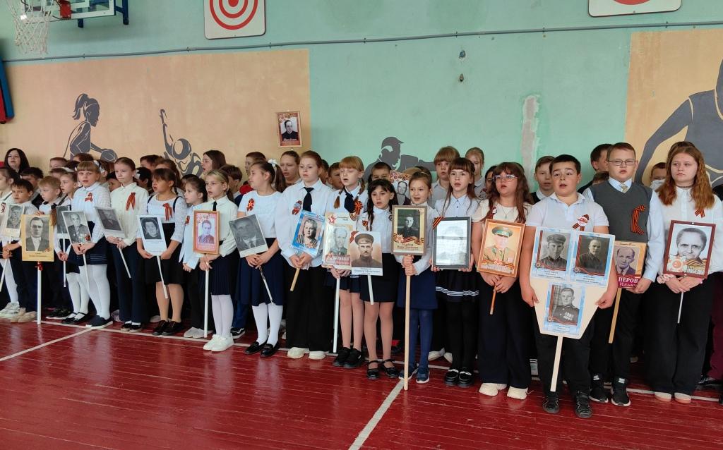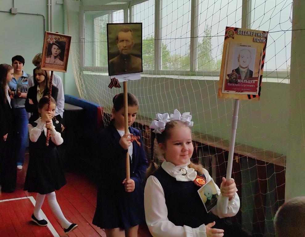 На линейке была проведена акция «Бессмертный полк». Ученики и педагоги держали в руках портреты дедов и прадедов, бабушек и прабабушек, ветеранов и тружеников тыла, которые приближали этот день.