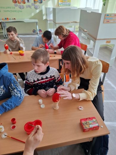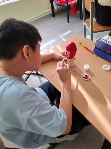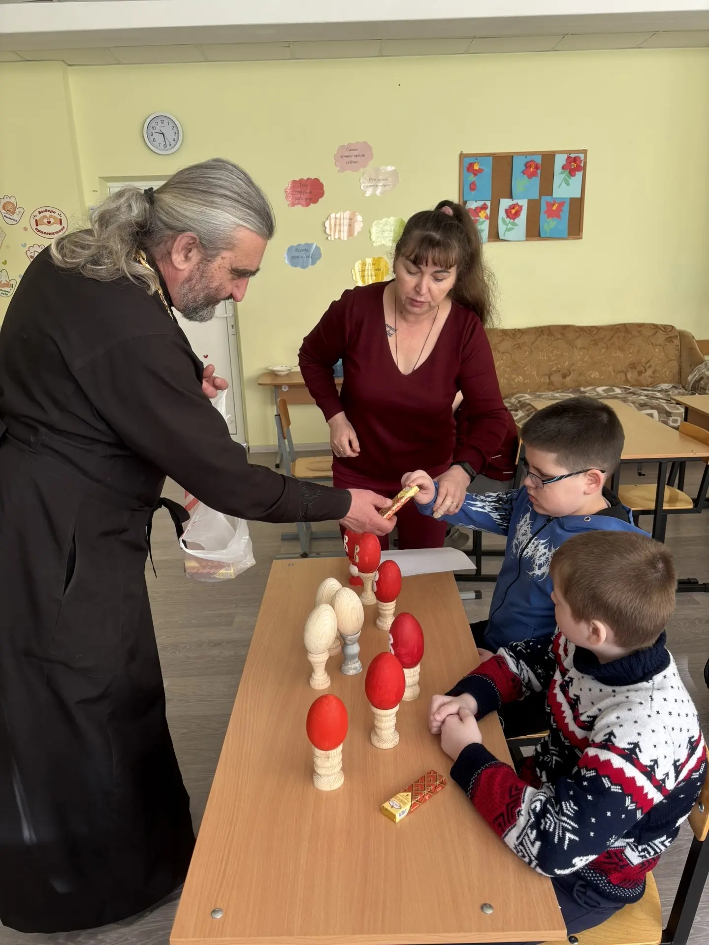 Священник принес выточенные собственноручно из древесины яйца и подставки под них, а педагоги каждому ученику предоставили необходимые краски и кисти и провели мастер-класс по раскрашиванию яиц к празднику Светлого Христова Воскресения.