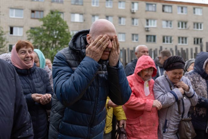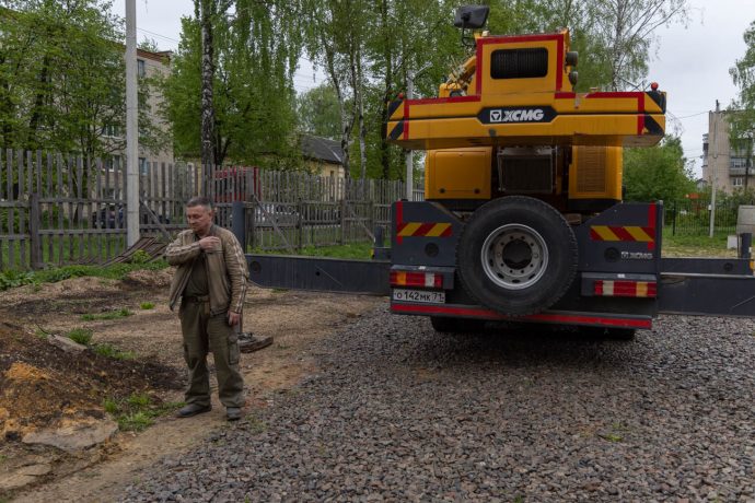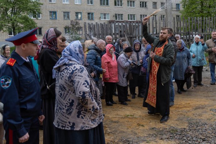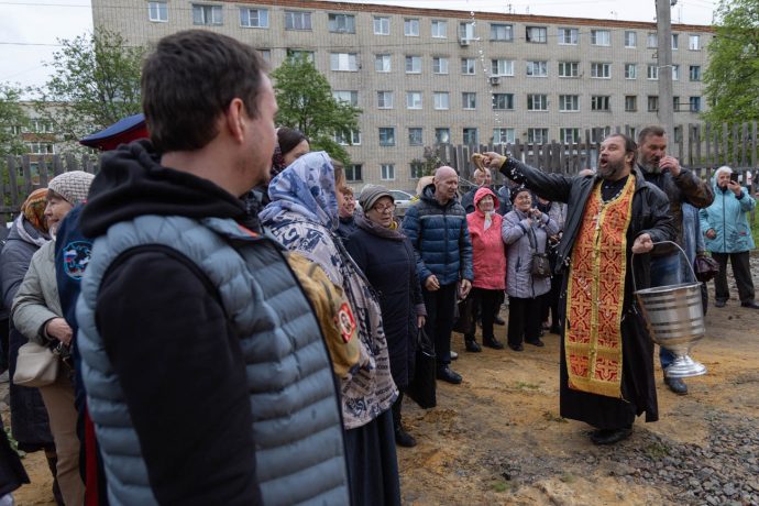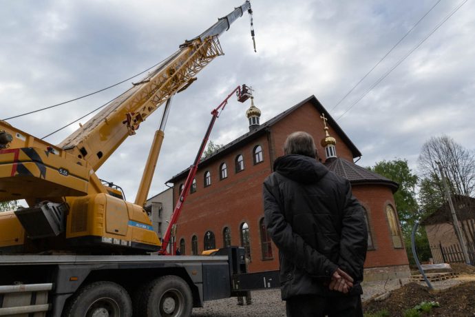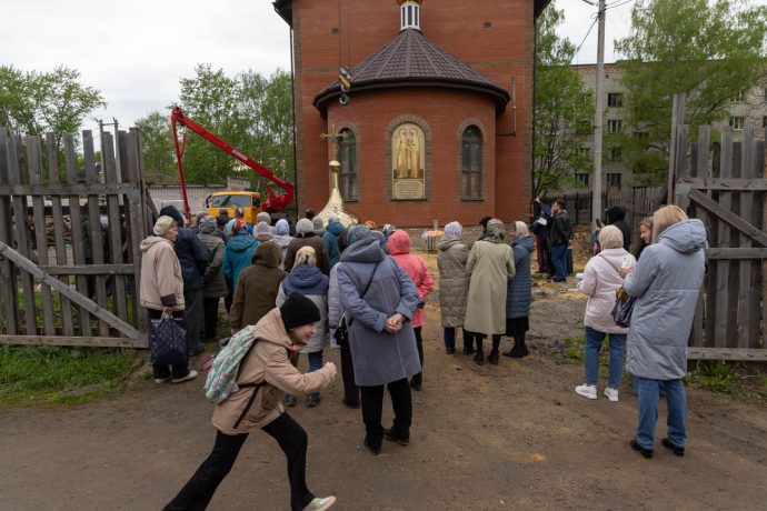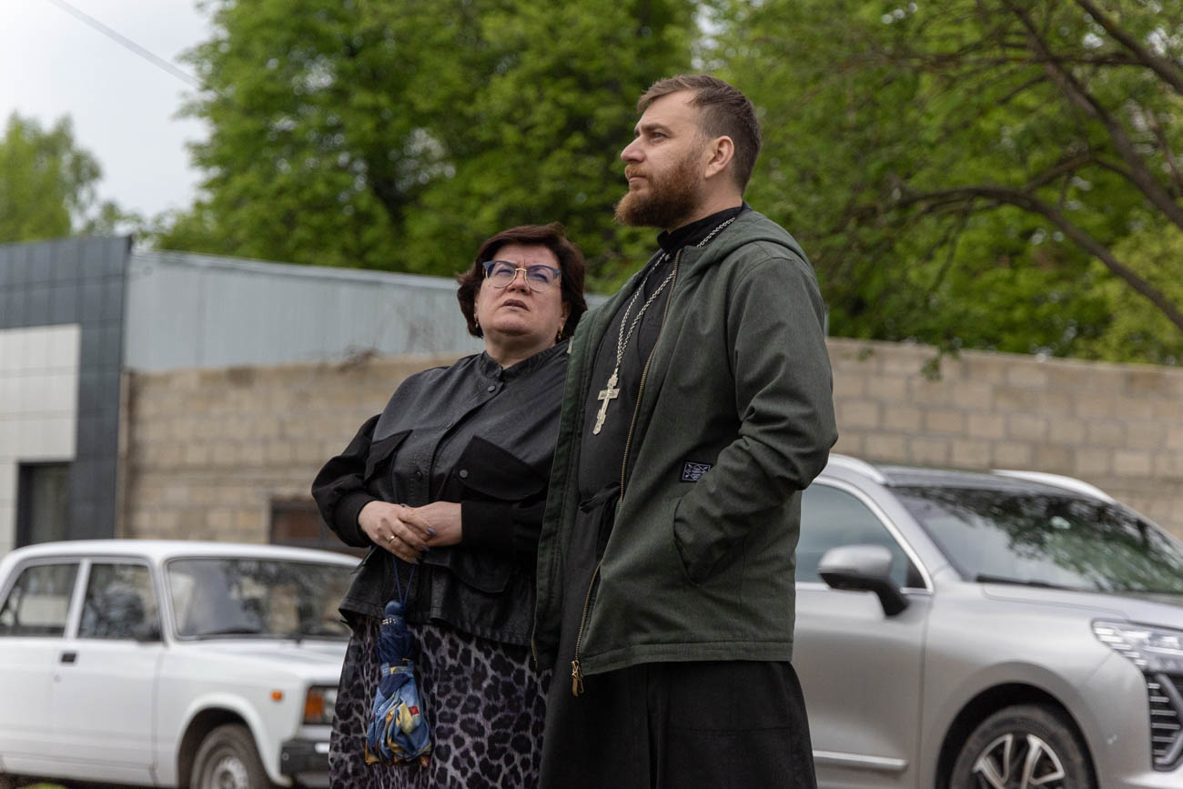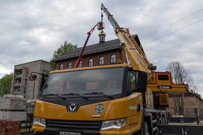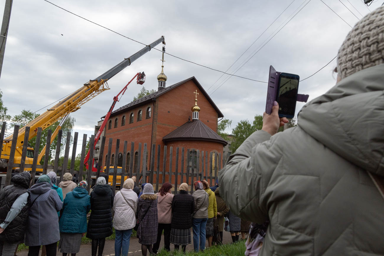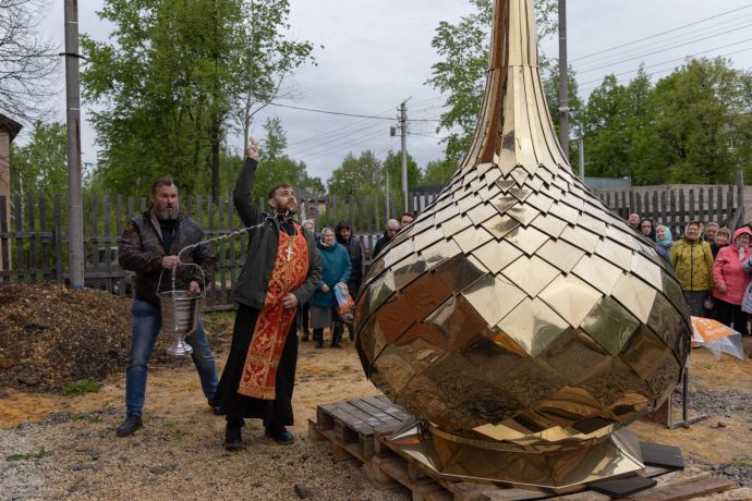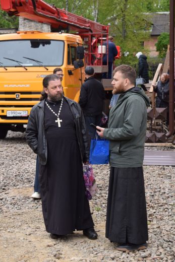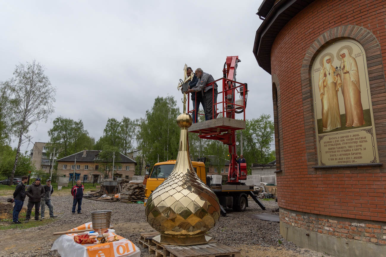 Освящение накупольного креста совершил настоятель прихода строящегося храма блаженной Матроны Московской иерей Александр Гунба.