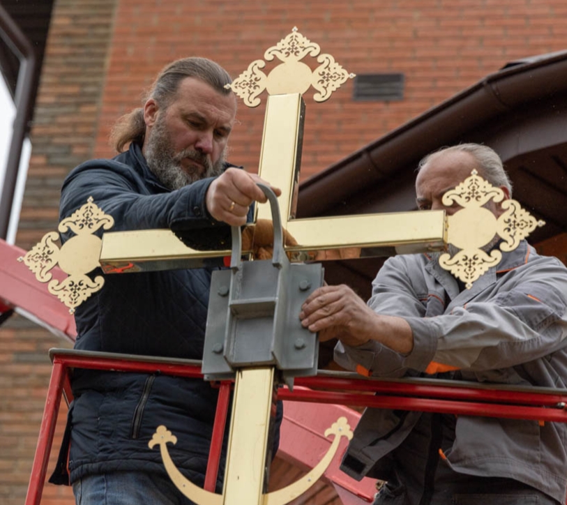 «По благословению правящего архиерея накупольные кресты крестильного храма и церковного здания нашего храмового комплекса имеют красивую древнюю форму. На них изображён полумесяц – цата. Это царский символ. Установка креста с цатой на куполе храма напоминает нам о том, что храм этот принадлежит Царю царствующих и Господу господствующих. Кроме того, из глубокой древности к нам пришло и другое значение креста с полумесяцем. В одном из своих посланий апостол Павел учит, что христиане имеют возможность «взяться за предлежащую надежду, то есть Крест, который для души есть как якорь безопасный и крепкий» (Евр. 6, 18-19). В святоотеческой традиции есть и другие толкования полумесяца – например, что это люлька Вифлеемская, принявшая Богомладенца Христа, евхаристическая чаша, в которой находится Тело Христово, корабль церковный и купель крещальная», – поделился отец Александр.