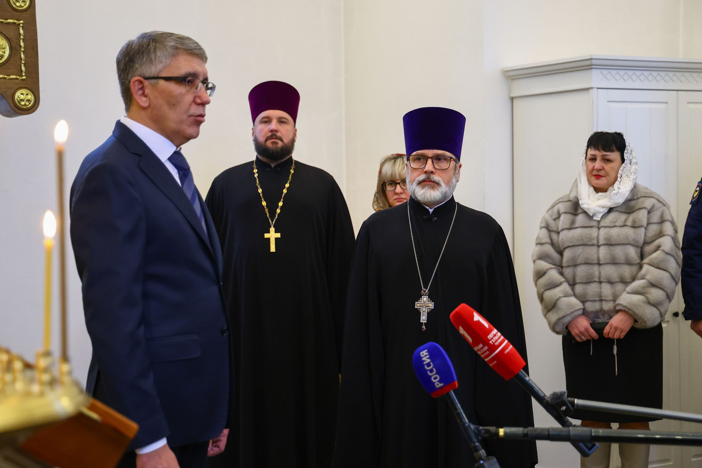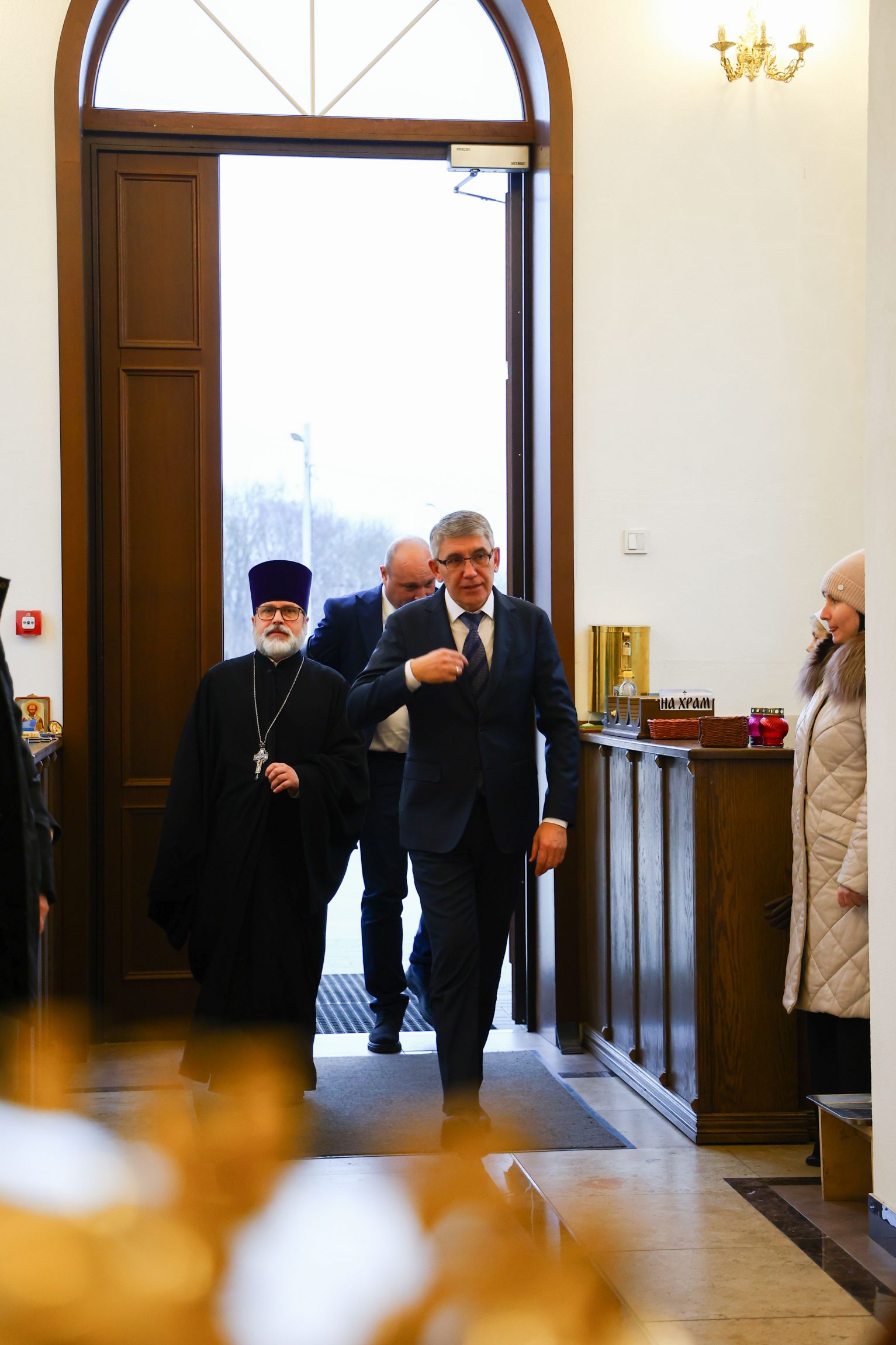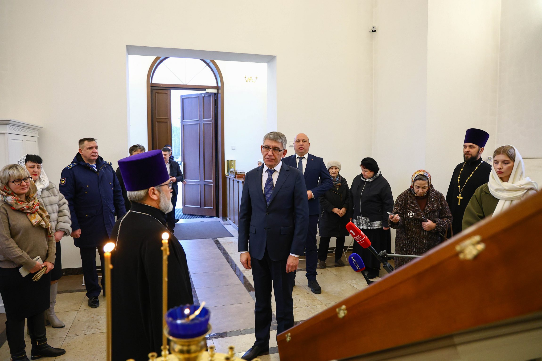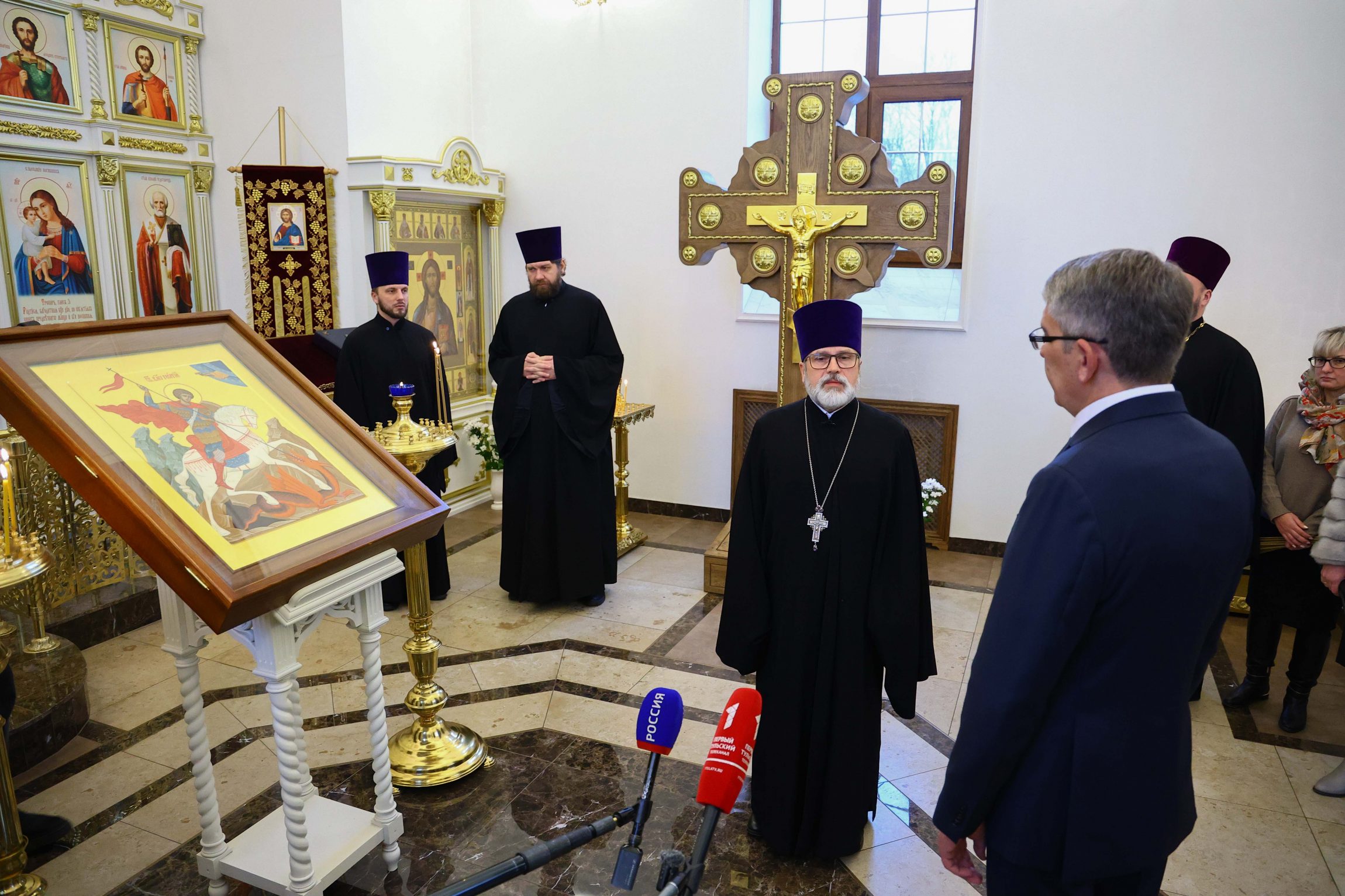 Главу региона встретил протоиерей Сергий Резухин, благочинный Центрального округа и настоятель храма в честь иконы Божией Матери «Утоли моя печали», который во исполнение послушания передал Дмитрию Миляеву приветствие и благодарность от митрополита Тульского и Ефремовского Алексия: «Великомученик Георгий называется Победоносцем не только потому, что он был смелым воином, но и потому, что одержал духовную победу над своими мучителями, которые пытались страхованиями и истязаниями заставить его отречься от Христа. Святой великомученик принял смерть и остался верен Спасителю. Господь же даровал ему силу побеждать не только врага видимого, но и невидимого, — продолжил отец Сергий далее. — На иконе мы видим, что невидимая сила вражья непостижимым образом вошла в змия, который стал пожирать людей, однако был повержен святым воином. Великомученик Георгий многие века является покровителем воинов, покровителем славного российского воинства, так же сражающегося со злом за правду, за веру и добро. Великомученик Георгий является и покровителем Бессмертного полка, участники которого — воины, совершившие подвиг героизма и показавшие подвиг христоподражательной любви, лежат окрест нашего храма.