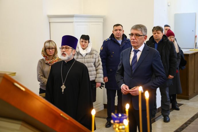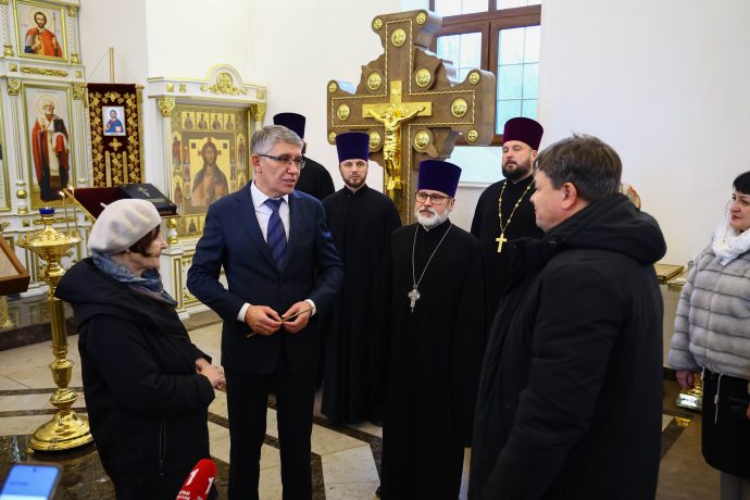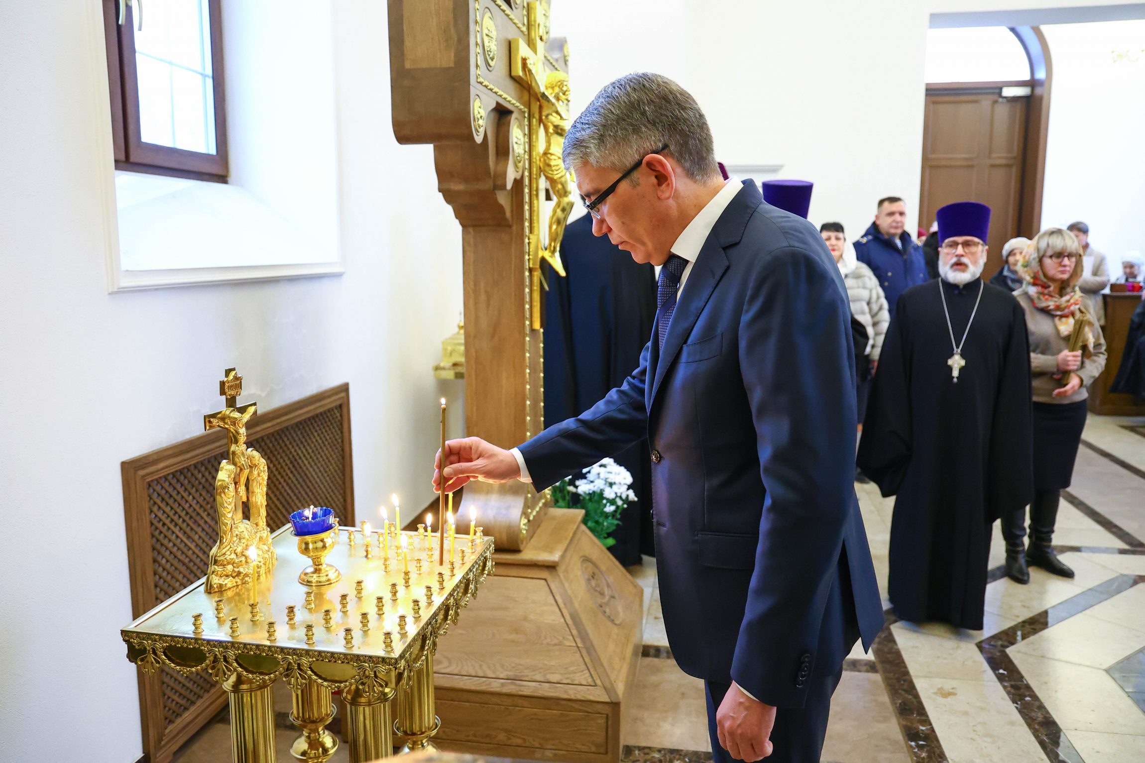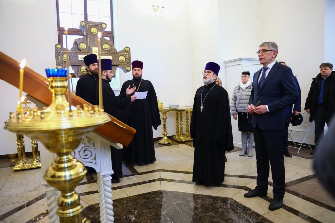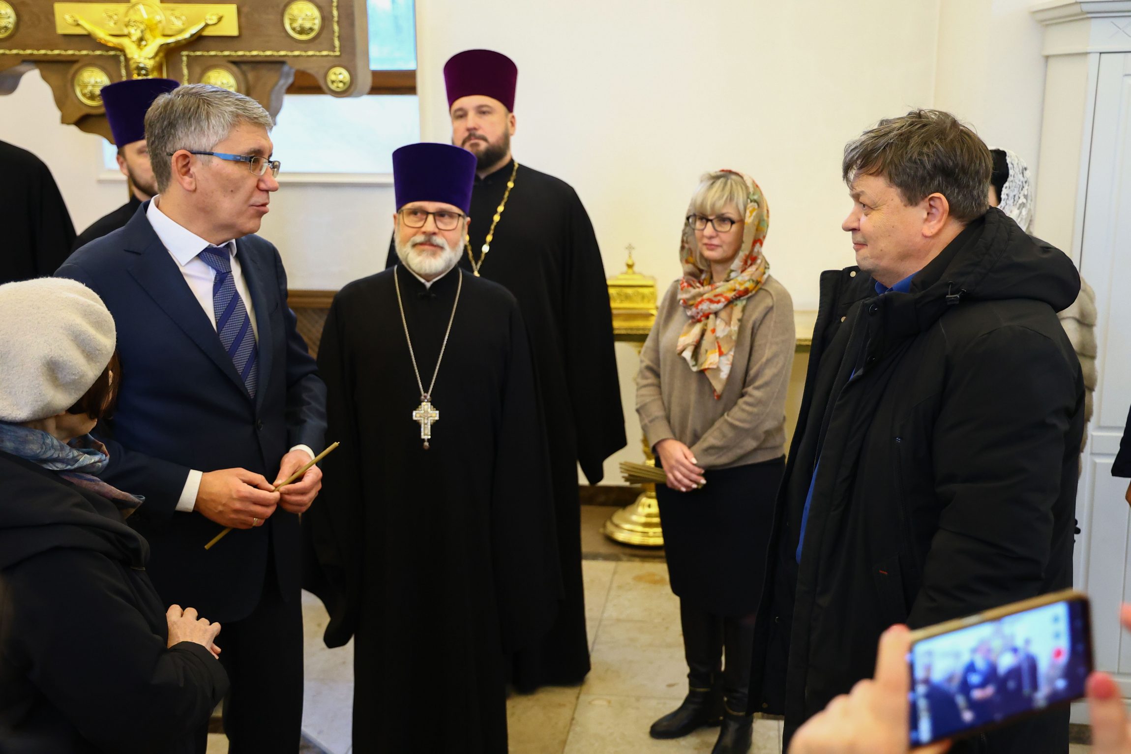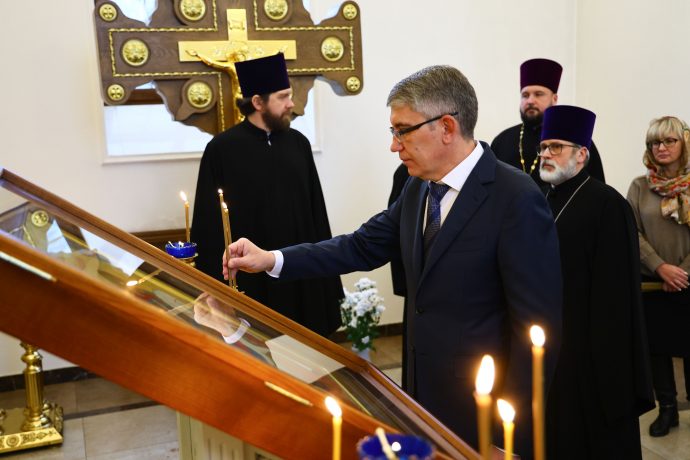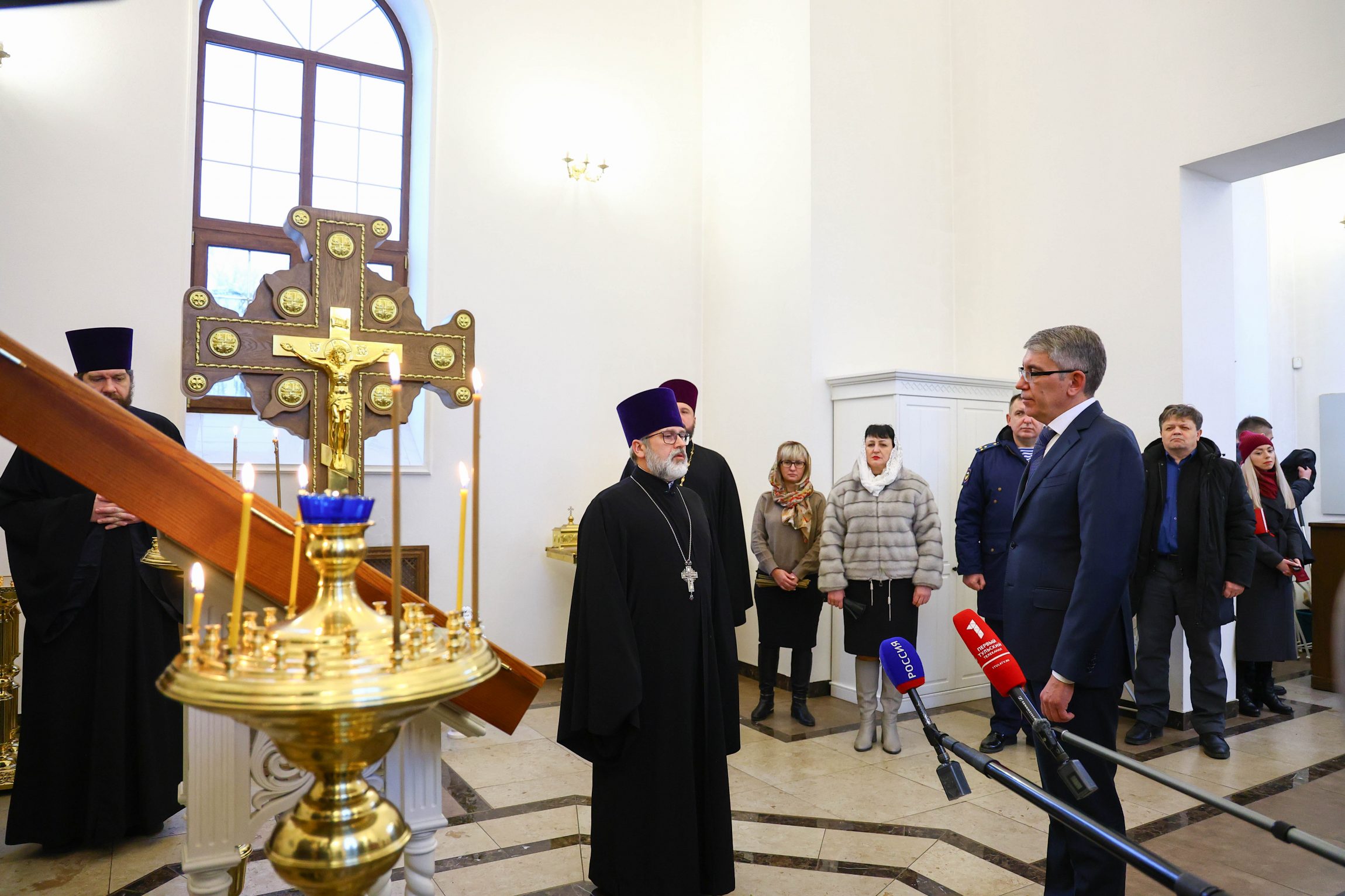 Главу региона встретил протоиерей Сергий Резухин, благочинный Центрального округа и настоятель храма в честь иконы Божией Матери «Утоли моя печали», который во исполнение послушания передал Дмитрию Миляеву приветствие и благодарность от митрополита Тульского и Ефремовского Алексия: «Великомученик Георгий называется Победоносцем не только потому, что он был смелым воином, но и потому, что одержал духовную победу над своими мучителями, которые пытались страхованиями и истязаниями заставить его отречься от Христа. Святой великомученик принял смерть и остался верен Спасителю. Господь же даровал ему силу побеждать не только врага видимого, но и невидимого, — продолжил отец Сергий далее. — На иконе мы видим, что невидимая сила вражья непостижимым образом вошла в змия, который стал пожирать людей, однако был повержен святым воином. Великомученик Георгий многие века является покровителем воинов, покровителем славного российского воинства, так же сражающегося со злом за правду, за веру и добро. Великомученик Георгий является и покровителем Бессмертного полка, участники которого — воины, совершившие подвиг героизма и показавшие подвиг христоподражательной любви, лежат окрест нашего храма.