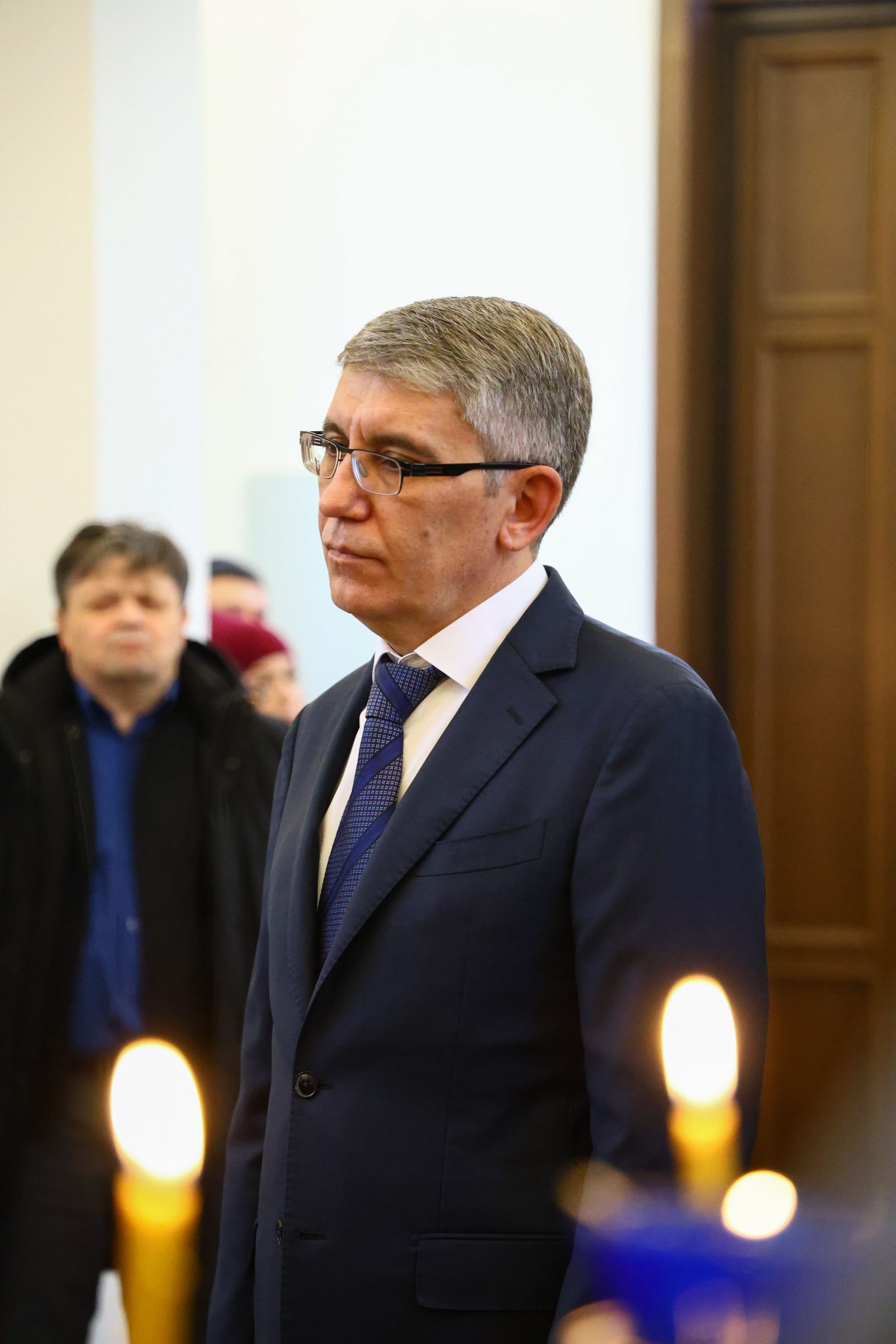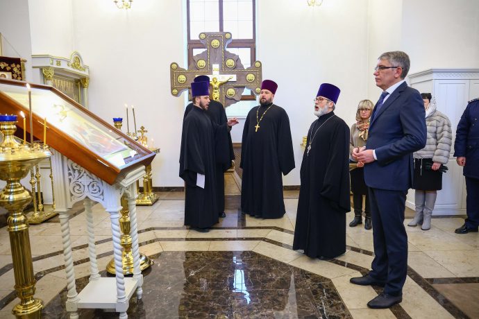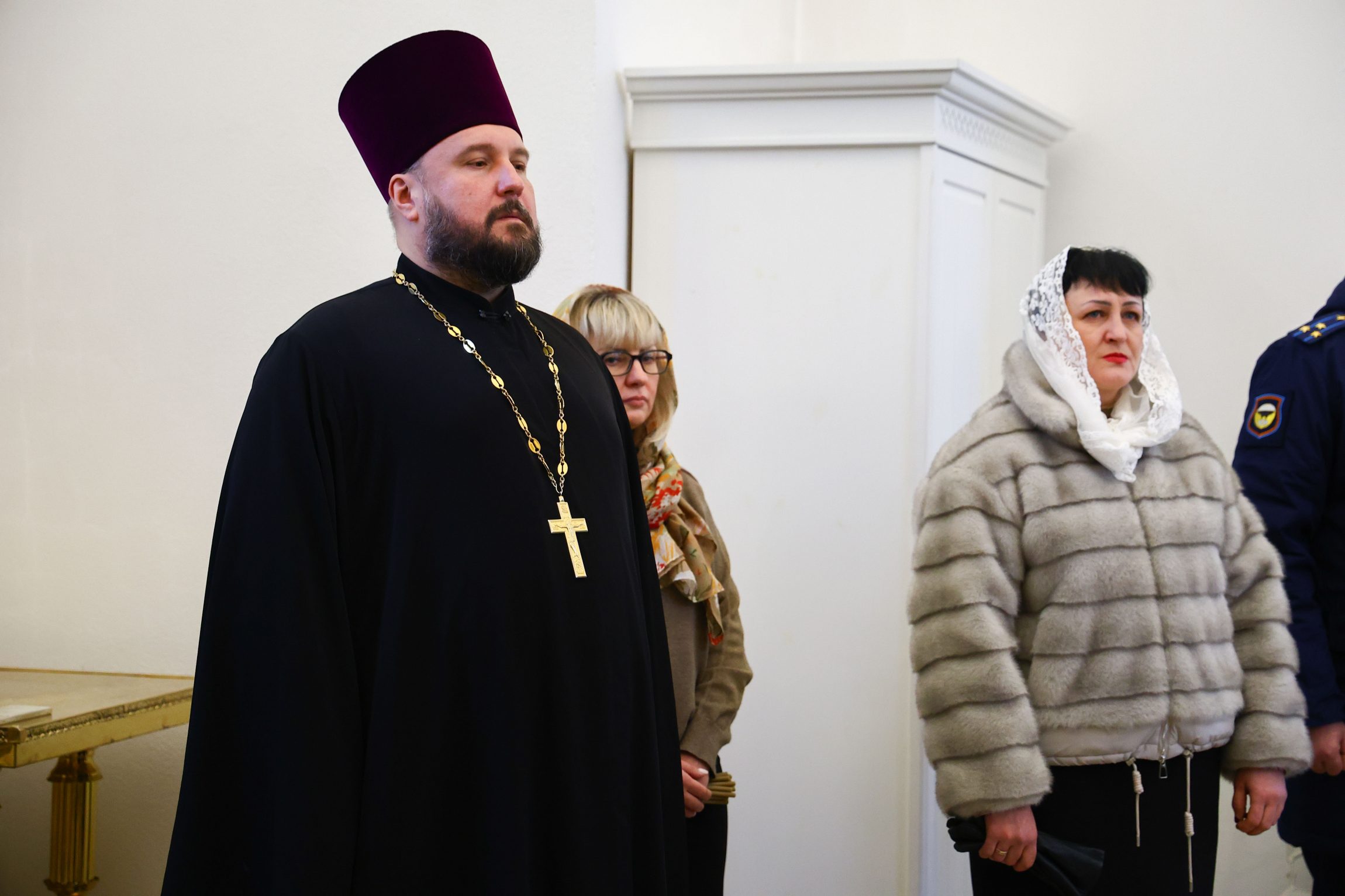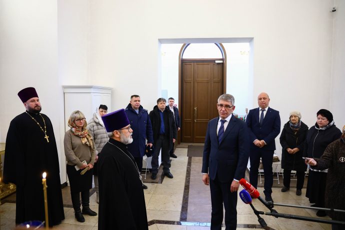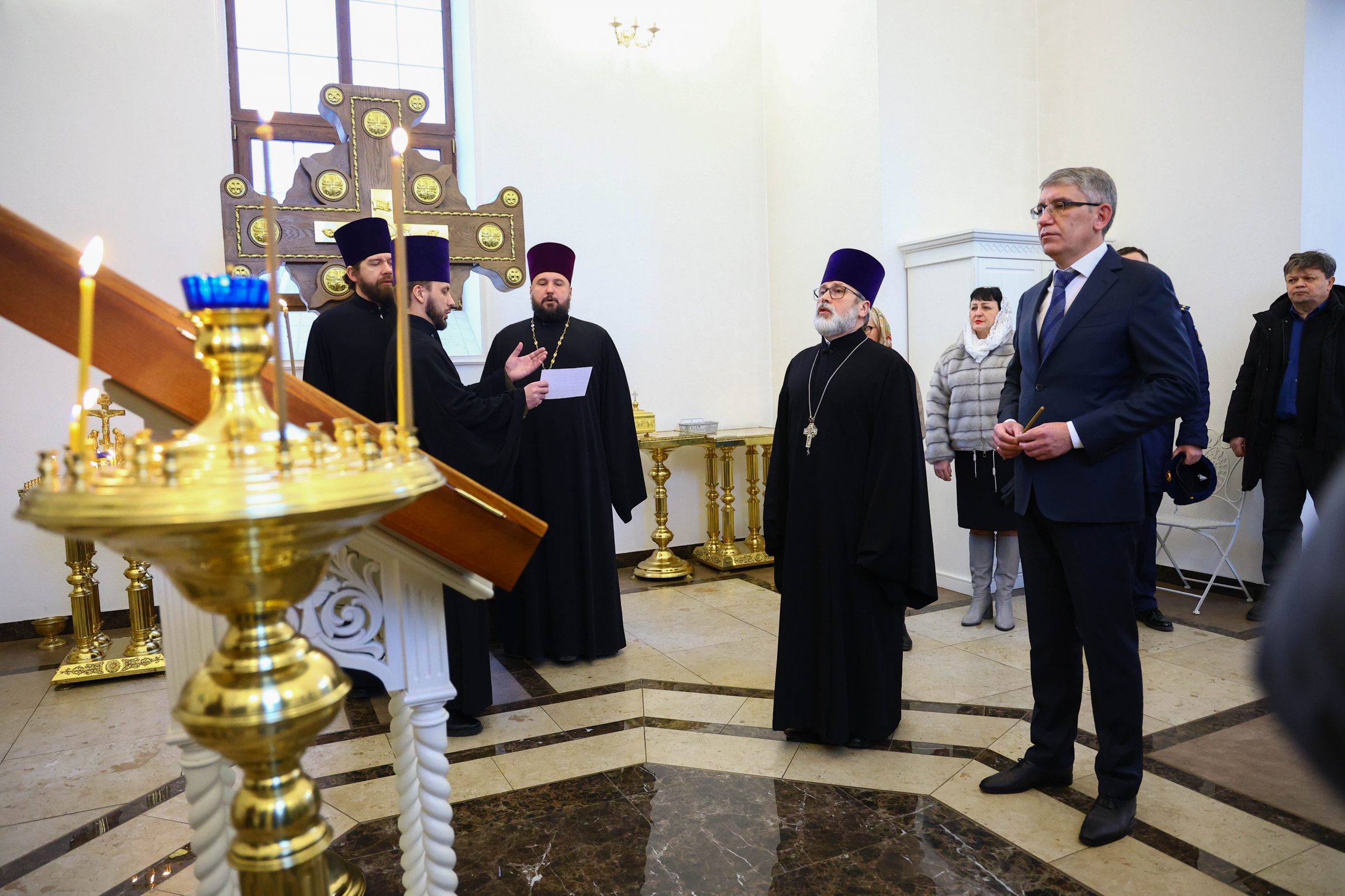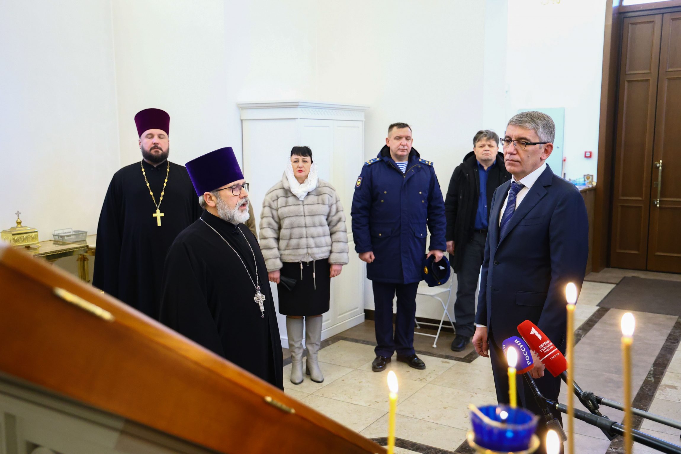 Главу региона встретил протоиерей Сергий Резухин, благочинный Центрального округа и настоятель храма в честь иконы Божией Матери «Утоли моя печали», который во исполнение послушания передал Дмитрию Миляеву приветствие и благодарность от митрополита Тульского и Ефремовского Алексия: «Великомученик Георгий называется Победоносцем не только потому, что он был смелым воином, но и потому, что одержал духовную победу над своими мучителями, которые пытались страхованиями и истязаниями заставить его отречься от Христа. Святой великомученик принял смерть и остался верен Спасителю. Господь же даровал ему силу побеждать не только врага видимого, но и невидимого, — продолжил отец Сергий далее. — На иконе мы видим, что невидимая сила вражья непостижимым образом вошла в змия, который стал пожирать людей, однако был повержен святым воином. Великомученик Георгий многие века является покровителем воинов, покровителем славного российского воинства, так же сражающегося со злом за правду, за веру и добро. Великомученик Георгий является и покровителем Бессмертного полка, участники которого — воины, совершившие подвиг героизма и показавшие подвиг христоподражательной любви, лежат окрест нашего храма.