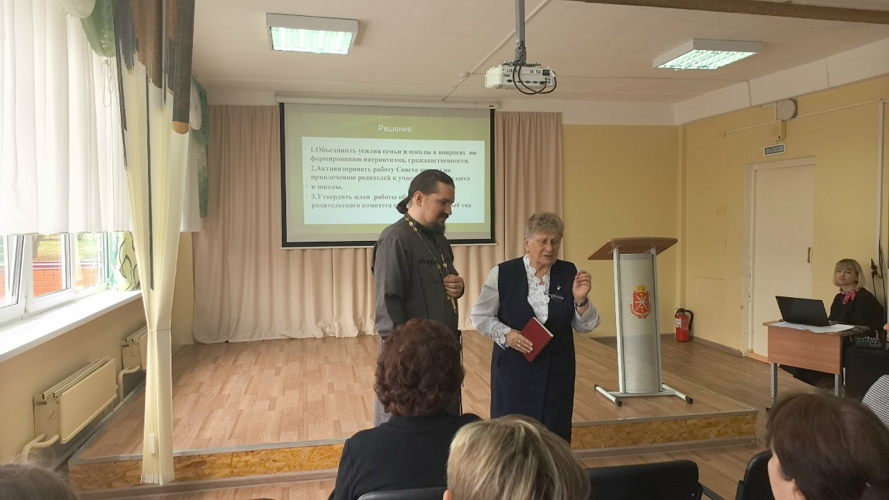 Открыла мероприятие директор школы Валентина Миронова. Она подчеркнула важность совместной работы педагогов, родителей и духовного сообщества в воспитании подрастающего поколения: «Сегодняшнее мероприятие объединяет нас в стремлении воспитывать детей в духе патриотизма, уважения к традициям и любви к нашей многонациональной Родине. Мы собрались не просто для обсуждения школьных дел — мы создаём пространство диалога, где каждый голос важен, где опыт педагогов встречается с мудростью родителей, а духовные ценности укрепляют наши общие усилия. Особенно радостно, что сегодня с нами иерей Алексий Дудин, настоятель нашего храма.