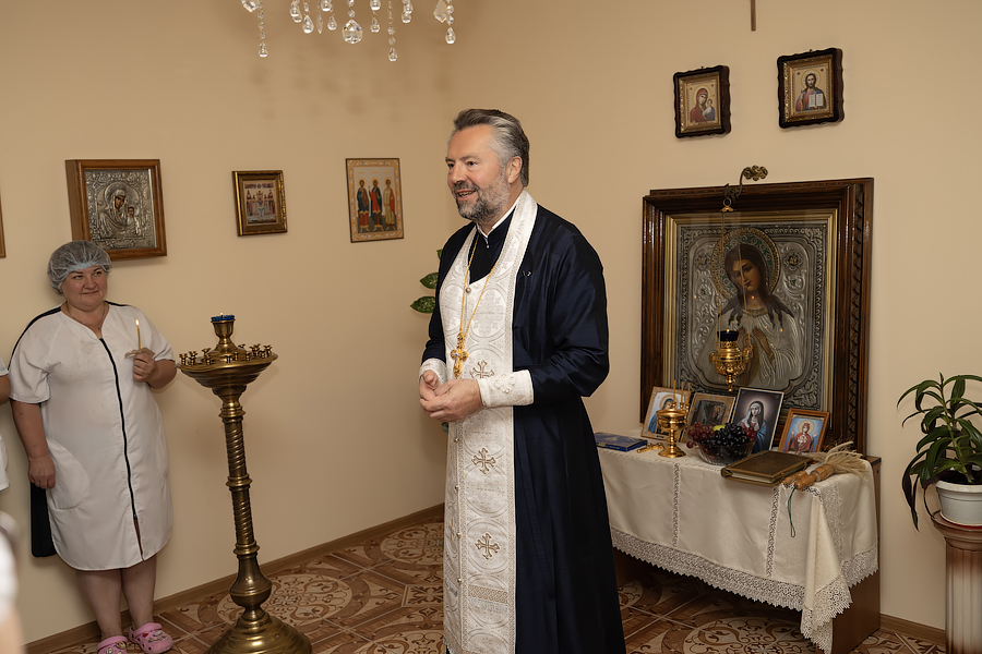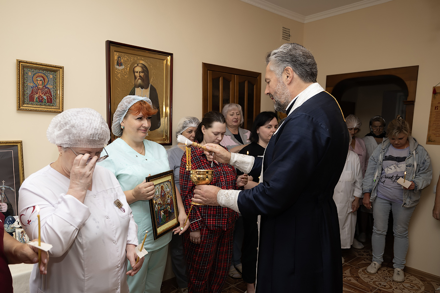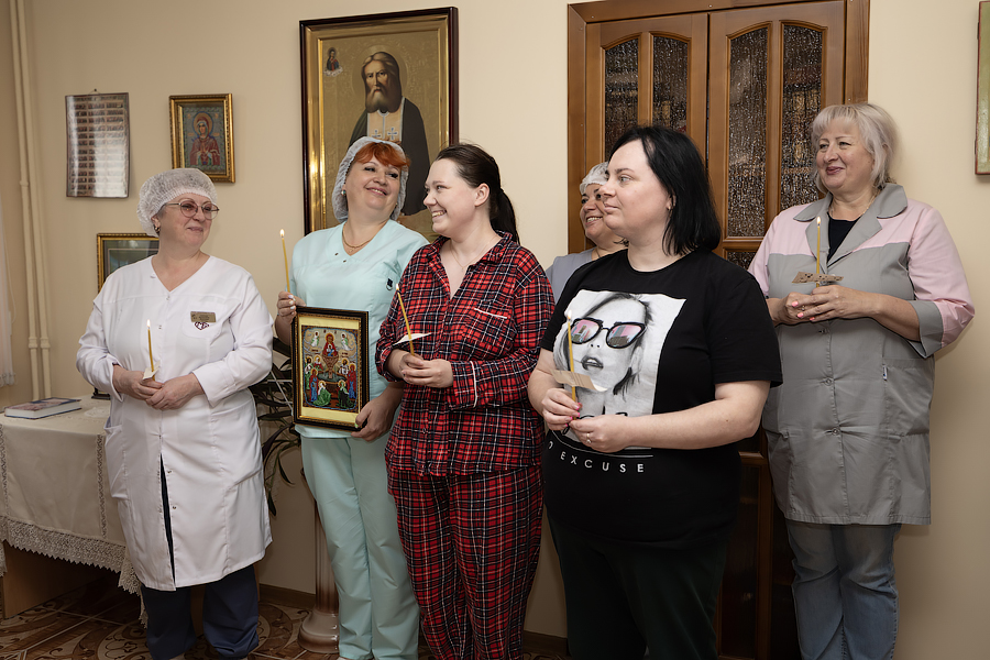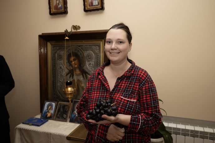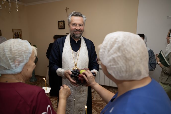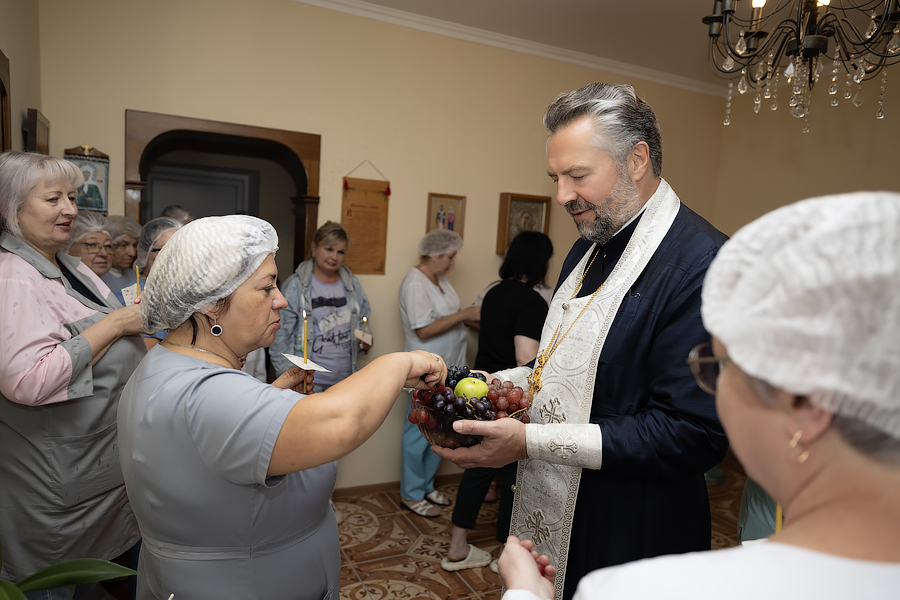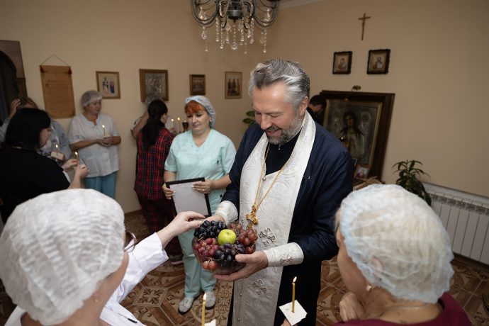 Батюшка сердечно поздравил медицинский персонал и всех пациенток с праздничным днем Преображения Господня, пожелав присутствующим крепкого здоровья и мира, а после угостил всех освященными плодами нового урожая.