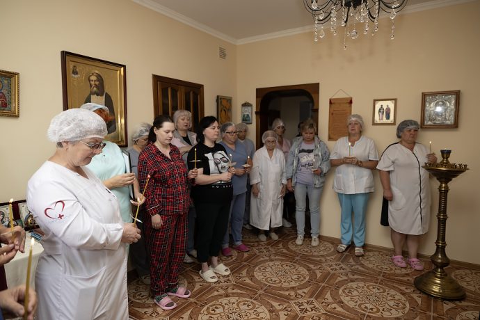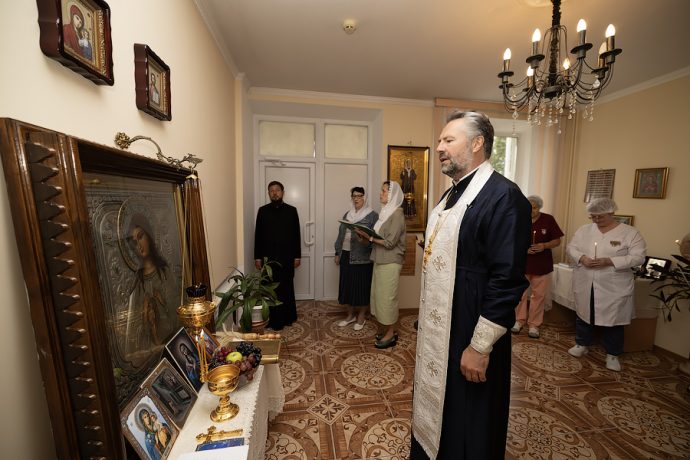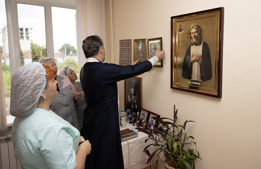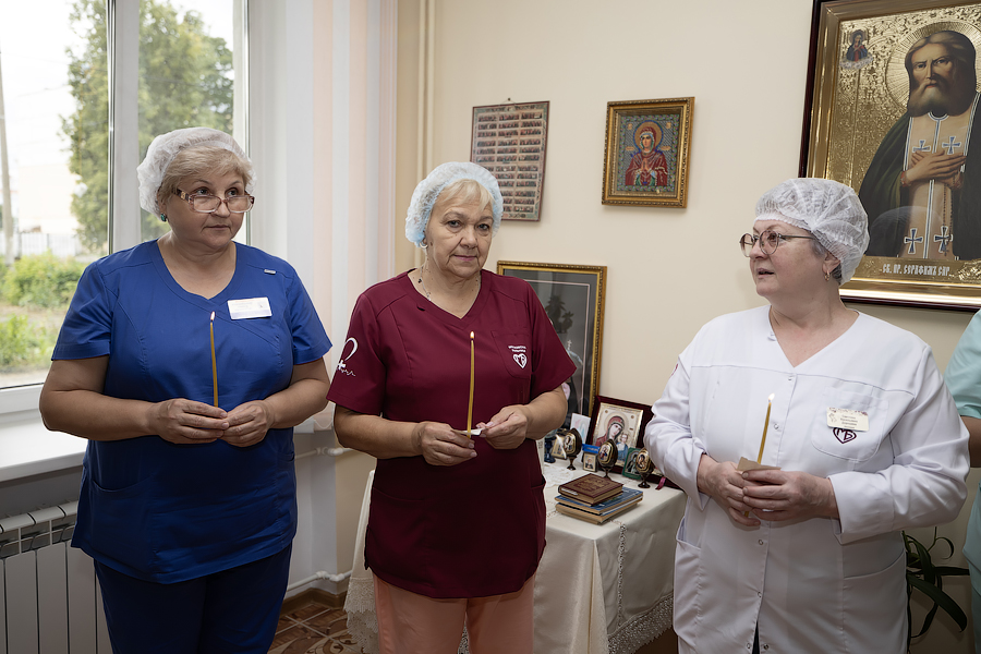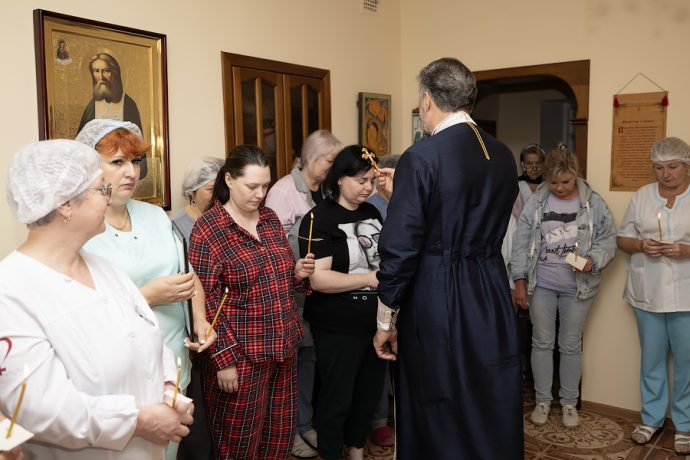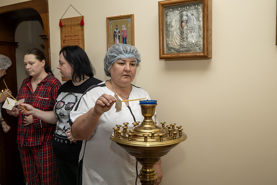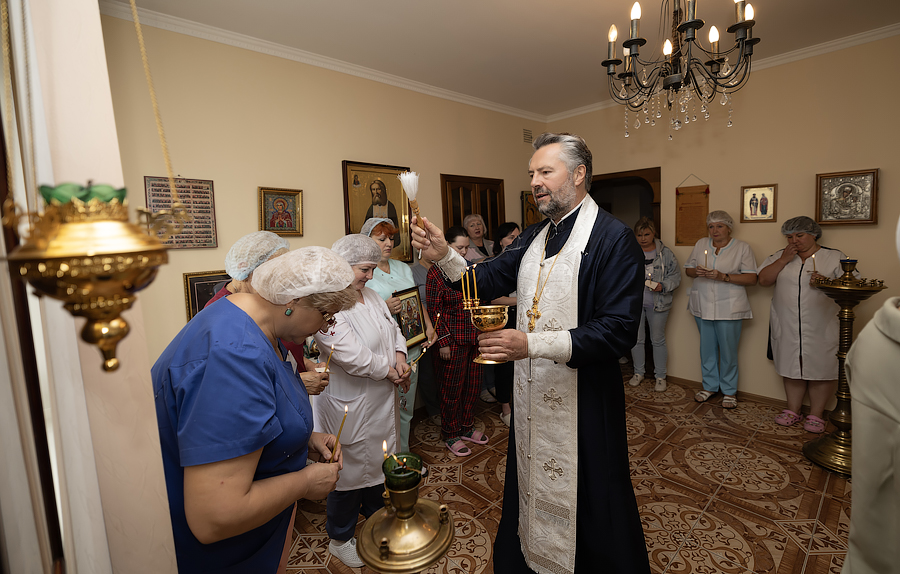 Батюшка сердечно поздравил медицинский персонал и всех пациенток с праздничным днем Преображения Господня, пожелав присутствующим крепкого здоровья и мира, а после угостил всех освященными плодами нового урожая.