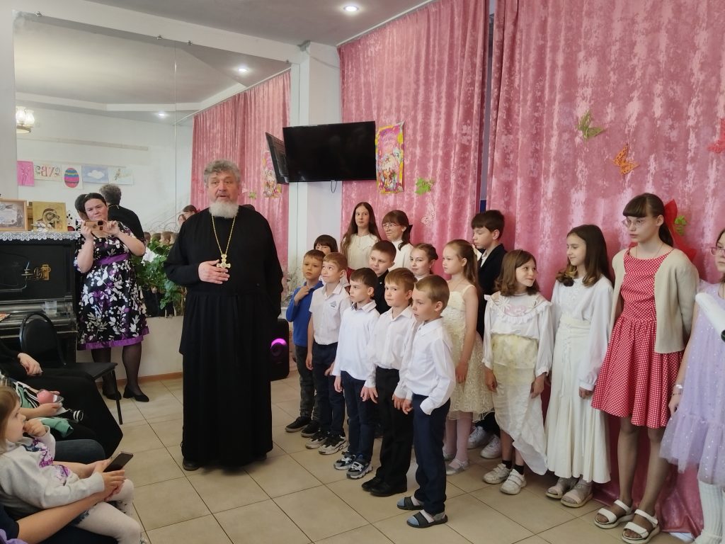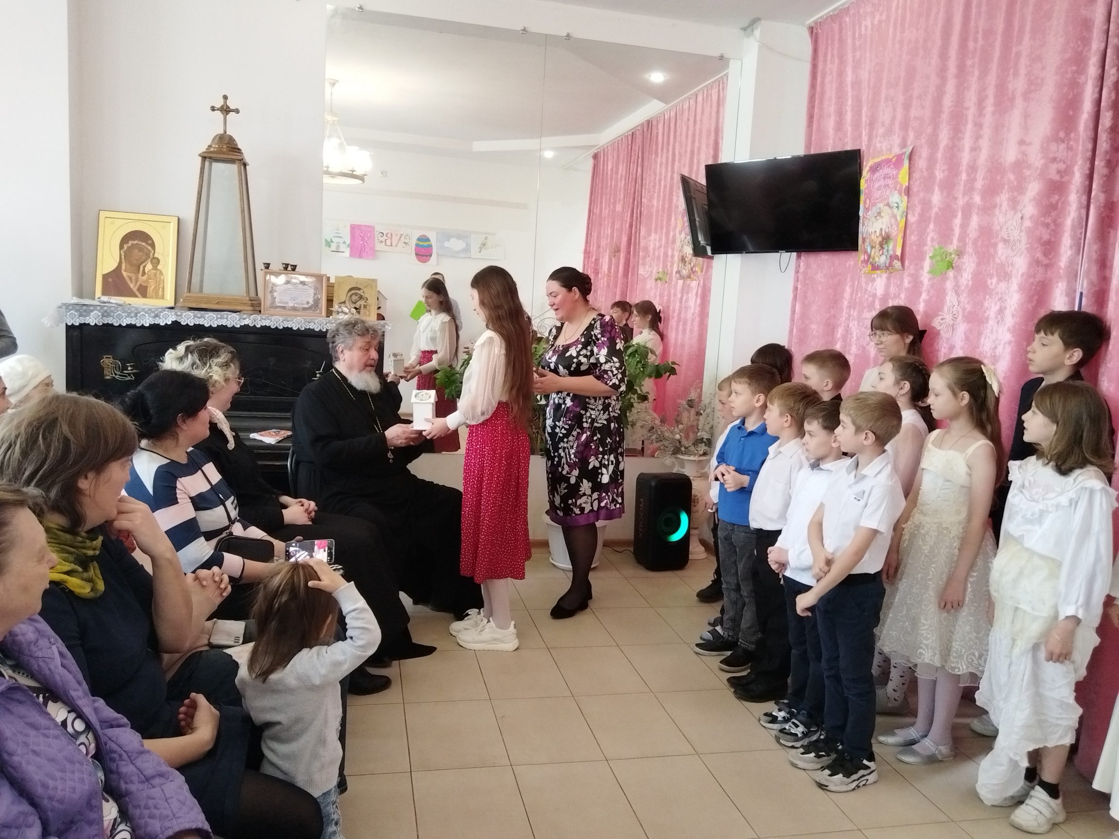 Затем настоятель храма протоиерей Игорь Киров обратился к воспитанникам воскресной школы и гостям: «Светлое Христово Воскресение учит нас любви. В её основе бесконечная и жертвенная любовь Бога к людям. Нас же Воскресший Господь призывает любить своих ближних. А кто может быть ближе к нам, как не наши дети? Давайте послушаем и посмотрим любящими глазами на подготовленный для нас с вами праздничный концерт!»