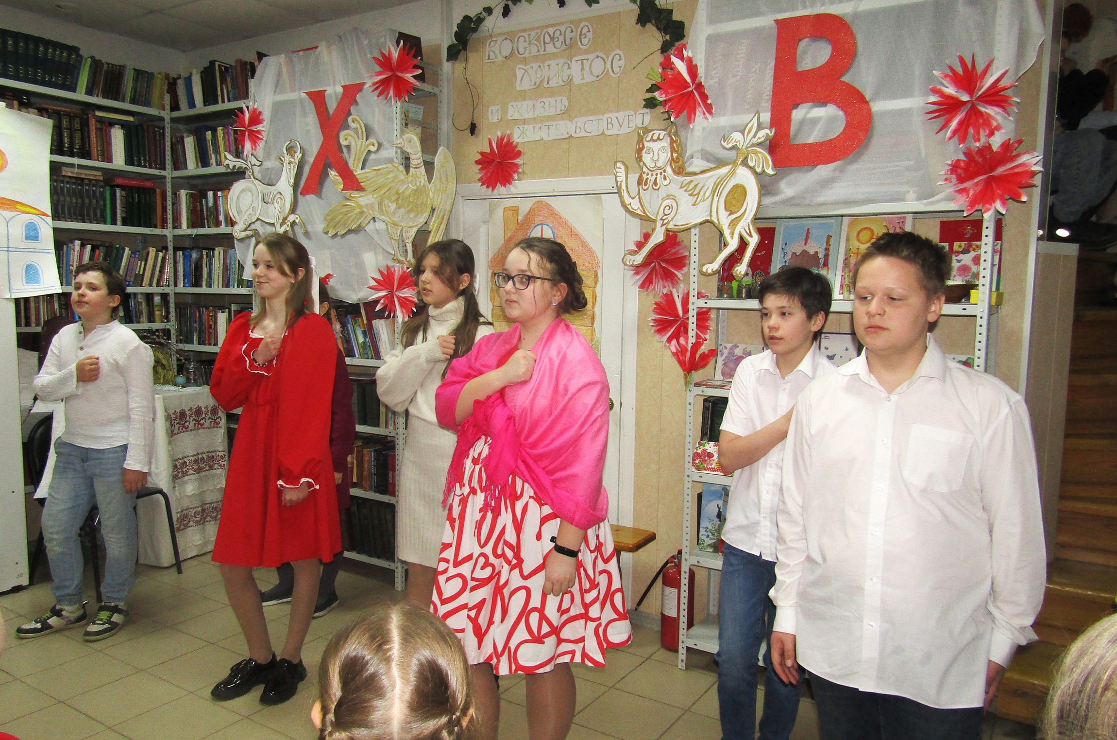 Дружное «Воистину Воскресе!» раздалось в ответ, после чего дети начали свое выступление. В этот день воспитанники воскресной школы исполнили не только традиционные пасхальные песнопения и стихи, но и перепели на праздничный лад известные композиции современных авторов идаже исполнили положенные на музыкувысказывания святых отцов. Младшая группа воскресной школы представила прихожанам сказочную костюмированную постановку, а завершилась праздничная программа исполнением пасхальной песни учащихся и их родителей. После взрослые и дети участвовали в конкурсе на лучший пасхальный плакат и за совместной работой делились впечатлениями от праздника.
