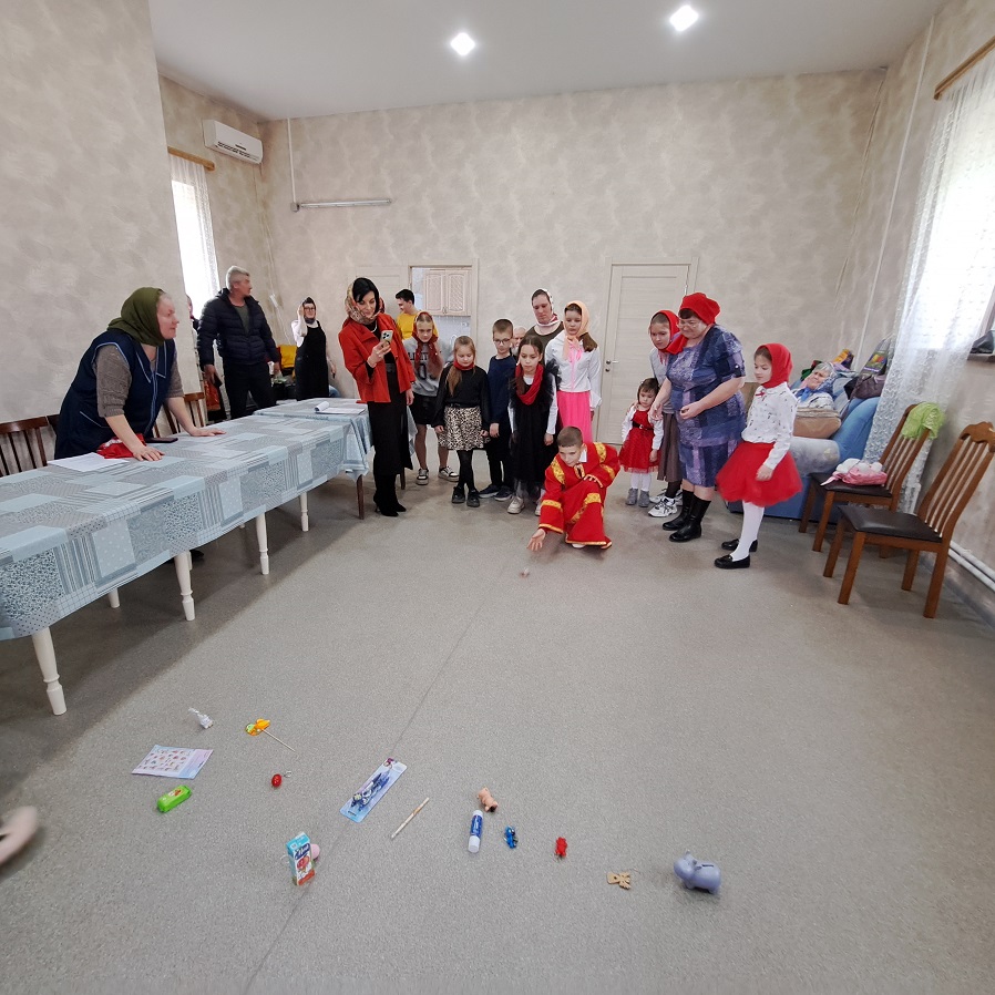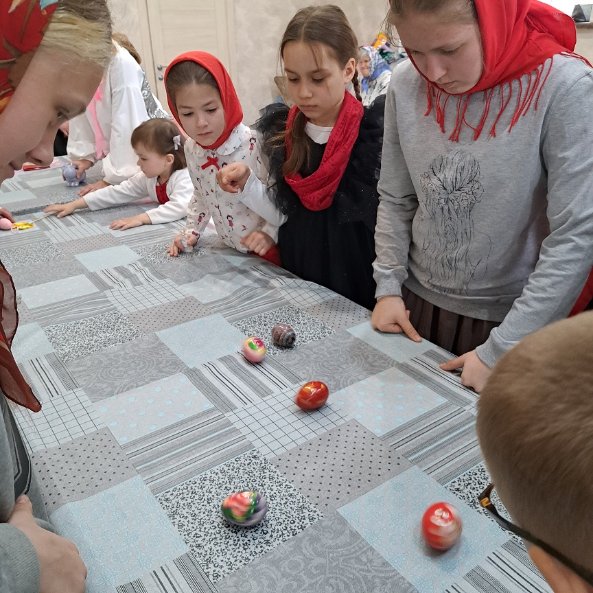 Далее Евгения Михайловна предложила ребятам принять участие в весёлых пасхальных играх: «Волчок», «Сбей приз», «Поспеши взять яйцо», «Укрась пасхальное дерево», за победу в которых дети получили памятные призы и подарки.