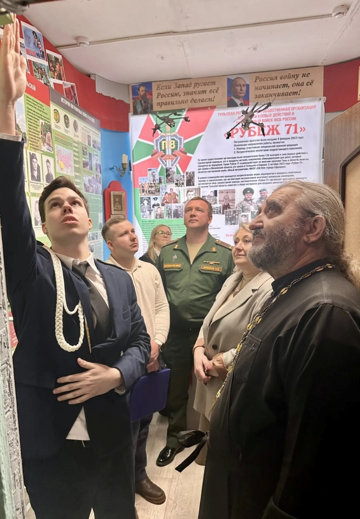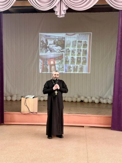 В МКОУ «Средняя школа №9» города Ефремова состоялось патриотическое мероприятие, посвященное Дню защитника Отечества, на которое был приглашен настоятель храма святителя Луки Крымского поселка Восточный иерей Виталий Хлустиков.