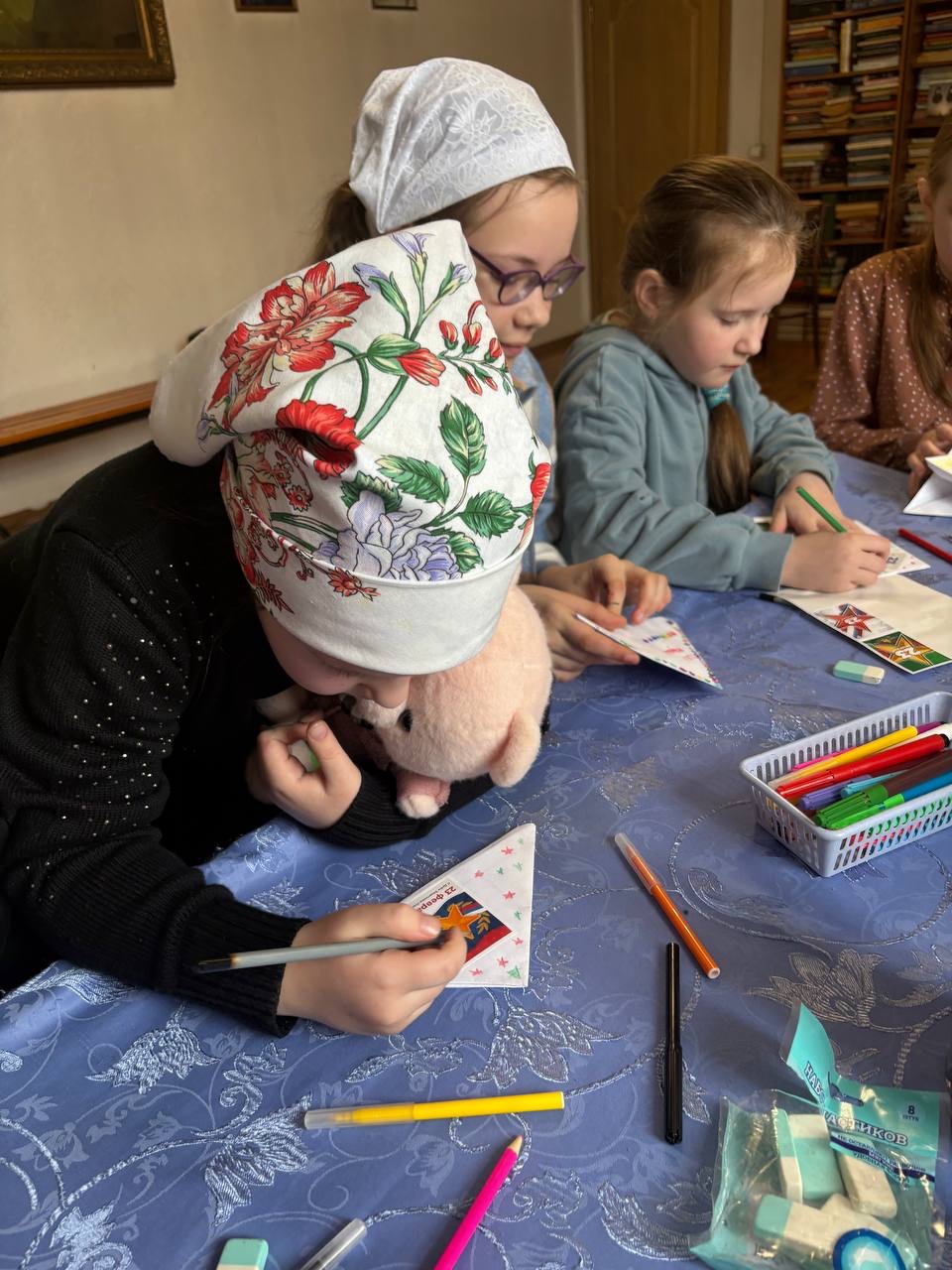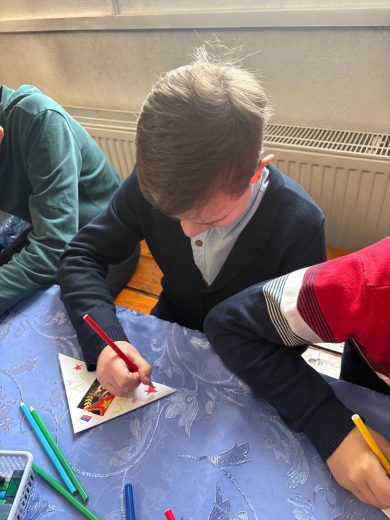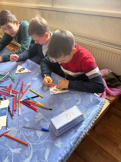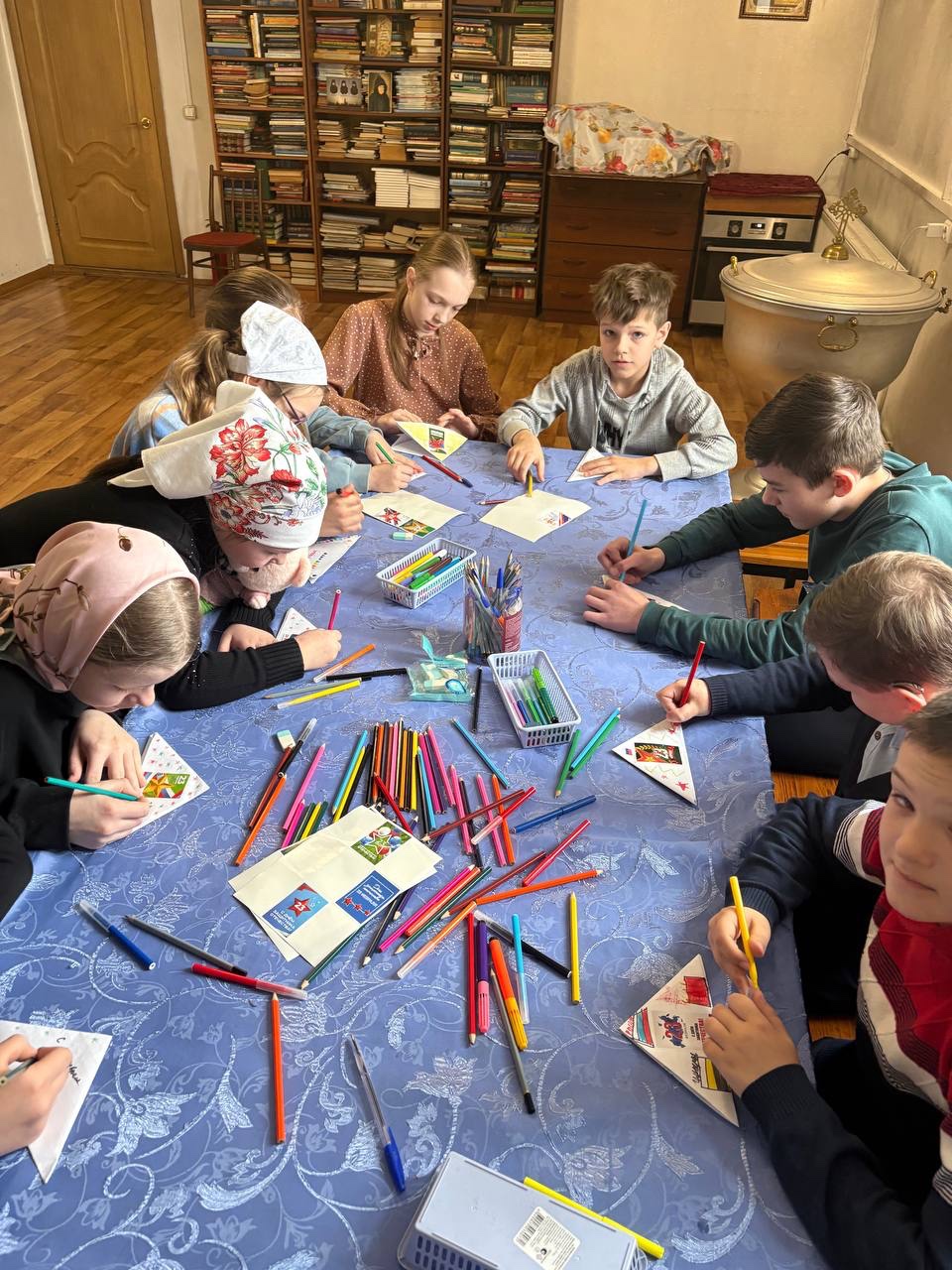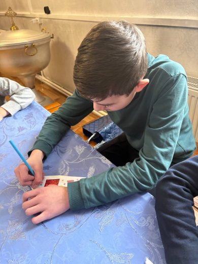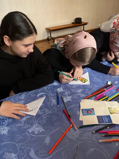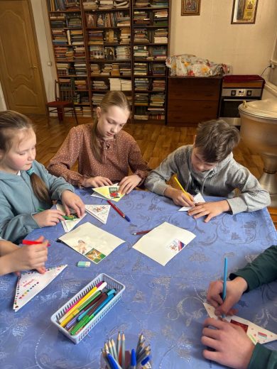 Во второй части занятия воспитанники воскресной школы приступили к написанию поздравительных писем и открыток для военнослужащих, которые находятся в зоне проведения специальной военной операции.