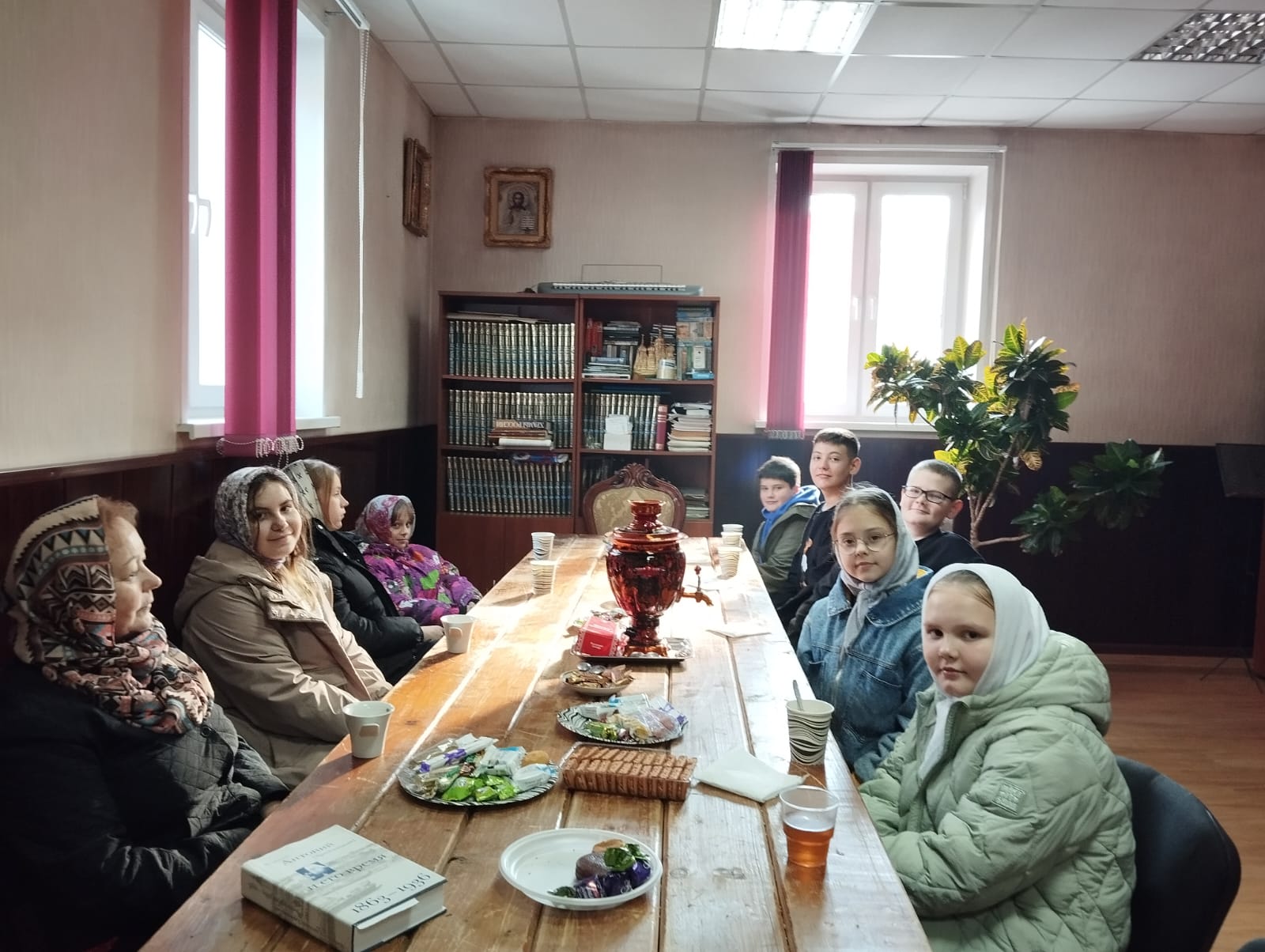 Затем иерей Алексий пригласил школьников на чаепитие в приходскую библиотеку, где общение продолжилось в теплой душевной атмосфере. Ребята смогли задать интересующие их вопросы о вере, правильном отношении к родителям и сложностях общения со сверстниками. Отец Алексий в своих ответах обратил внимание подростков на то, что в разрешении жизненных неурядиц не следует надеяться только на свой разум, но надо помнить о добром влиянии искренней молитвы на разрешение трудных вопросов.