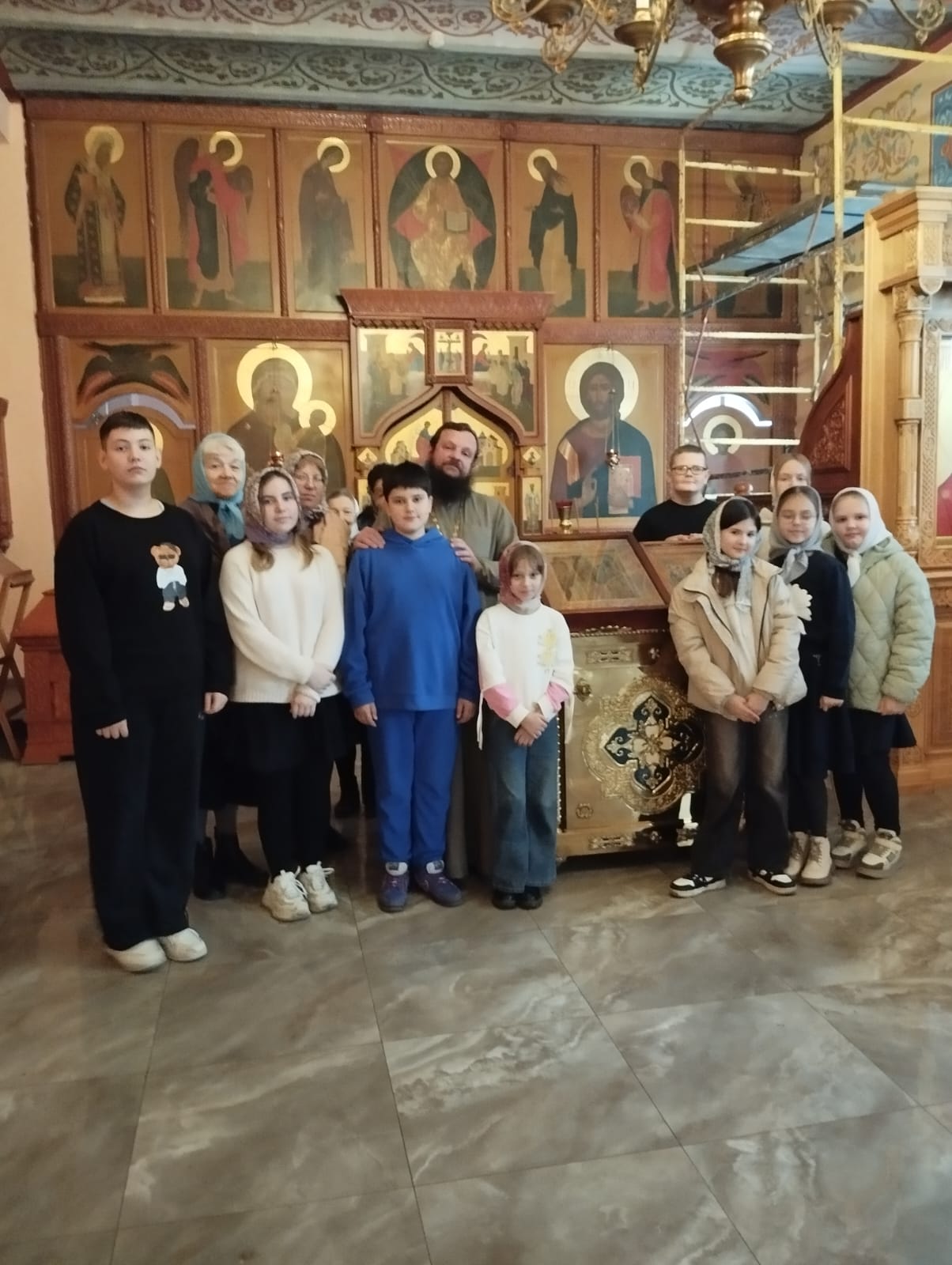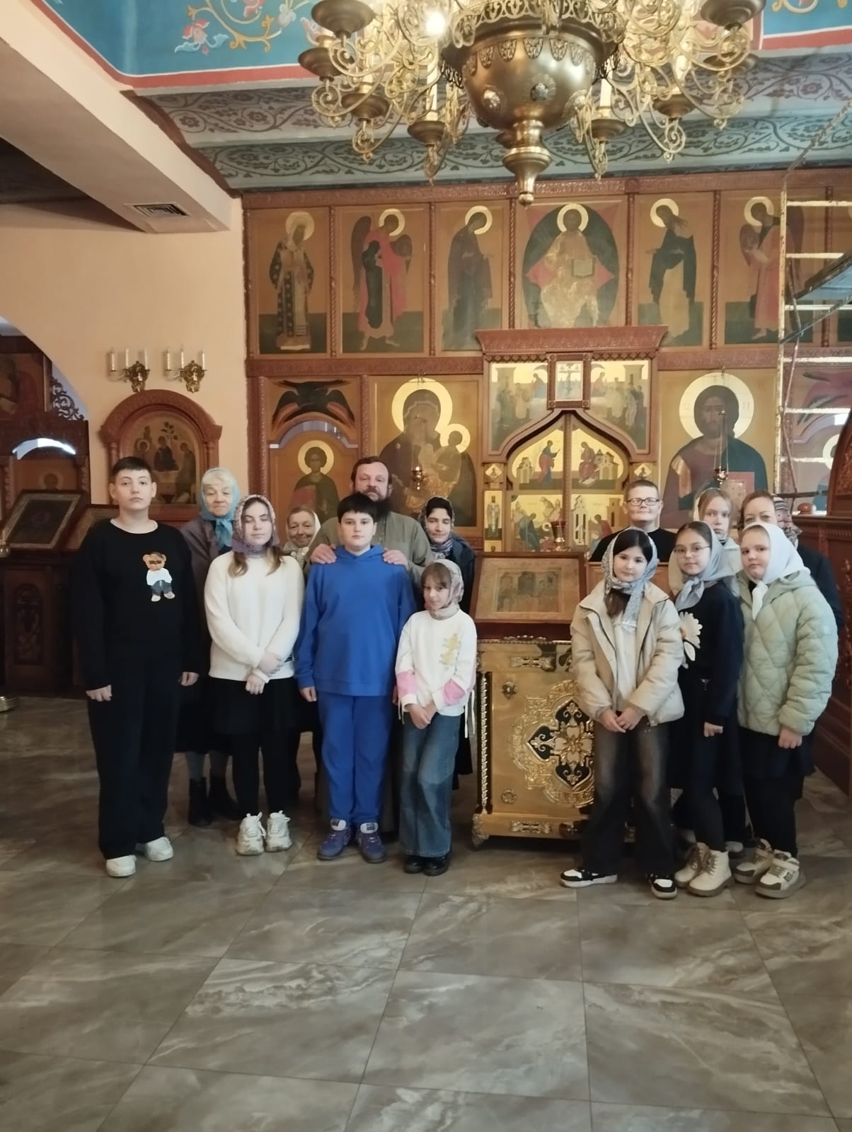 Школьников, пришедших в храм вместе с педагогом Надеждой Николаевной Трошкиной, встретил клирик иерей Алексий Зенин. Священник напомнил ребятам, что они вошли в святое место, где необходимо соблюдать благоговейную тишину, и провел их к иконе Покрова Пресвятой Богородицы.