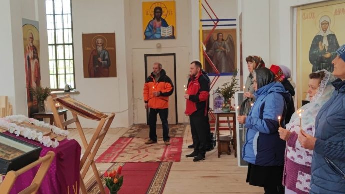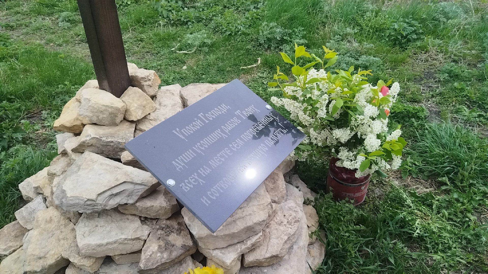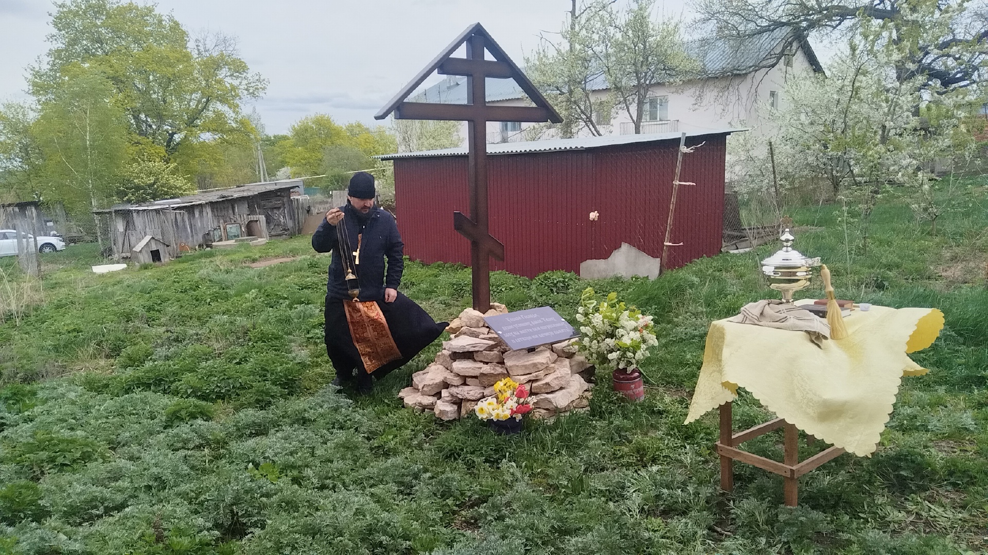 Жители собрались у нового поклонного креста, помолились, положили камни в основание и возложили цветы.
